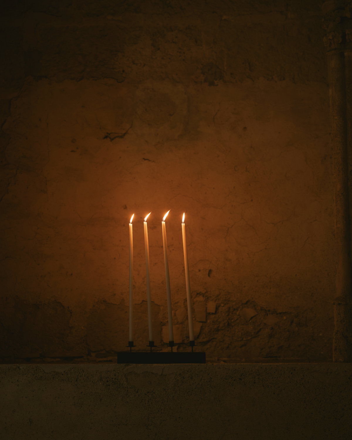 The dinner was, for us, the true climax of the entire celebration—the part we spent the most time preparing, with the goal of making it unforgettable and unlike anything else. A single, uninterrupted 30-meter-long table, draped in crinkled white fabric that we had personally sourced and purchased. Lined with hundreds of candles, each one handmade by a traditional candle-maker in Florence, Italy. Dinner was champagne-only, served in three stages, and concluded with an extraordinary dessert: a one-meter-wide organic blueberry tart, as delicious as it was photogenic. The atmosphere was nothing short of magical. A nearly thousand-year-old cloister lit only by candlelight, and a playlist we had curated together one quiet Sunday afternoon in June.