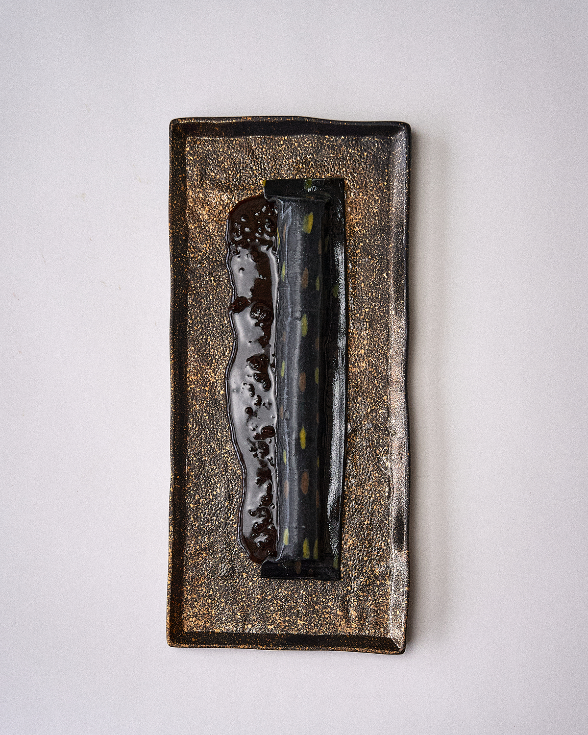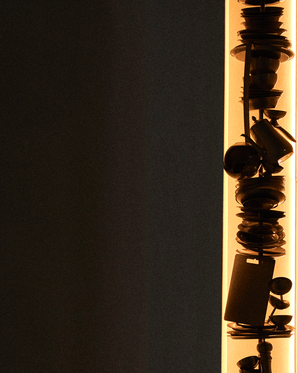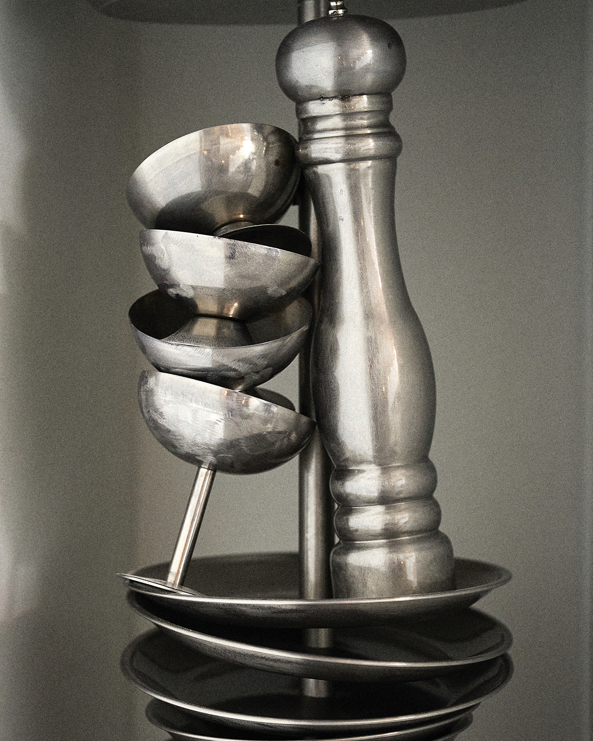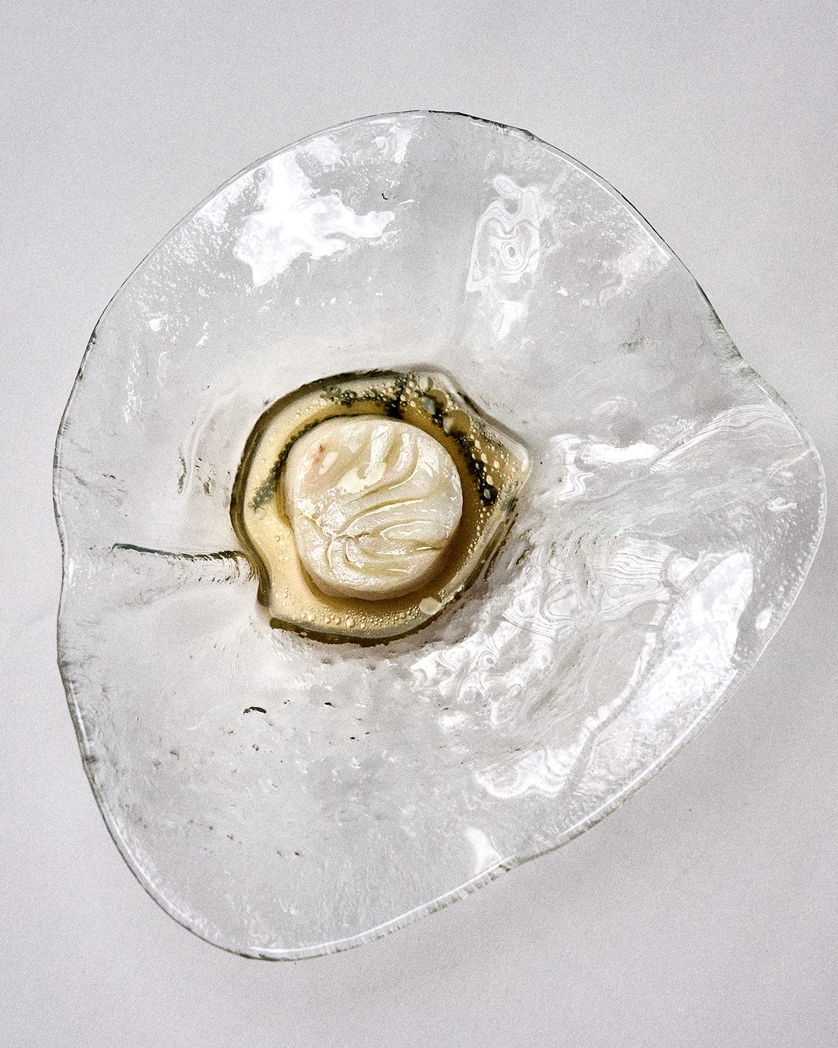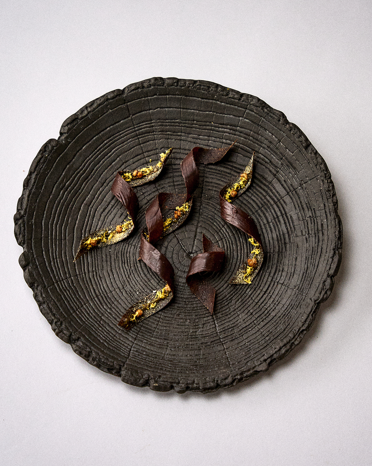 Over seven nights, and with just twenty-two guests each evening, Balbosté invited us to step into a dimly lit, meticulously staged space where every detail awoke the five senses. Plates were created in collaboration with seven artists from around the world, with each dish functioning as both a culinary composition and a sculptural work. Textures, flavors, and ingredients materialized in physical form: hammered metalwork captured the dish’s structure and textures, a fluid water insatallation mirrored an entrée that was fresh, light, and filled with movement, and carved wood grounded the evening with depth and earthy warmth.