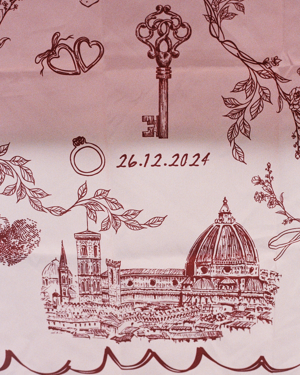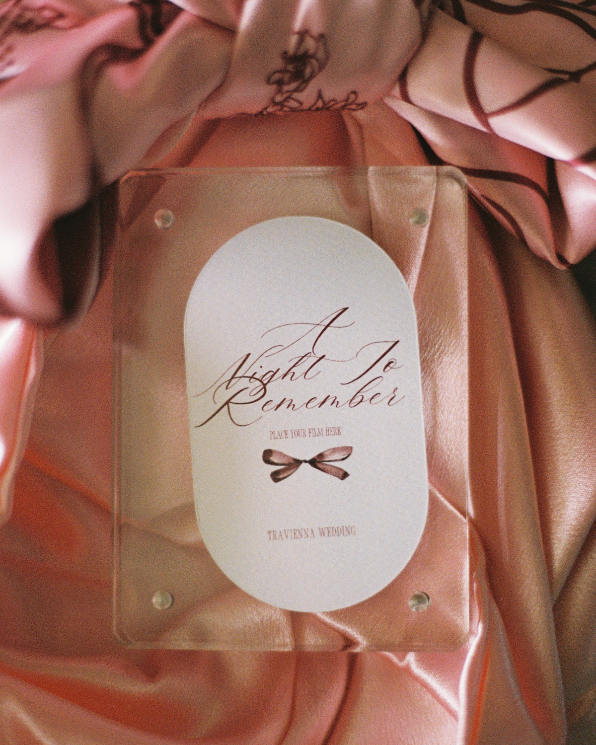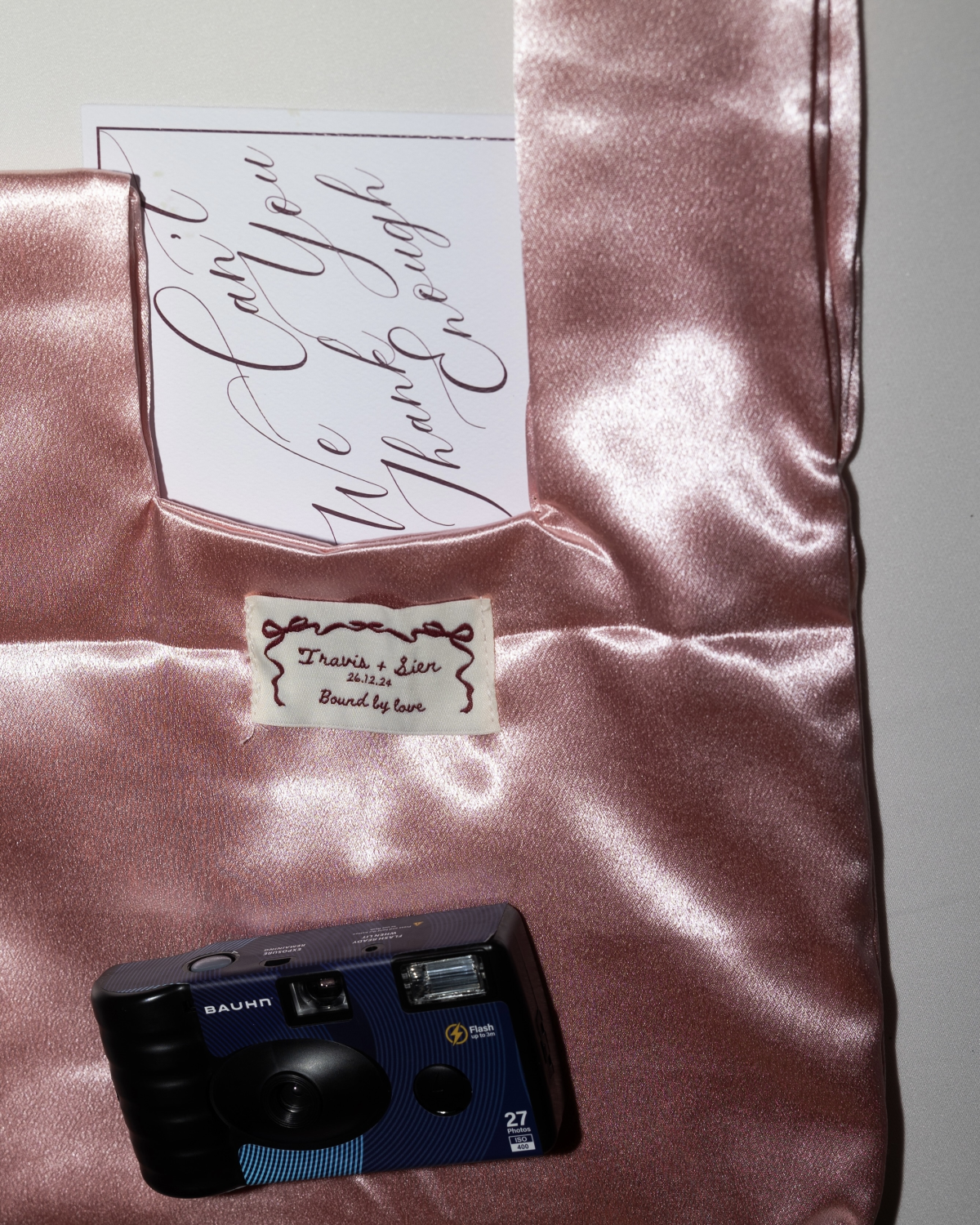 We had custom silk scarves designed with elements meaningful to us, which were gifted to our guests and placed on their seats. They used them for the welcome twirls as we entered the reception. We also provided interactive acrylic photo frames—guests took Polaroid pictures at the welcome area and placed them into the frames as keepsakes. My dresses featured qipao-inspired fastenings (盘扣) and subtle nods to traditional craftsmanship and my Chinese heritage.