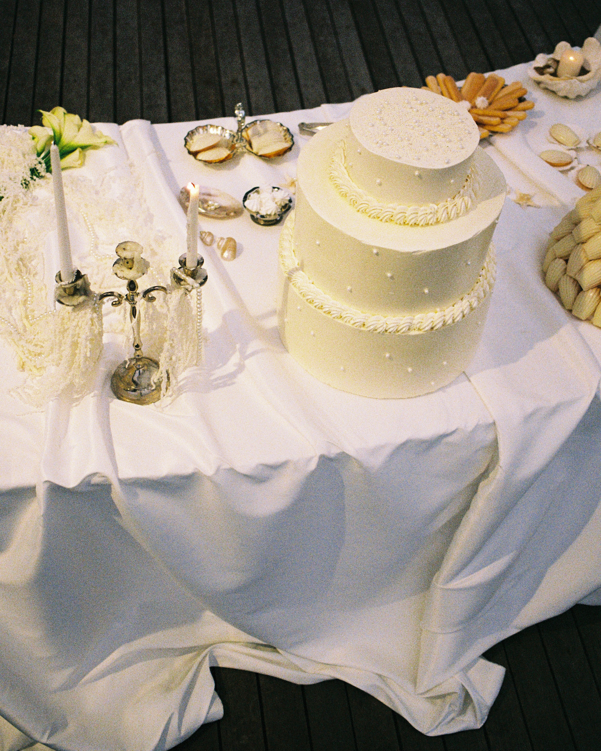 My reception dress was a custom gown made from over 200 meters of silk tulle. It featured cut-outs creating a skin-tone illusion and a qipao-inspired fastening (盘扣). Designed to be light and floaty, it was inspired by the movement of the ocean, with hand-pleated details. For the welcome drink, I wore a linen mini dress adorned with seashell pebble appliqués for a natural, coastal look. Jacque, our daughter, wore blue satin ballet flats and blue ribbons. She was wearing my "something blue."