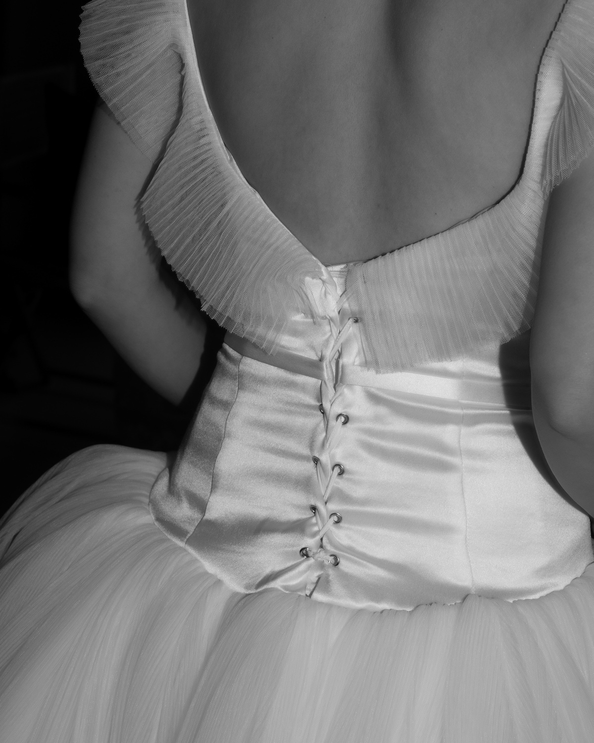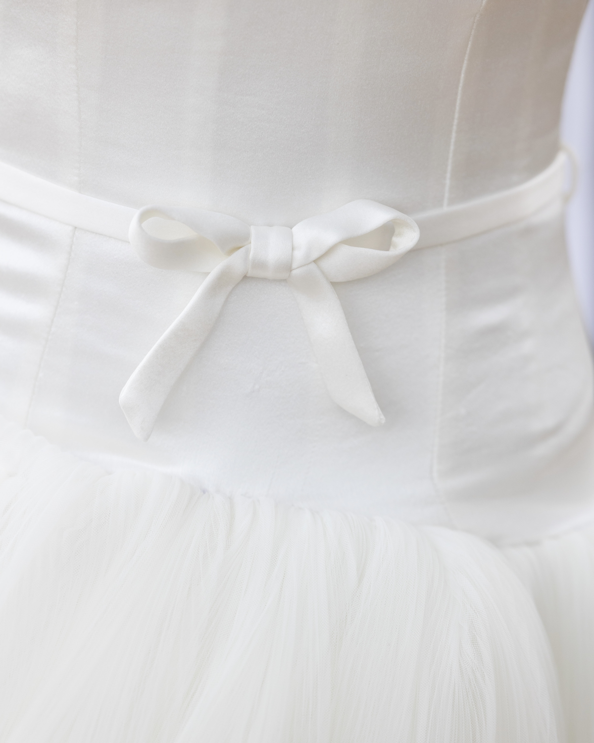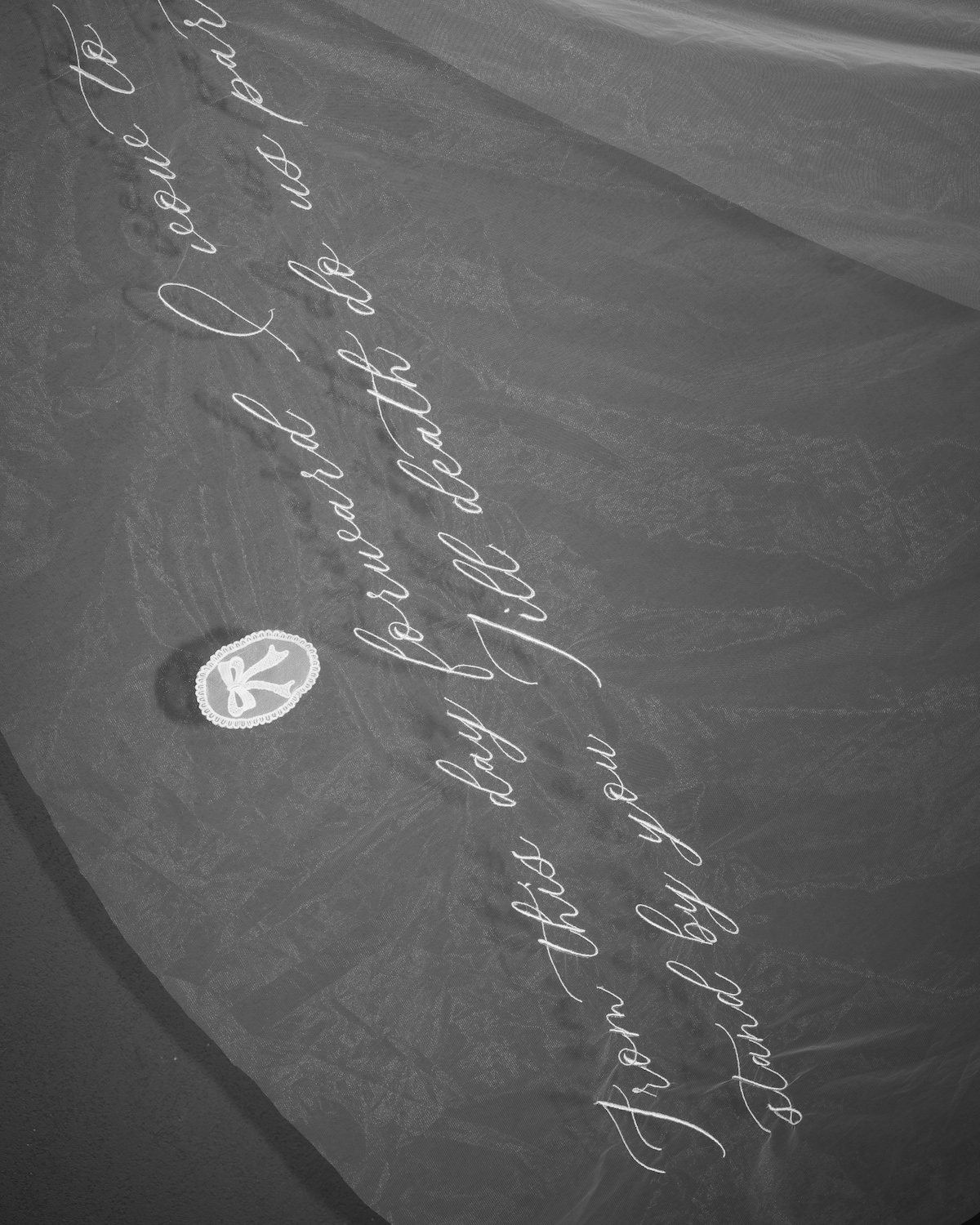 The wedding dress was inspired by ballet dancers, featuring whimsical tulle pleats and a dropped waist with a dainty bow belt across my waist. The special touch was my veil, which had pink embroidery, with part of my vow sewn onto it: "My soul has found its home within yours," placed across the side of my face, and on the back, it read: "From this day forward, I vow to stand by you, till death do us part." It felt so special.