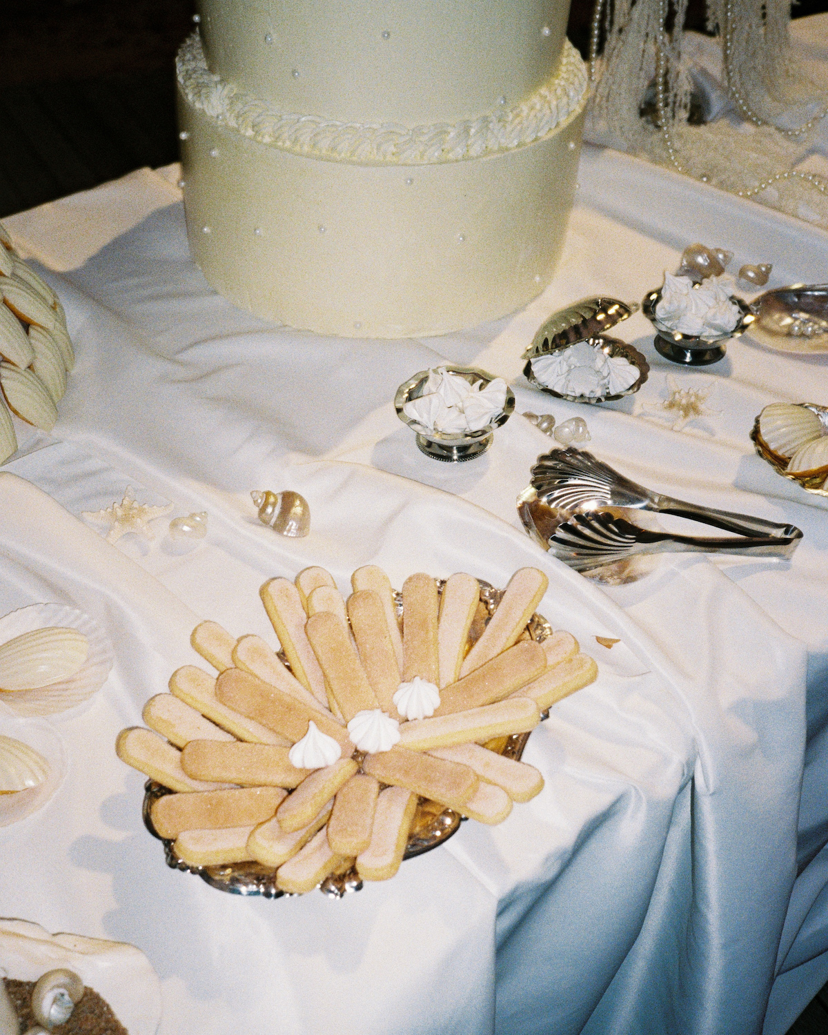 A special part of our celebration was having all 40 guests seated at one giant round table, symbolizing 团圆 (reunion), a cherished value in Chinese culture. The tablescape featured marine-inspired details, madeleine croquembouche, and meringues. We also played a 1-minute flashback video of our 16-year journey, projected onto drapes—a nostalgic and emotional moment shared with those who have influenced our lives.