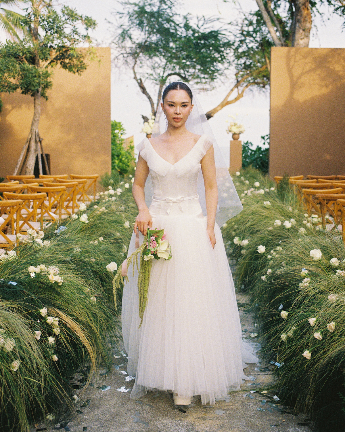 In the tranquil coastal town of Hua Hin, Thailand, Australian bridal designer Mia Ateliers wove a wedding where heritage, nature, and artistry converged in perfect harmony. Against the shimmering ocean, Mia blended her Chinese roots with contemporary elegance—spilling lush grasses and cascading drapery framed an intimate ceremony, while a dessert table of madeleine croquembouche and delicate shell meringues became a tableau of edible poetry. Every detail, from the floral arrangements to the flowing fabrics, felt like a brushstroke on a living canvas. Mia herself embodied movement and grace in two custom gowns from her namesake label, each an ode to ballet’s fluidity with whisper-soft tulle, romantic drop-waists and intricate, unexpected details. As the evening drew to a close, the couple’s last dance unfolded beneath a night sky illuminated by chandeliers and fireworks—a dazzling finale to a celebration as timeless as the tide