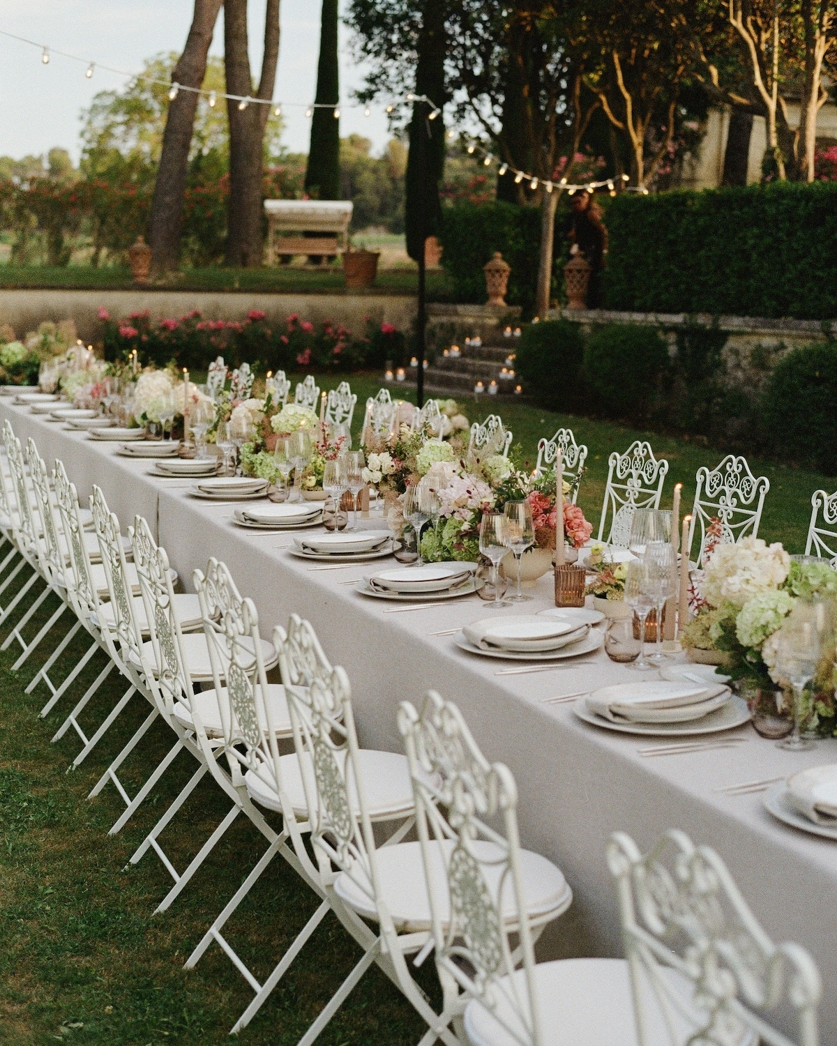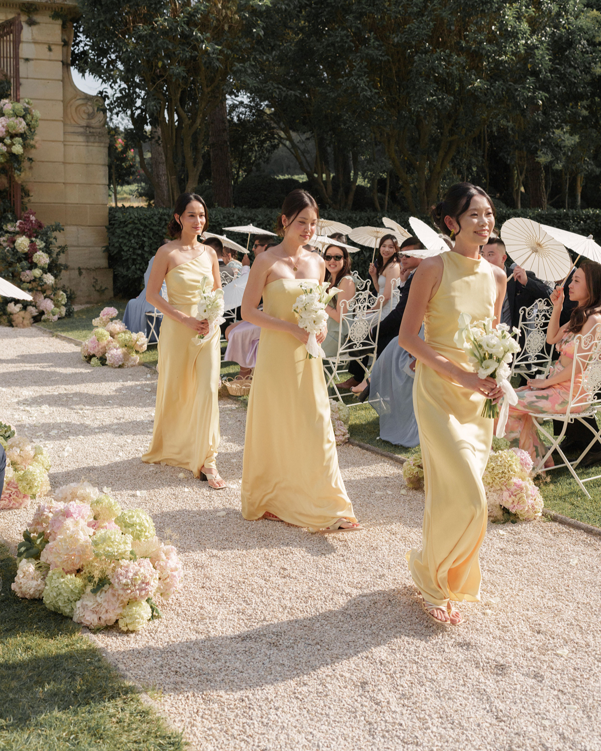Our ceremony took place in the gardens of Château Talaud, surrounded by vineyards and the most beautiful Provençal light. I wanted it to feel soft and romantic — peaceful, but full of emotion. We included thoughtful details, like sun umbrellas for the ceremony — practical under the sun, but also beautiful in the photos. Small touches like that helped everything feel cohesive, elegant, and very us. The simplicity of the setup allowed the natural beauty of the location to shine through, which is ultimately what made it feel so timeless.