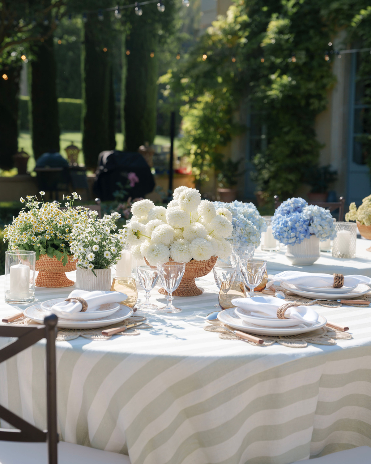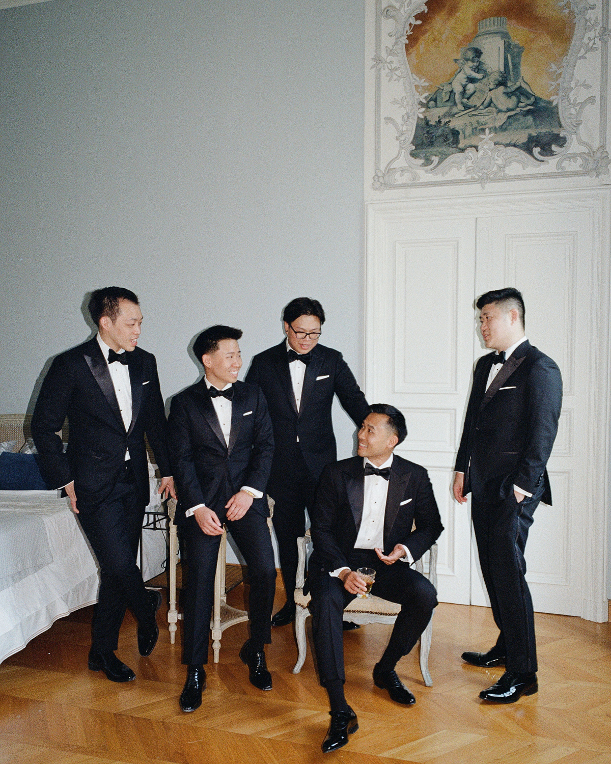 Our wedding weekend began with a dreamy welcome party at the Château. The setting felt like a fairytale — soft yet crisp colors, white and blue hydrangeas, and garden-inspired details that quietly echoed the Ralph Lauren aesthetic I had always loved. It struck that balance of refinement and ease, setting the tone for everything that followed. We began the evening with a Chinese tea ceremony to honor our families, a moment that felt grounding and deeply personal. From there, we moved into a relaxed garden dinner with our closest friends and family. It was the perfect way to begin the weekend — thoughtful, understated, and a reflection of both where we came from and what we envisioned for the days ahead.