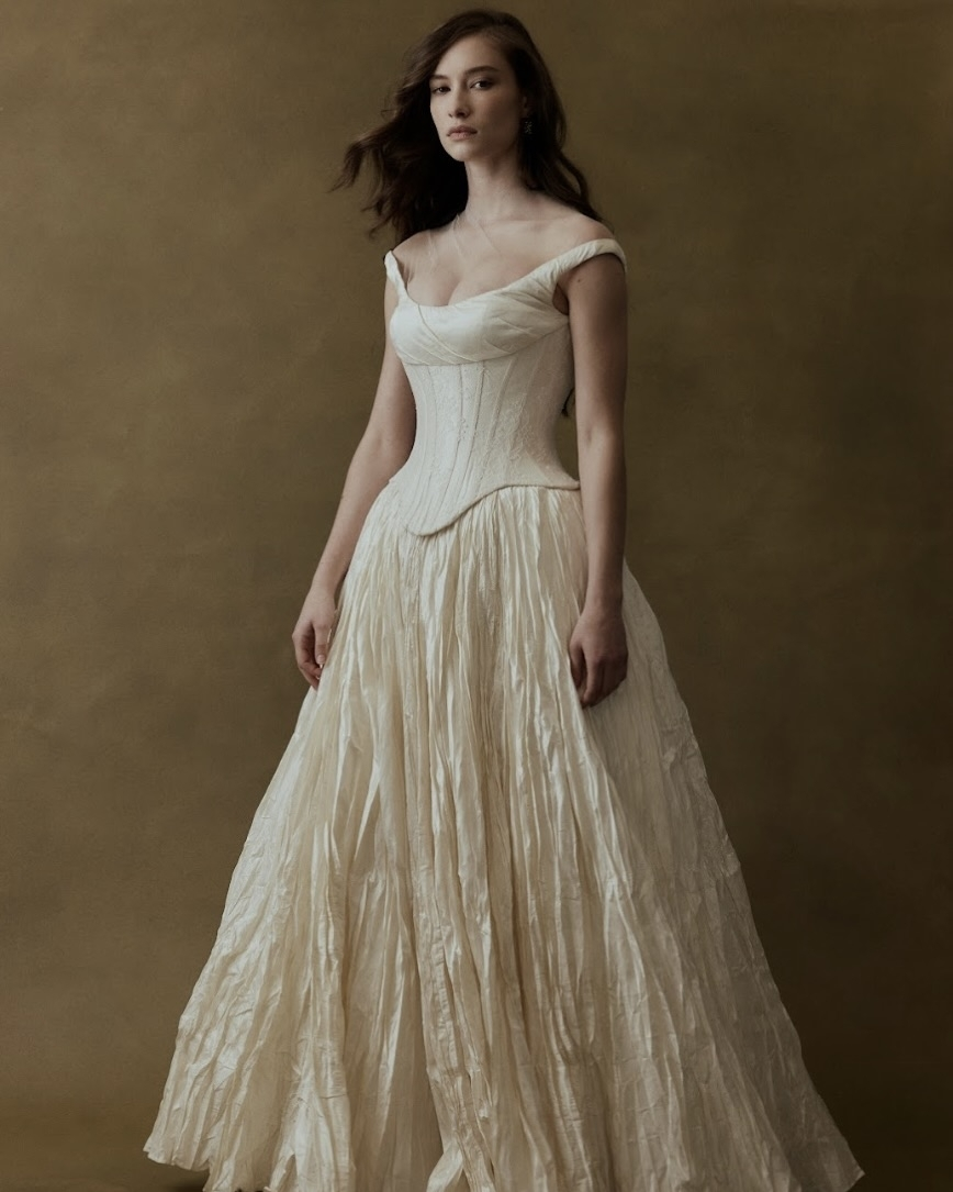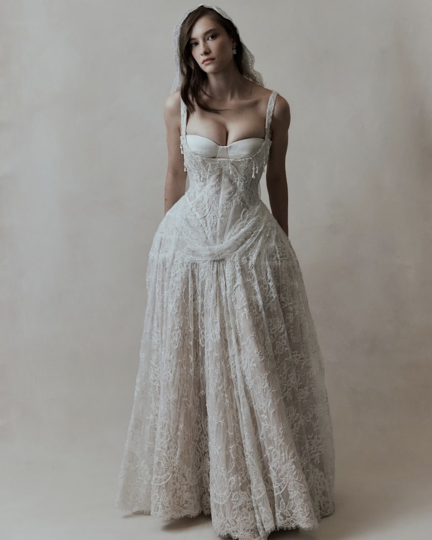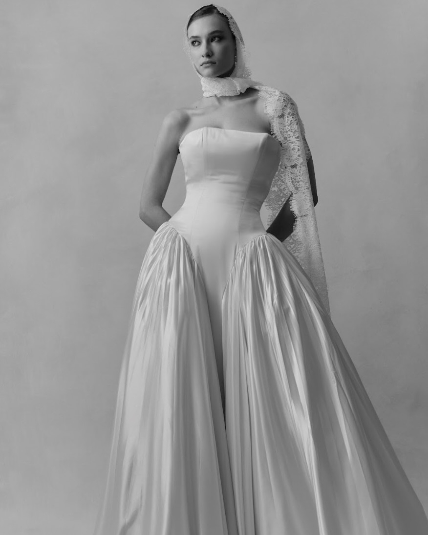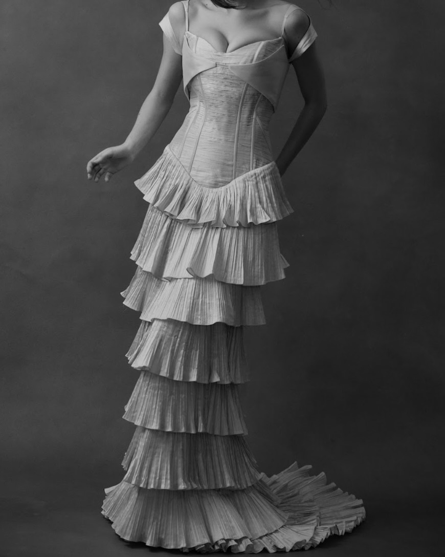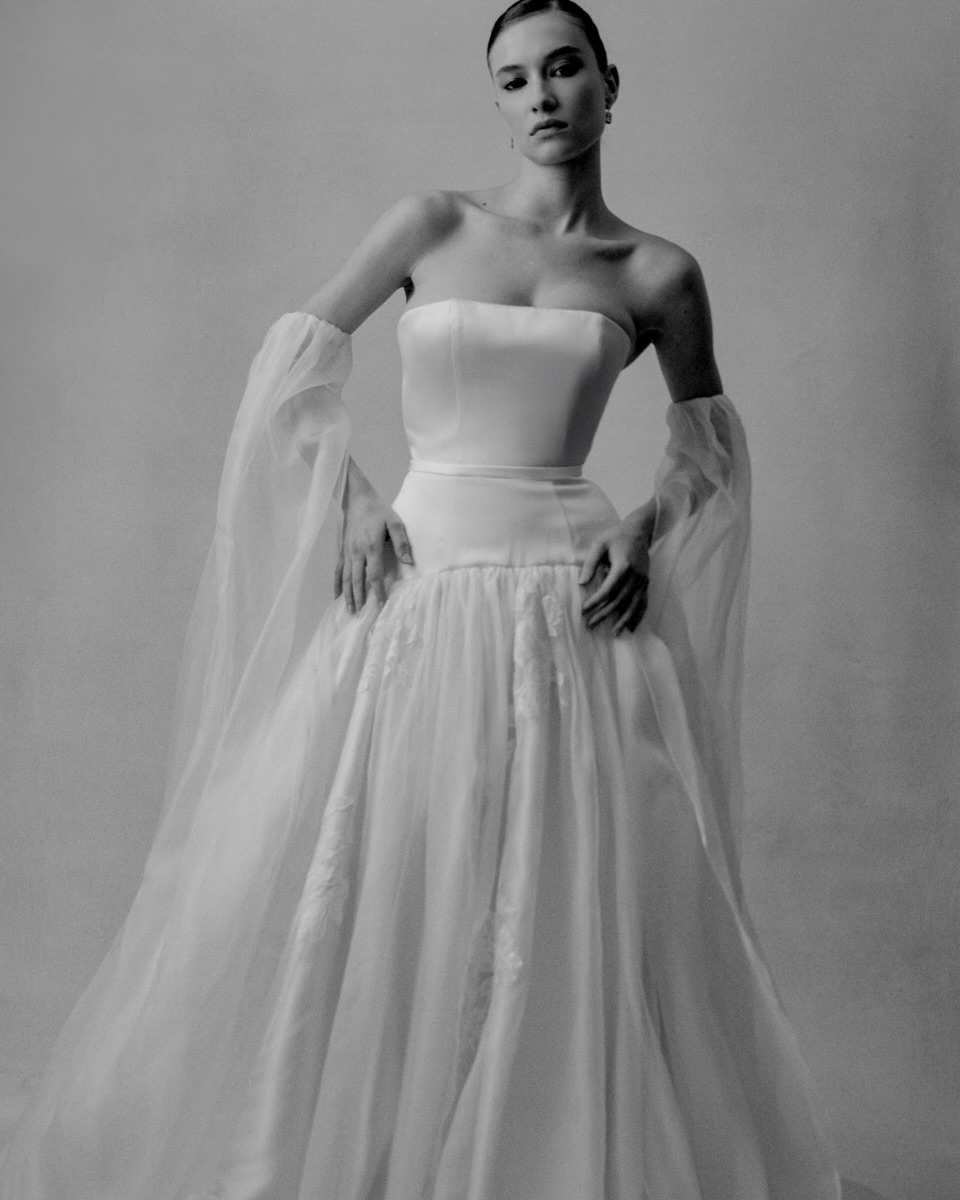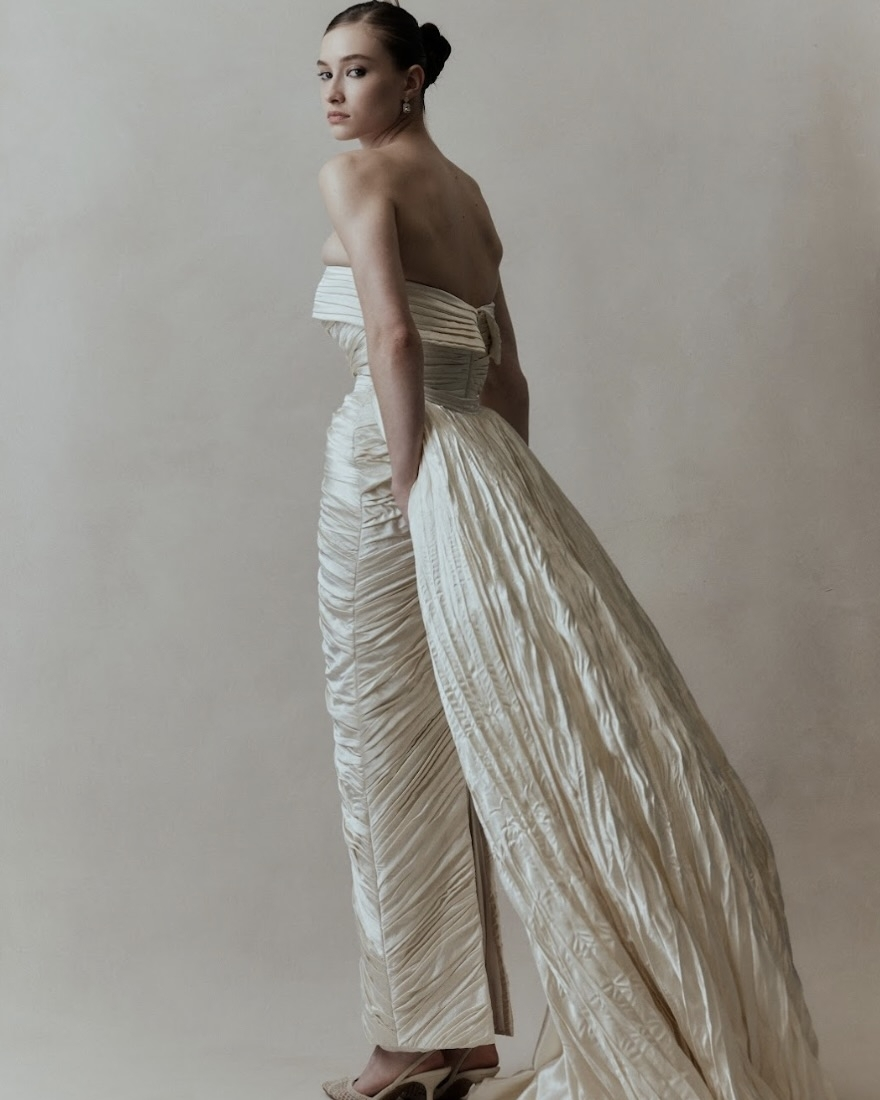 Silhouettes explore the nuance of movement and memory. A soft Basque waist recurs throughout, shaping the body with delicate precision, while micro pleats and fluid drapery evoke the effortless grace of bygone eras. The Atlas gown redefines modern romance – a two-piece ensemble adorned with floral appliqué and hand-beaded dangle pearls, merging fluidity with ornament. Gigi reimagines the Rococo spirit in a collapsed ball gown, lavishly hand-beaded and layered with twin veils of Chantilly lace, whispering stories of opulence and nostalgia. May, ethereal and transformative, features a detachable overskirt framed with floral appliqué detailing at the waist – a study in versatility and grace. And Billie, with its majestic column skirt and soft Basque waistline, is defined by a symphony of knife-pleated frills, balancing structure with fluid femininity.