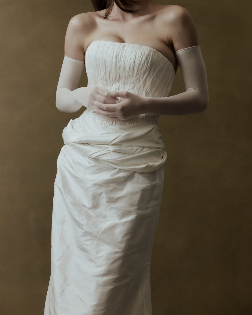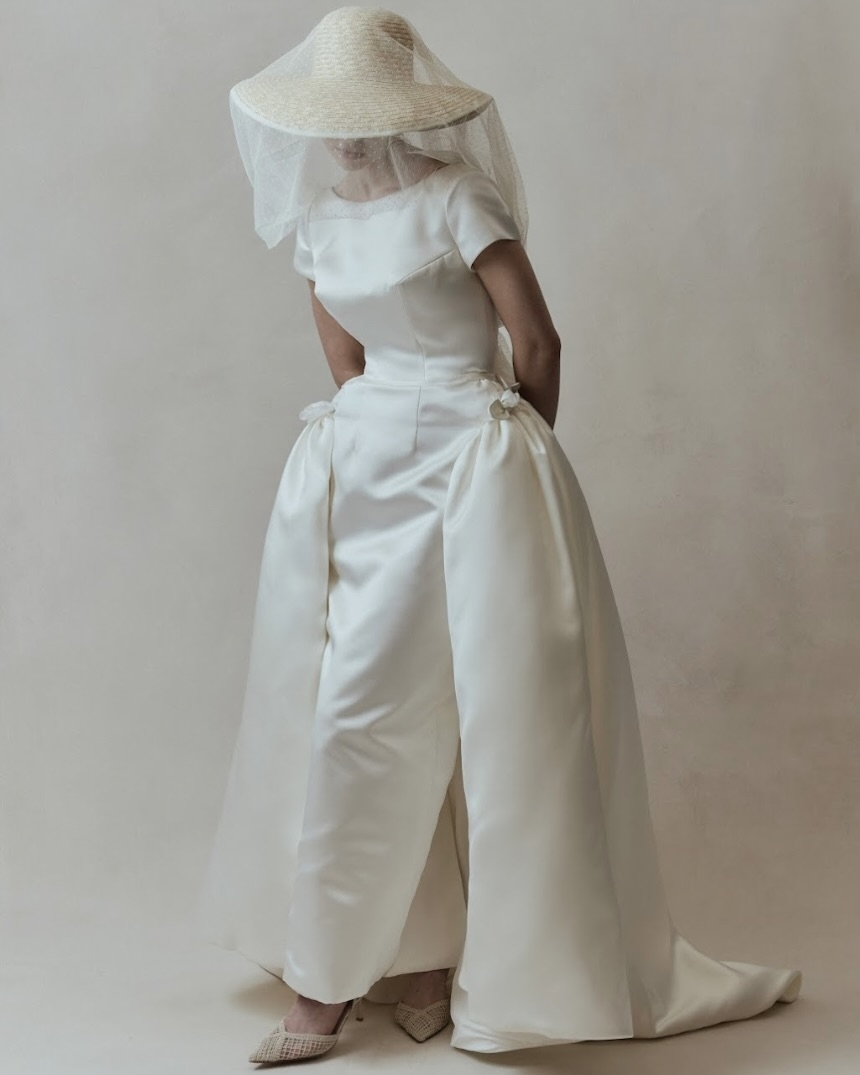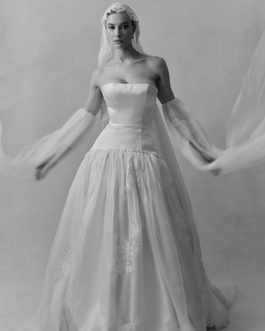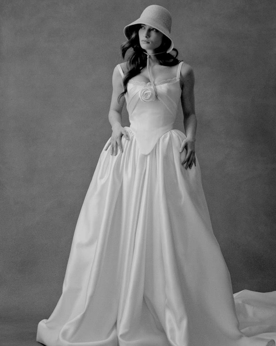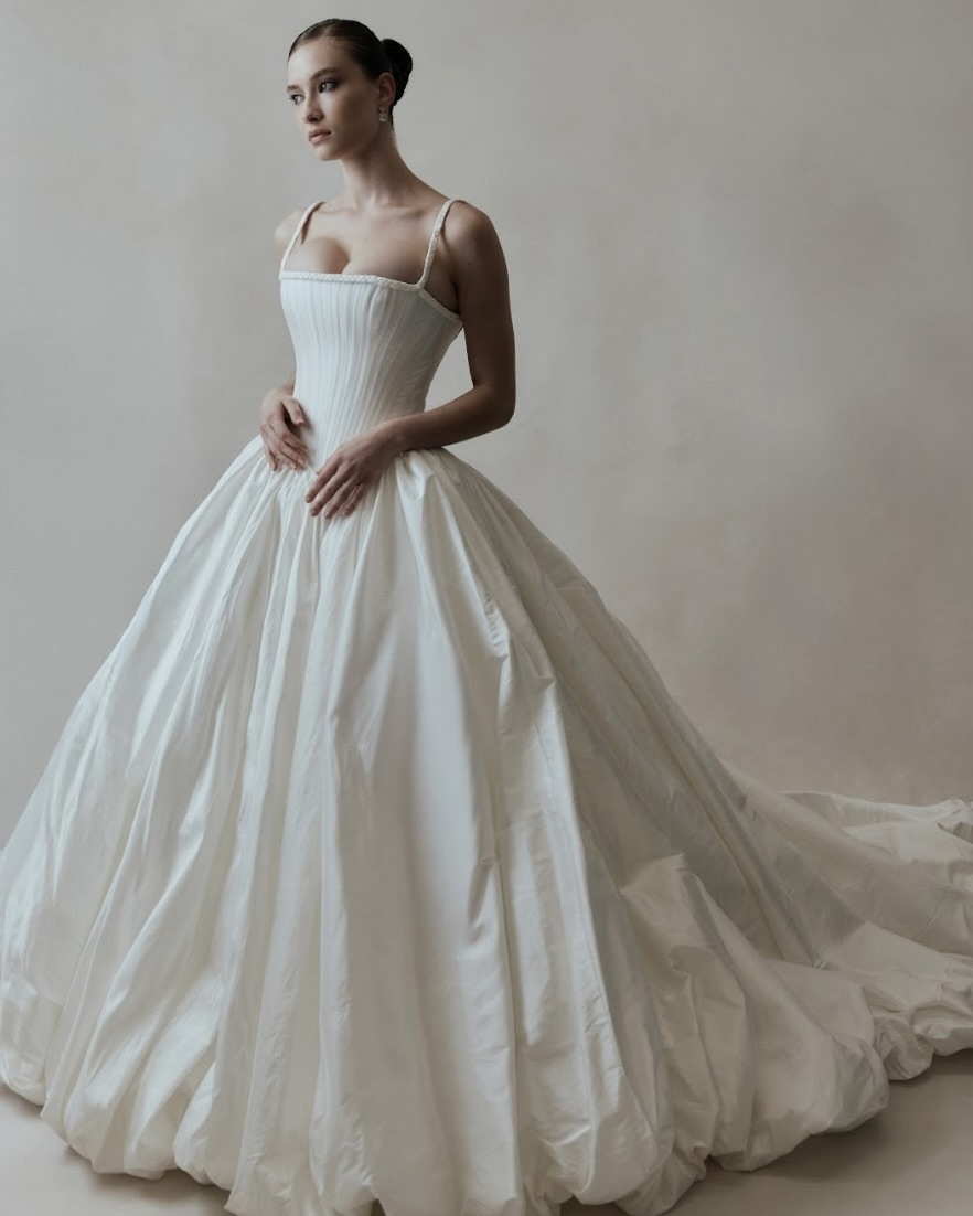 Silhouettes explore the nuance of movement and memory. A soft Basque waist recurs throughout, shaping the body with delicate precision, while micro pleats and fluid drapery evoke the effortless grace of bygone eras. The Atlas gown redefines modern romance – a two-piece ensemble adorned with floral appliqué and hand-beaded dangle pearls, merging fluidity with ornament. Gigi reimagines the Rococo spirit in a collapsed ball gown, lavishly hand-beaded and layered with twin veils of Chantilly lace, whispering stories of opulence and nostalgia. May, ethereal and transformative, features a detachable overskirt framed with floral appliqué detailing at the waist – a study in versatility and grace. And Billie, with its majestic column skirt and soft Basque waistline, is defined by a symphony of knife-pleated frills, balancing structure with fluid femininity.