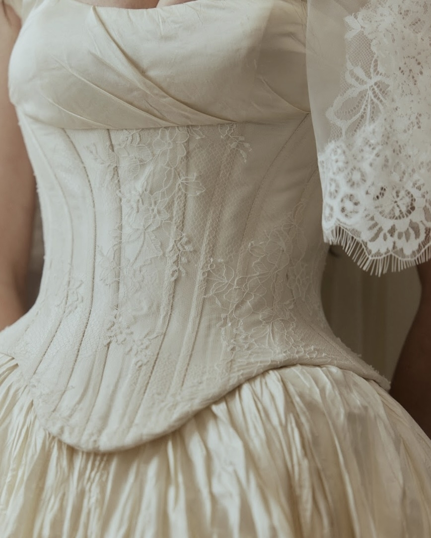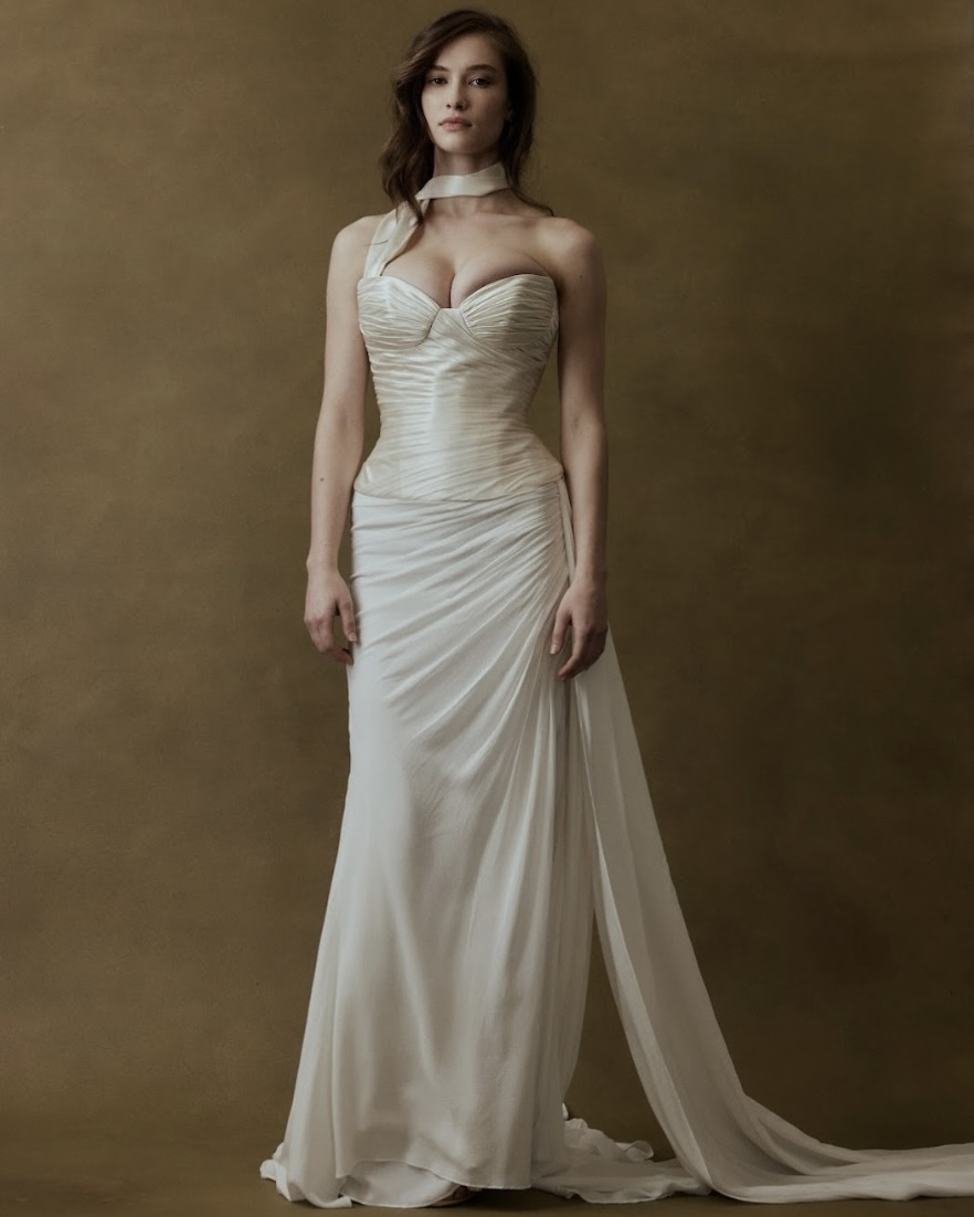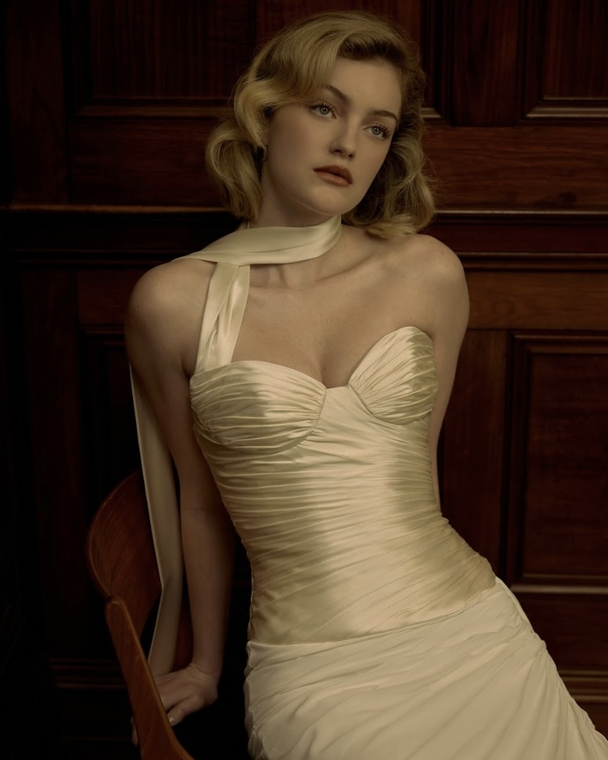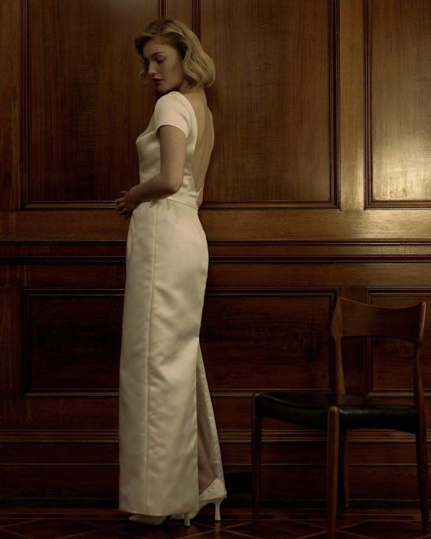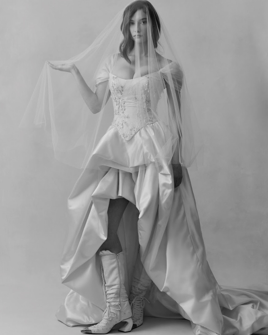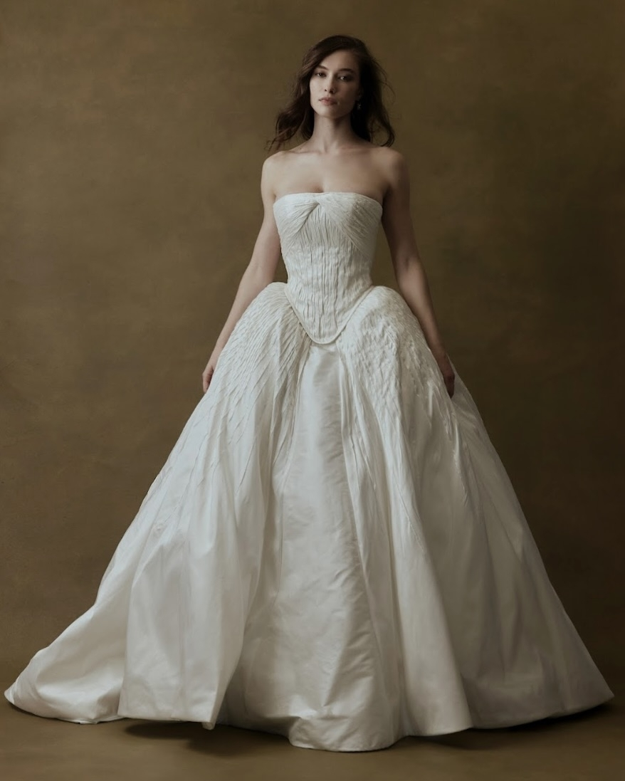 Silhouettes explore the nuance of movement and memory. A soft Basque waist recurs throughout, shaping the body with delicate precision, while micro pleats and fluid drapery evoke the effortless grace of bygone eras. The Atlas gown redefines modern romance – a two-piece ensemble adorned with floral appliqué and hand-beaded dangle pearls, merging fluidity with ornament. Gigi reimagines the Rococo spirit in a collapsed ball gown, lavishly hand-beaded and layered with twin veils of Chantilly lace, whispering stories of opulence and nostalgia. May, ethereal and transformative, features a detachable overskirt framed with floral appliqué detailing at the waist – a study in versatility and grace. And Billie, with its majestic column skirt and soft Basque waistline, is defined by a symphony of knife-pleated frills, balancing structure with fluid femininity.