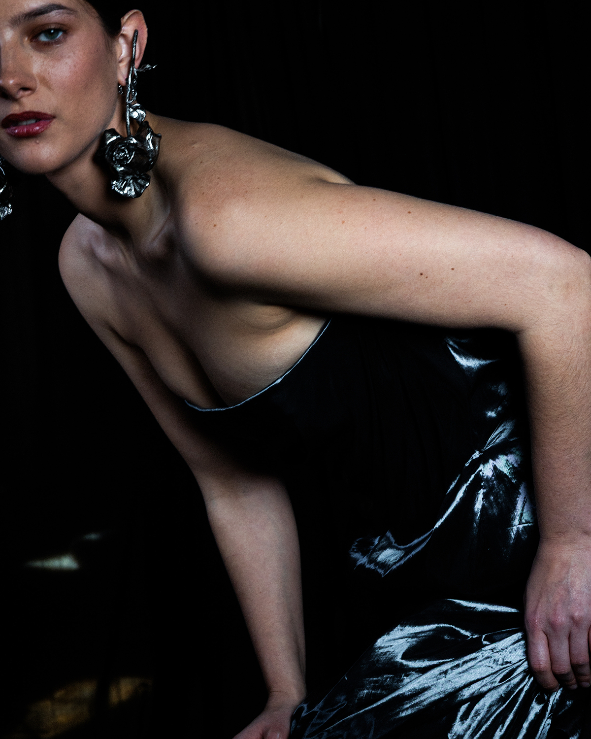 Sparked by a single wilted rose, designer Sarah Varca then photocopied it and manipulated it into a print and the delicate, crumpled flower became the heartbeat of My Metal Garden. The motif appears throughout the collection, anchoring the dreamy silhouettes with an edge of decay and transformation. The pieces also highlight the feminine silhouette with dreamy laces, sculptural corsetry, and textured draping that winds its way through the entire collection.