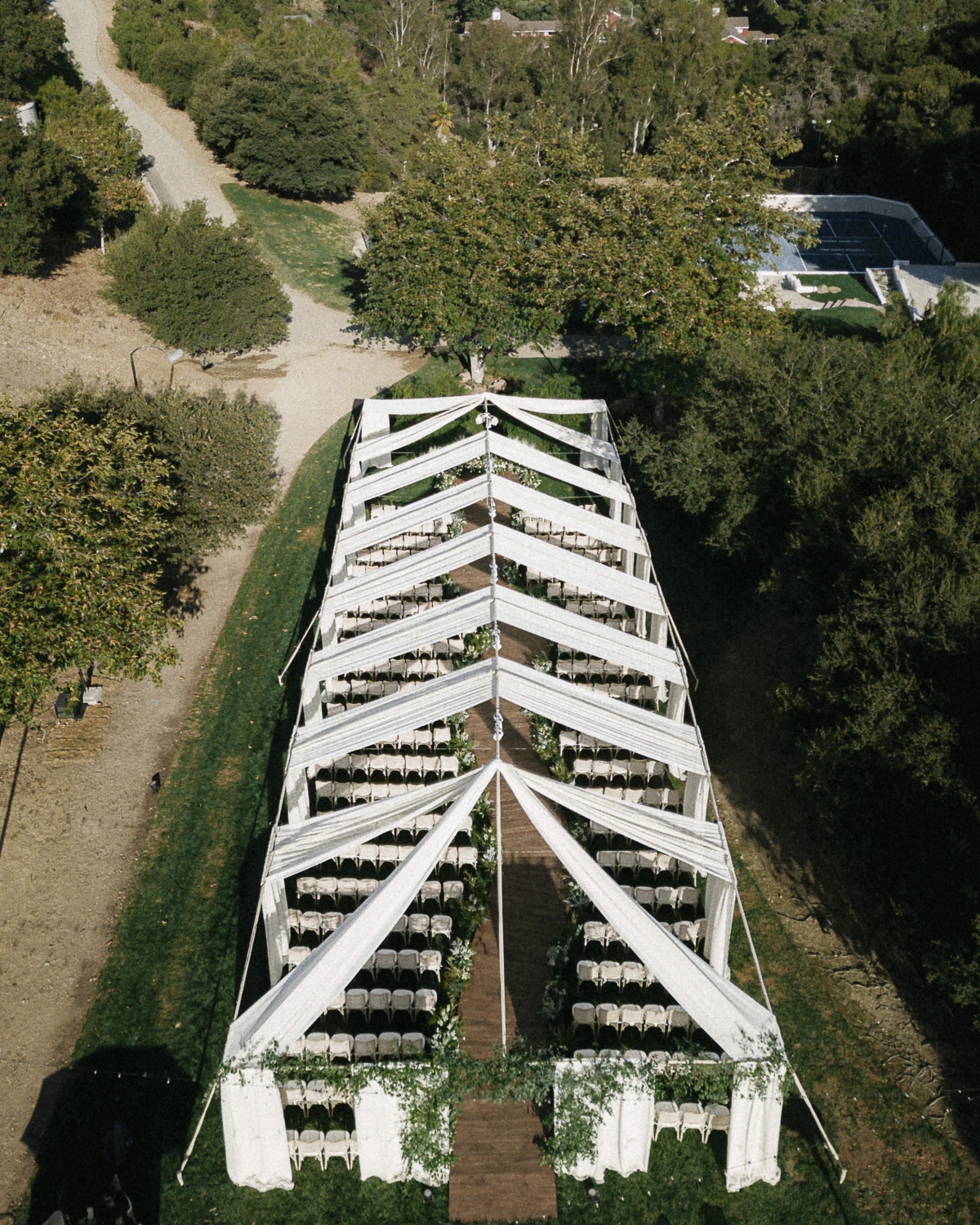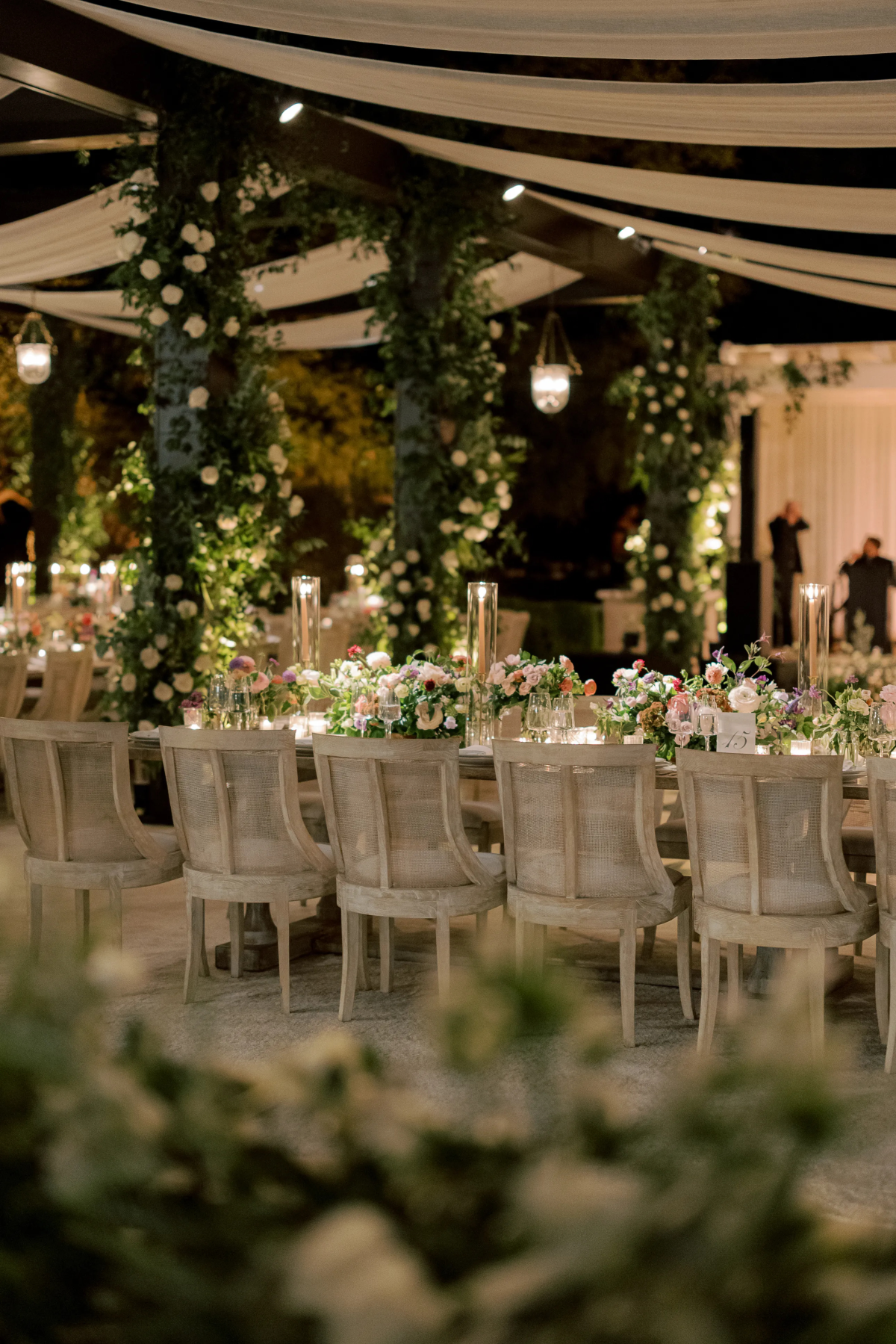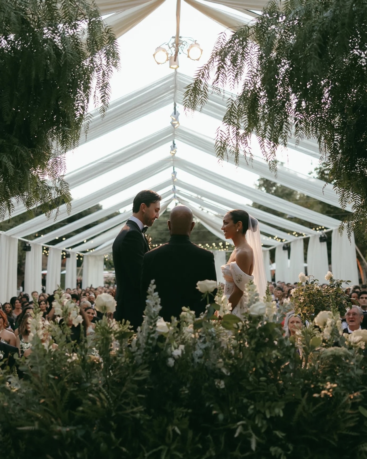 The emotional outdoor ceremony took place under a beautifully draped tent, adorned with classic white and green floral arrangements. The wedding, attended by close friends and family, was a perfect blend of Hollywood glamor and personal touches.