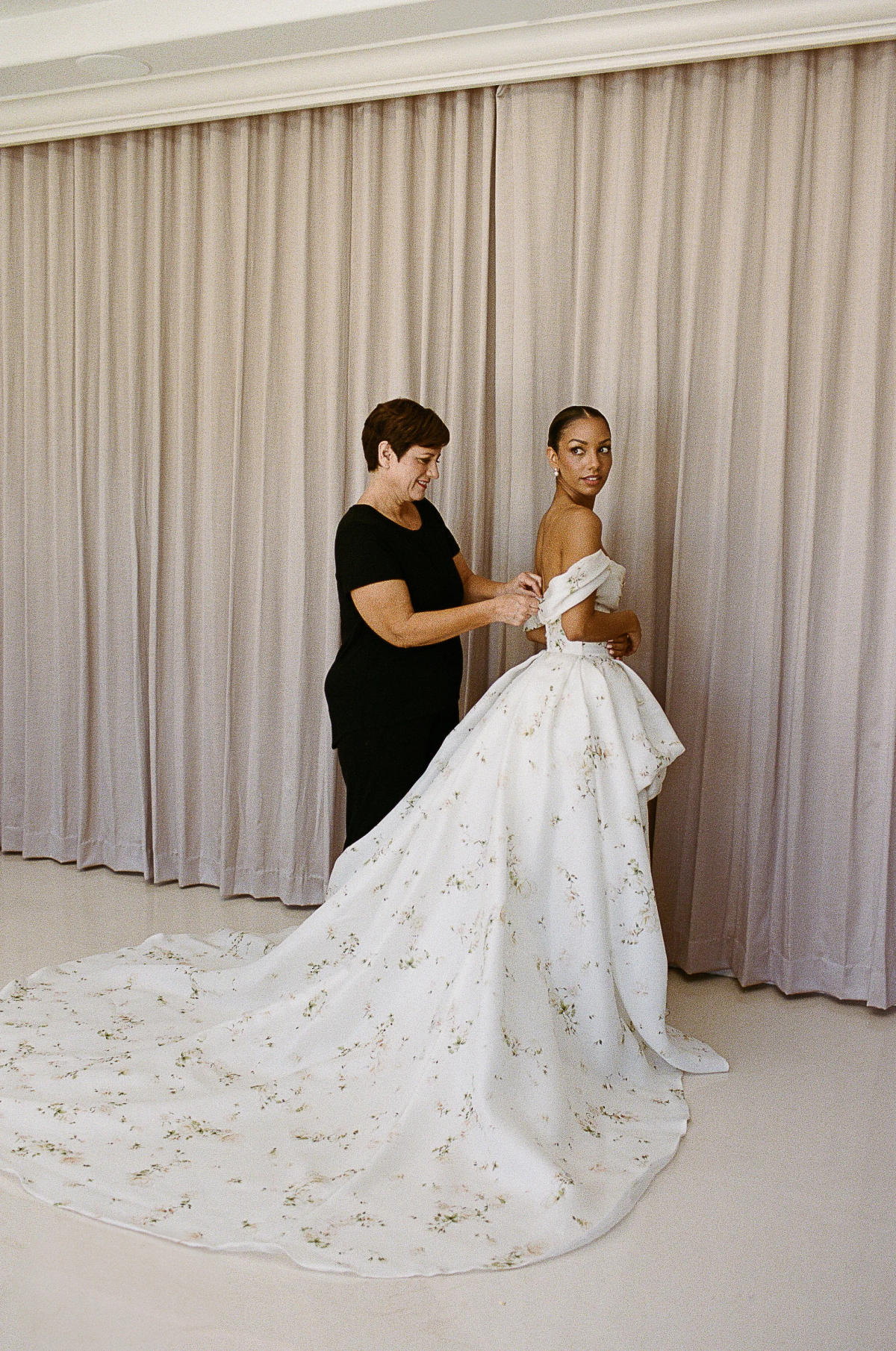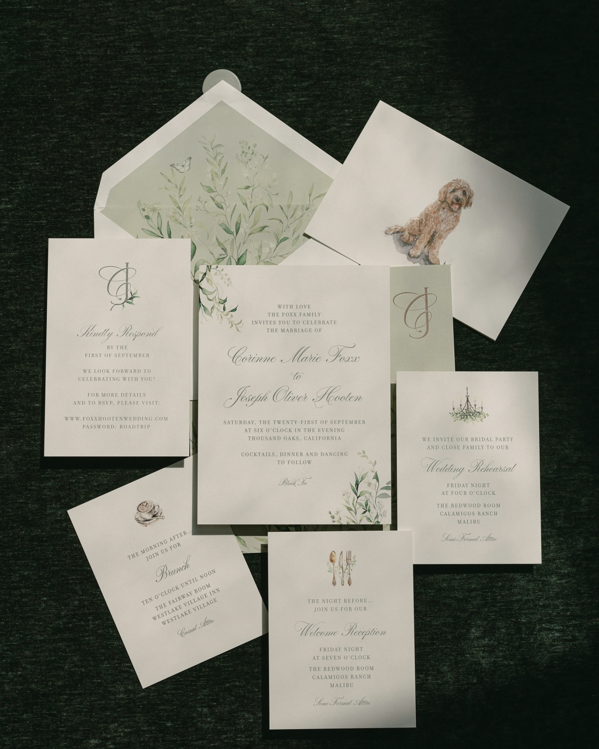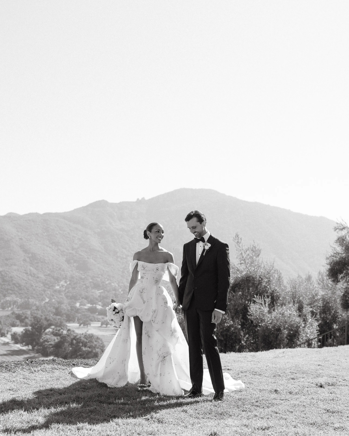 Corinne, the picture of grace and romance, walked down the aisle in a stunning Monique Lhuillier flower-printed gown, paired with pearl-embellished Jimmy Choo shoes and a dramatic long veil that added to the ethereal atmosphere of the day. Both the groom and her famous father, Jamie Foxx, wore matching black suits with traditional bow ties, exuding timeless elegance.