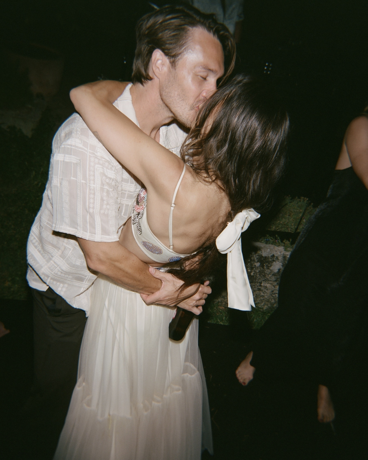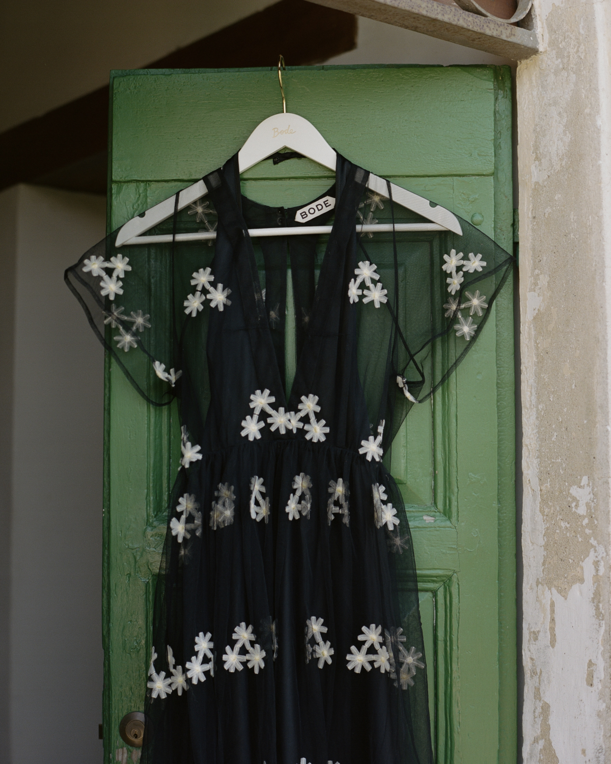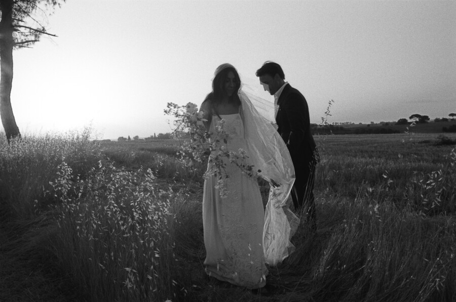 In the months leading up to the wedding, I found myself spending a lot of time in the Bode store. I knew from the start that I didn’t want to wear white. When I stumbled upon this black tulle dress adorned with delicate embroidered daisies, it felt serendipitous. Despite the deep hue, the dress had an airy, almost whimsical quality with its sheer fabric and dramatic neckline. I paired it with a Bode bag featuring Emily’s wire-haired Pointing Griffon—which happens to be the same breed as our beloved dog, Grandpa. Carrying a little reminder of him with me that evening made me smile.