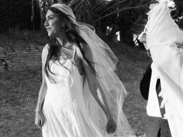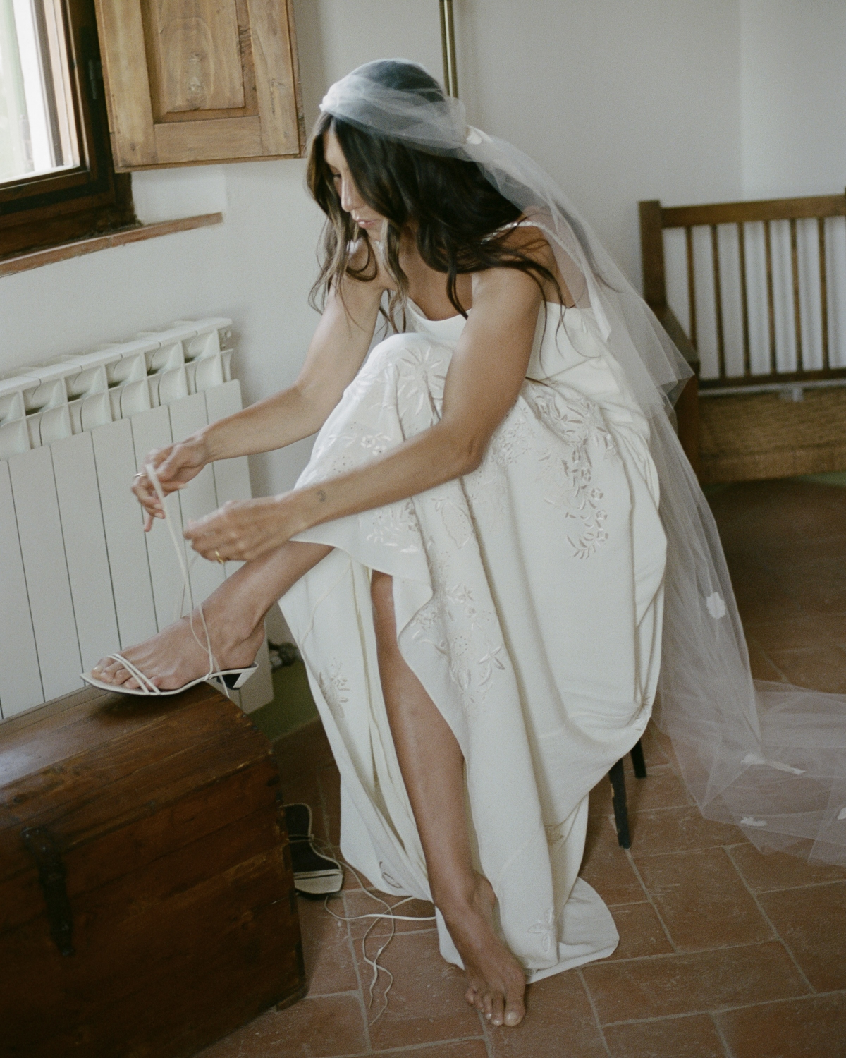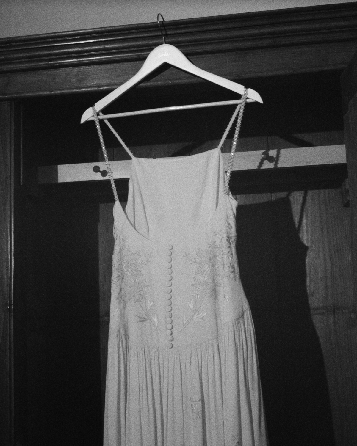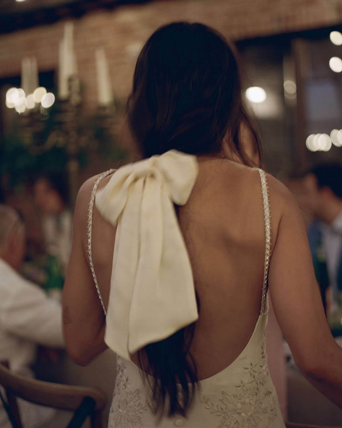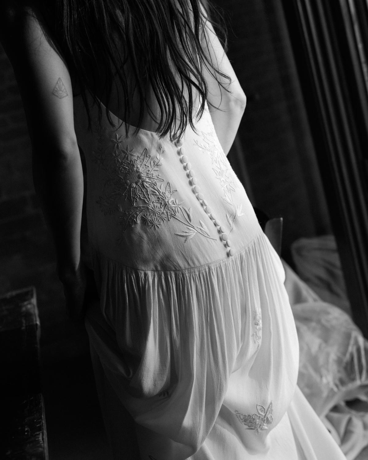 I had a clear idea of the silhouette I felt my best in for the ceremony—an easy, straight neckline, flowing shape, and absolutely no fuss. I wanted a dress that allowed me to move freely and feel like me all night long. The simplicity of the shape gave way to the most intricate details: the gown was embroidered with stunning whitework floral patterns, fine pleats, and a delicate row of ivory buttons trailing down the back. For a touch of something unexpected, we added 1920s-inspired geometric sequin straps that shimmered subtly. I skipped a necklace and let those straps be the star.