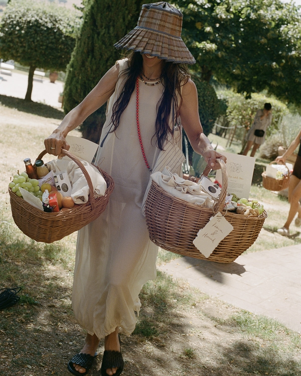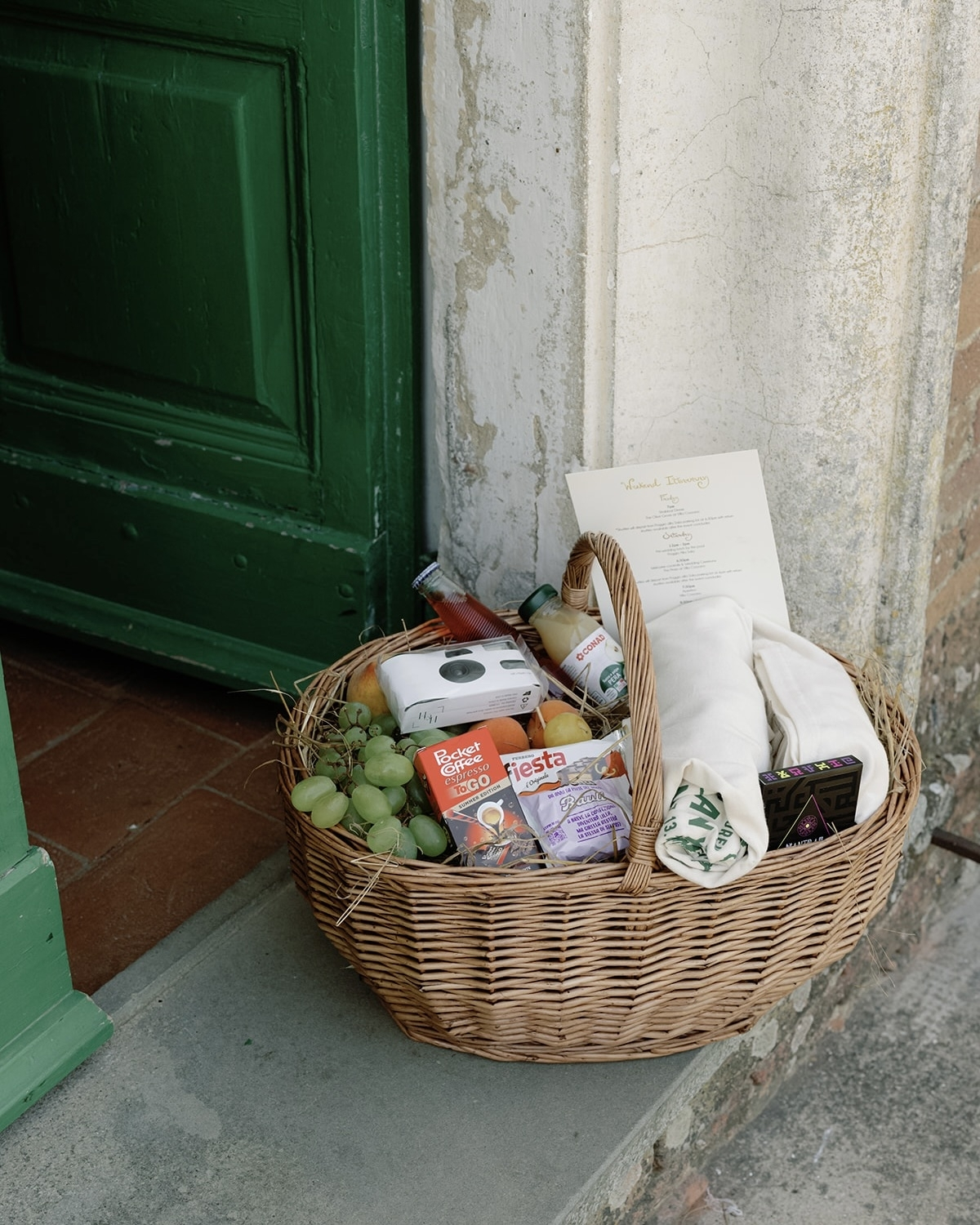 It was important to us that we set the tone of the weekend the moment our guests arrived. They were greeted by the most beautiful welcome baskets—Daniel and his team went to the local markets and filled them to the brim with fresh fruits and treats our guests could enjoy over the weekend. They weren’t your average wedding welcome baskets—they felt so authentic to the location, and I absolutely loved them. We included our shirts, a handwritten welcome note, and the itinerary for the weekend.