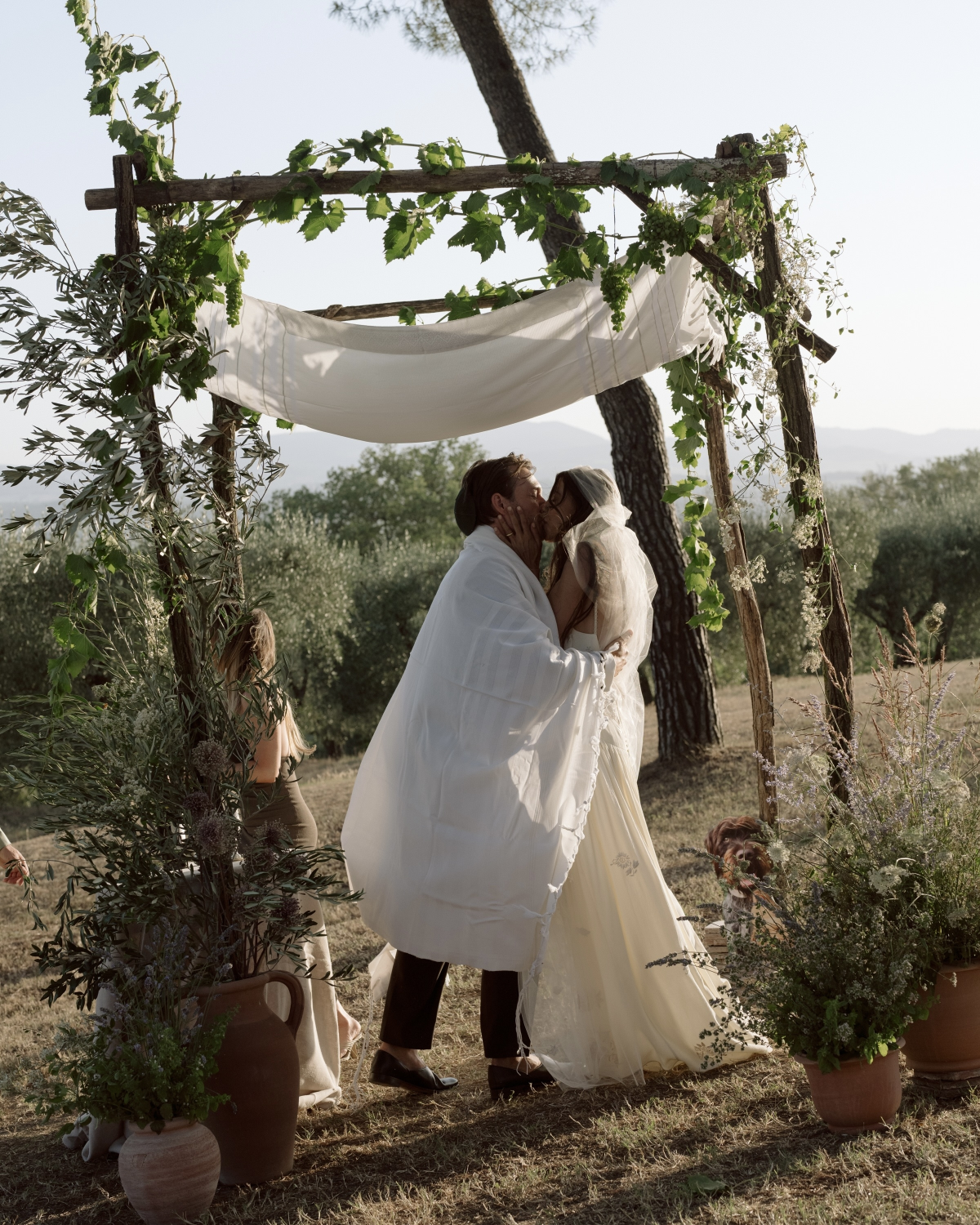 Joyous—it was honestly just such a happy ceremony. Our ceremony took place at sunset, beneath pine trees overlooking the Tuscan hills, just outside the centuries-old villa. The chuppah, beautifully decorated with foraged flowers from the villa grounds, felt natural and unpretentious—exactly the vibe I wanted. I didn’t want anything to “feel like a wedding,” and Laura, our florist, brought that vision to life with an organic, comfortable, and inviting design. The chairs were arranged in a slightly off-centered, winding layout, and the music set a lighthearted tone.
