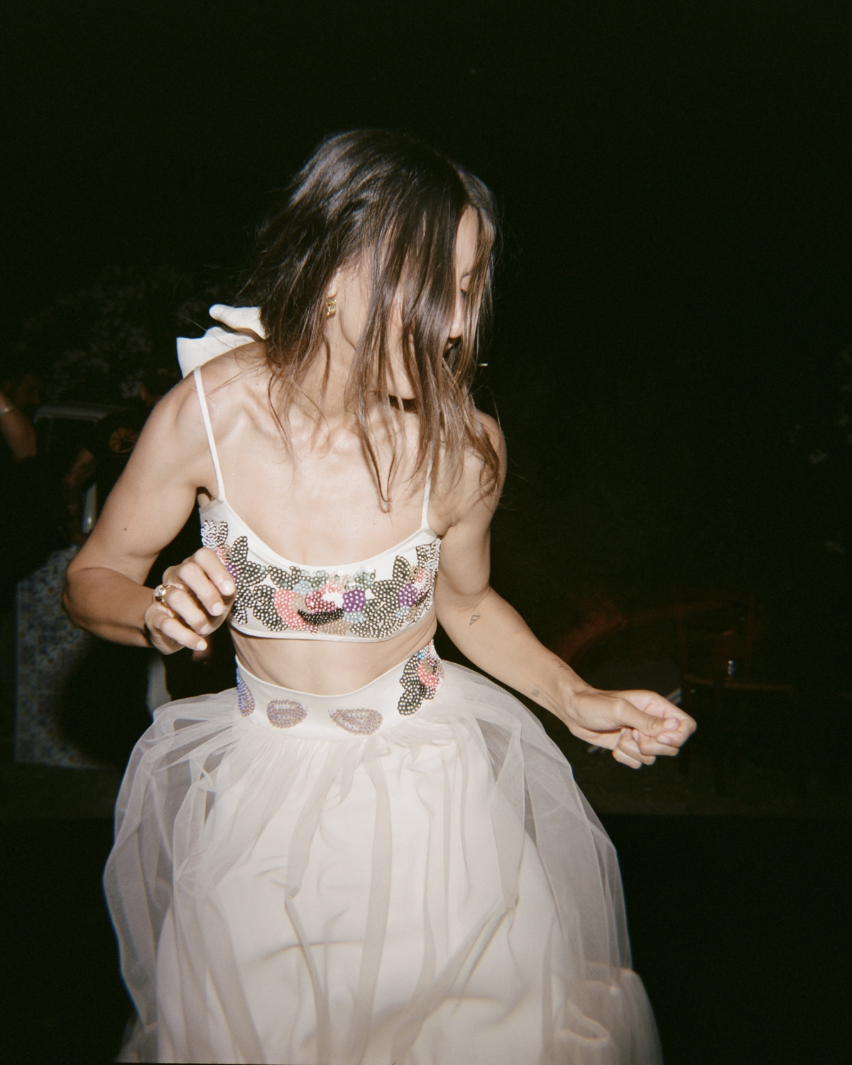 My after-party look might be one of my all-time favorite outfits, and yet it was something I never would have dreamed up myself. It was a stunning Bode two-piece set: a 1930s-inspired sequin-embellished bra paired with a full tulle skirt edged with matching sparkle. I had the skirt customized slightly for the perfect fit and wore simple satin peep-toe flats from Le Monde Meryl. Jessica gave me a quick makeup refresh with a bolder lip, let my hair down, and I was ready to dance the night away.