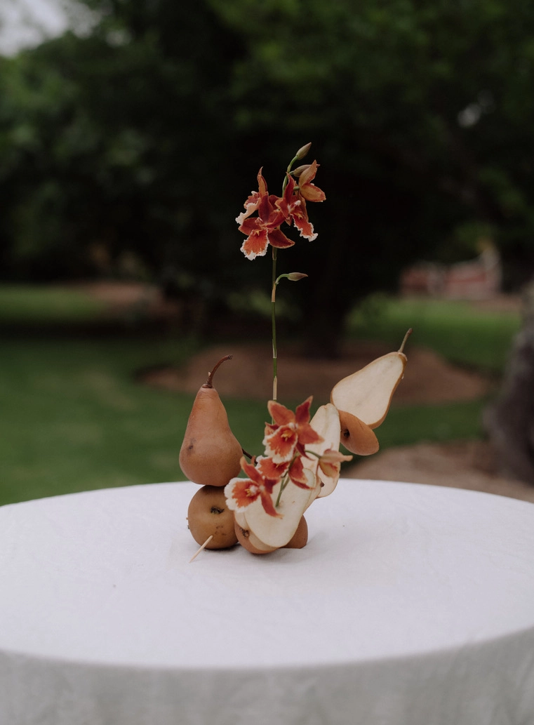 The secret garden ceremony was a vision inspired by undulating gardens that flow seamlessly into an outlook of rolling green hills, creating an organic ceremony circle with seasonal flowers & foliage. The orchard, adorned with citrus and fruit, transformed into a charming setting for aperitivo hour, and an intimate welcome dinner took cues from the cottage garden, featuring roses and ribbons for a soft and intimate atmosphere.