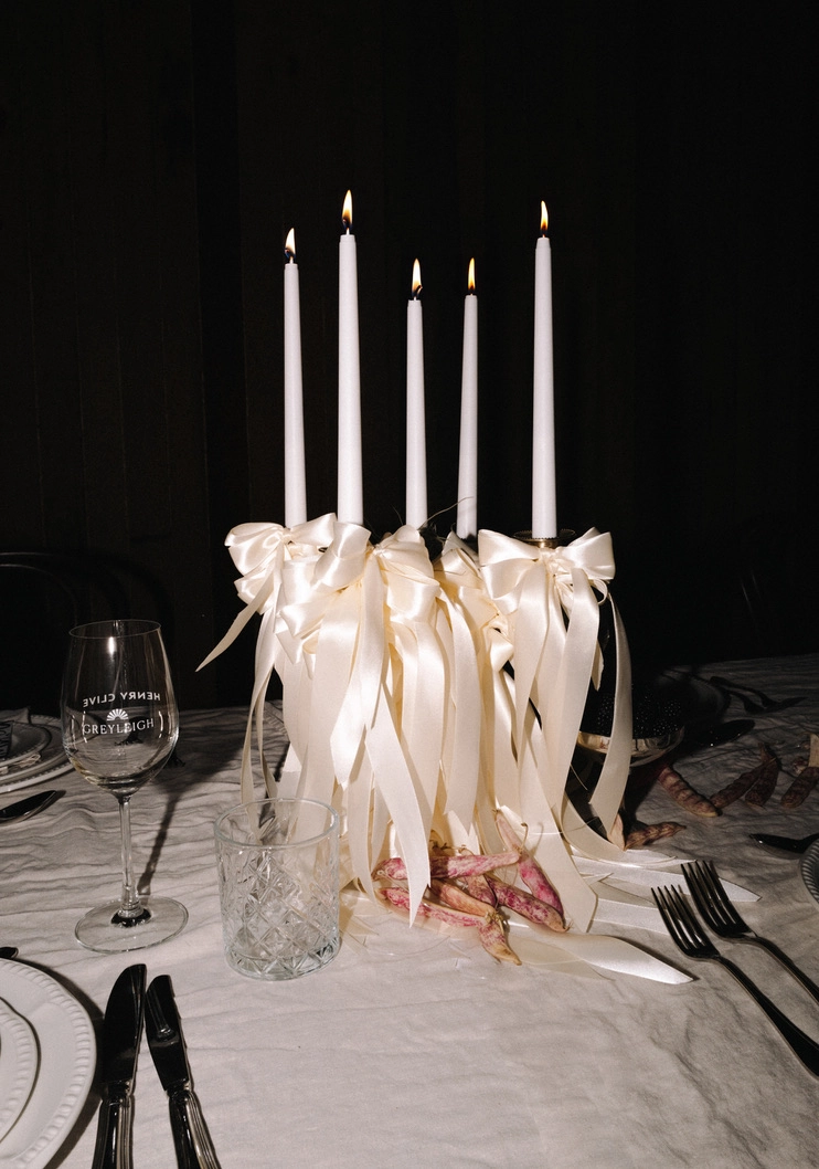 The team incorporated various elements and furniture from the venue, complemented by carefully chosen textural details such as linen chair covers and handmade bow candelabras. Adding a curated selection of styling items, like antique silverware and crystal glassware, created a relaxed elegance, while uniquely shaped flower arrangements by Mrs Gibbons Flowers seamlessly tied together the aesthetic of each part of the wedding day.