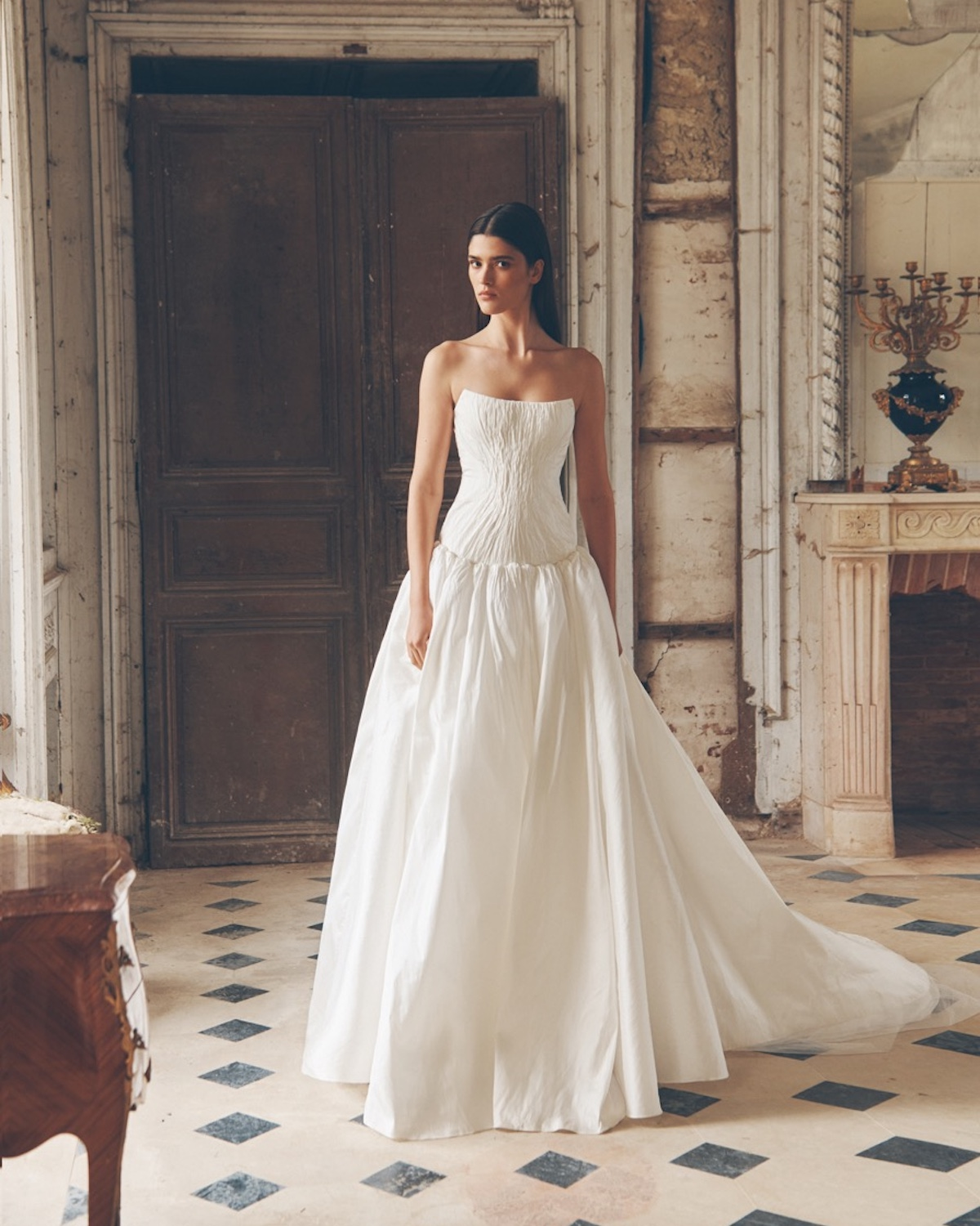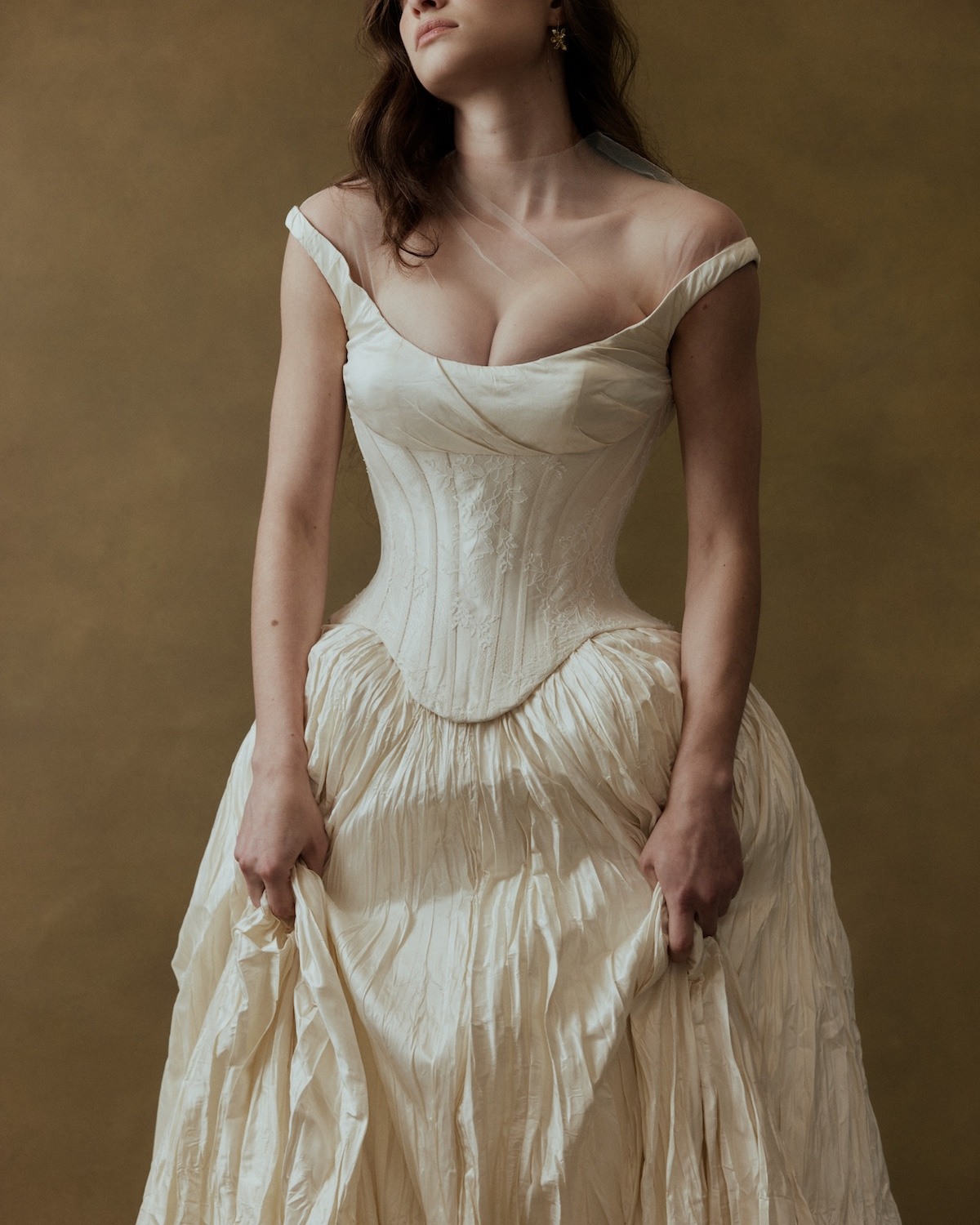 The past lingers throughout the Fall season in subtle, modern ways. Basque waists, vintage embroidery, and heirloom-inspired styling nod to bygone eras while still speaking in a contemporary design language. Rather than mimicking the past, designers reinterpret it with intention, less costume, more character. Floure leans into poetic romance with voluminous hips, Markarian reworks 1950s silhouettes into chic statements, and Milla Nova delivers regal drama with embellished corsetry.