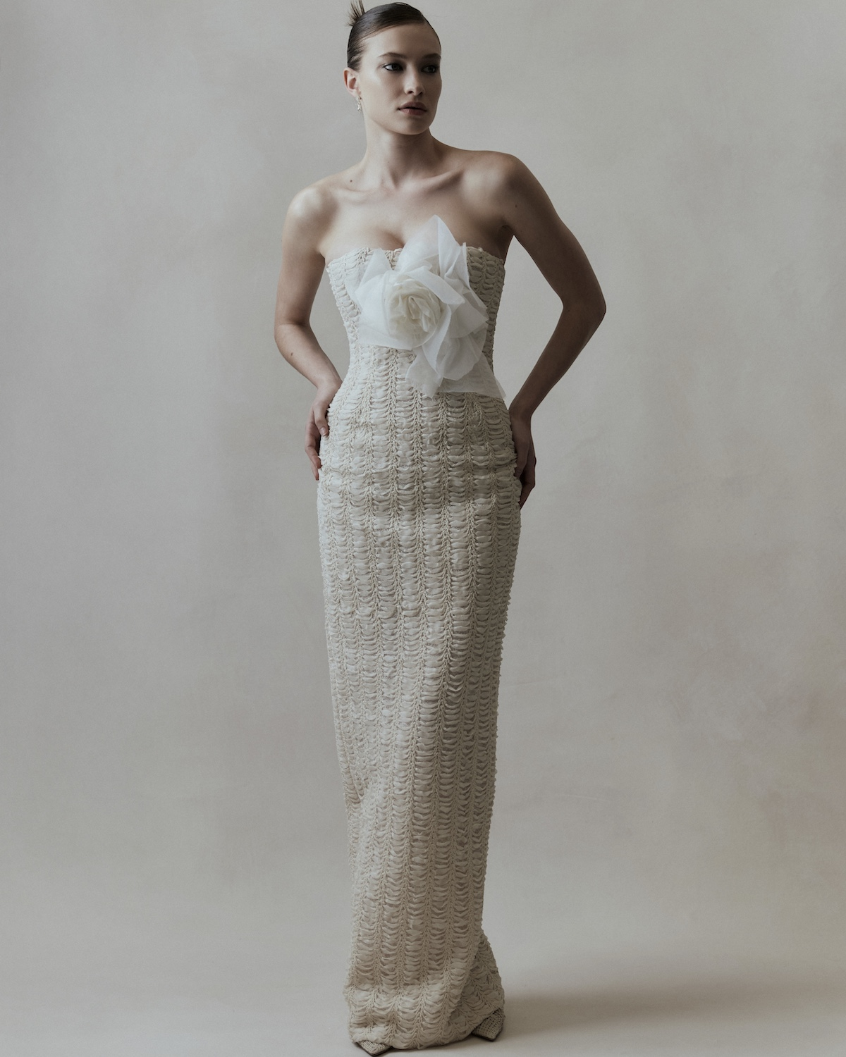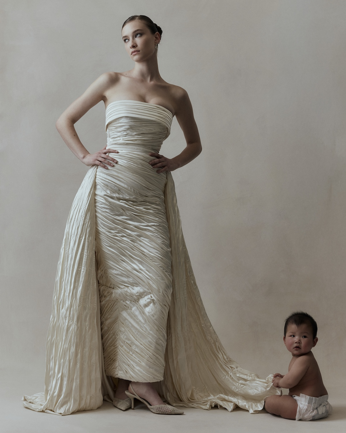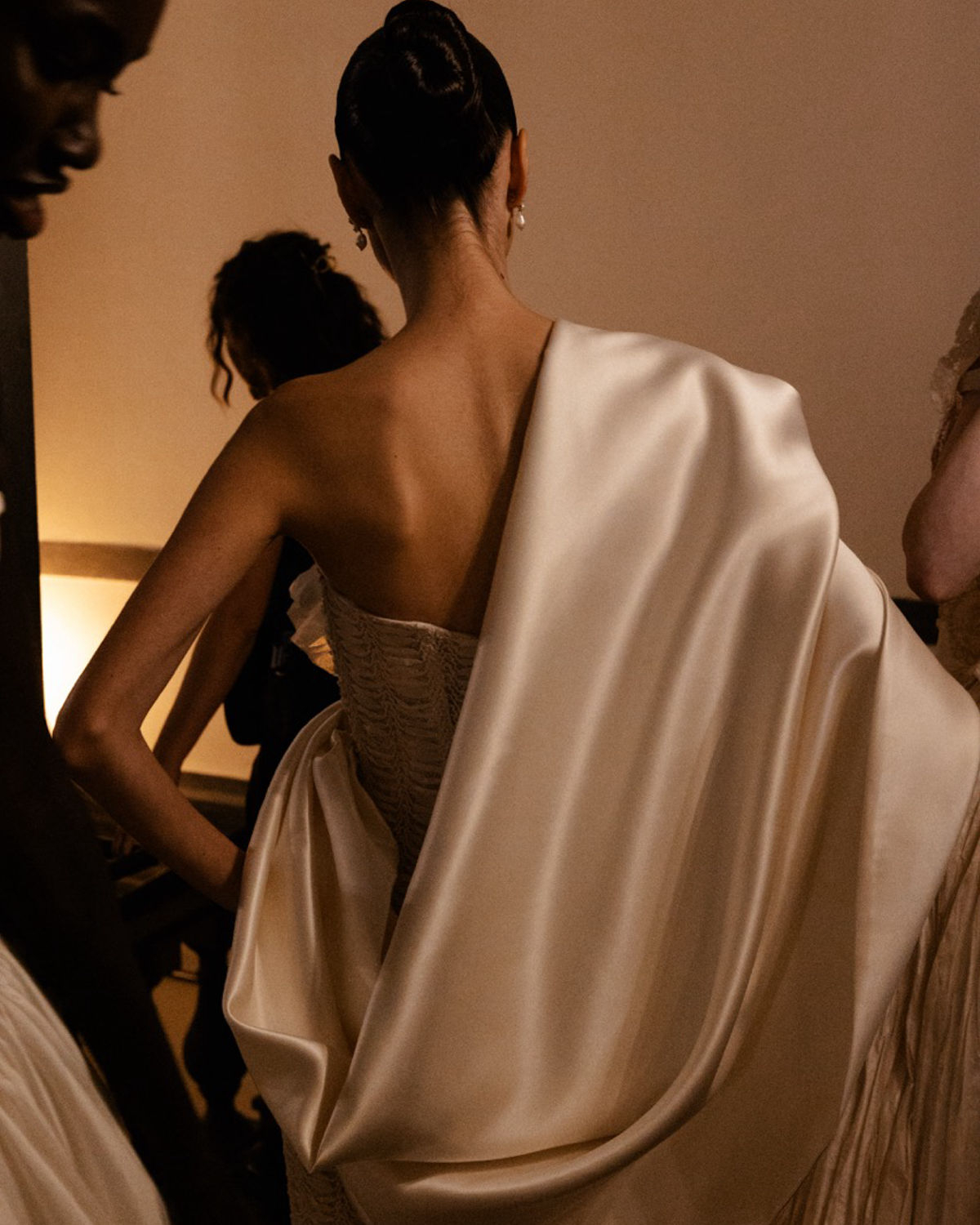 A recurring textural muse for next season? Organic pleats and crinkles. These soft, romantic folds flowed through the Fall 2026 bridal collections, adding a poetic, almost kinetic quality to gowns. Infinitely more sensual than traditional pleating, this handcrafted technique creates depth without weight and structure without stiffness. Brands like Floure, Margot, Hera Couture and Marmar Halim leaned into the look, using micro-pleats and shapely crinkles to bring subtle movement, tactile edge and a kind of romance that feels both timeless and completely of-the-moment.