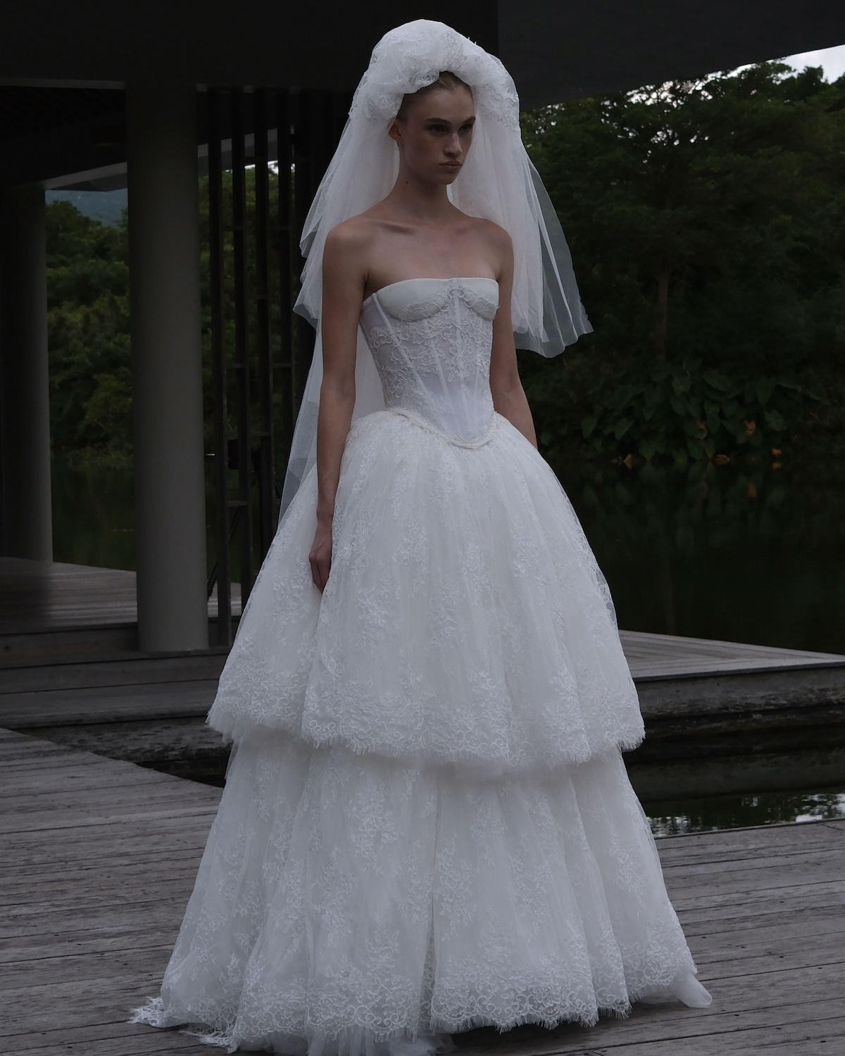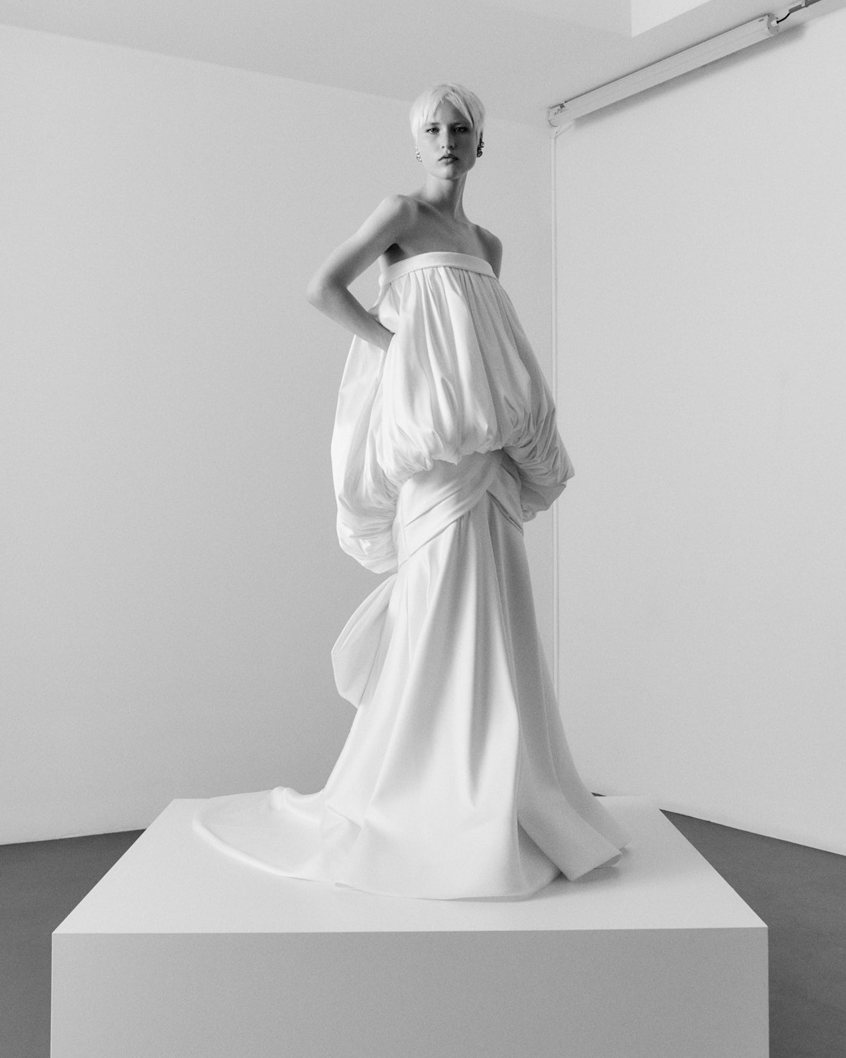 Volume gets a modern edit for 2026 with balloon-inspired silhouettes. Designers put a spin on rounded hems and puffed-out skirts, turning proportion into the main event. Elly Sofocli and KYHA Bride reimagines the look as playful tulip like proprtions, Markarian leans into romantic tiers, Floure softens the shape with pillowy gathers, while Viktor & Rolf experiments with puffy layers. Perfect for the bride who wants drama with a light touch, and a silhouette that truly stands out.