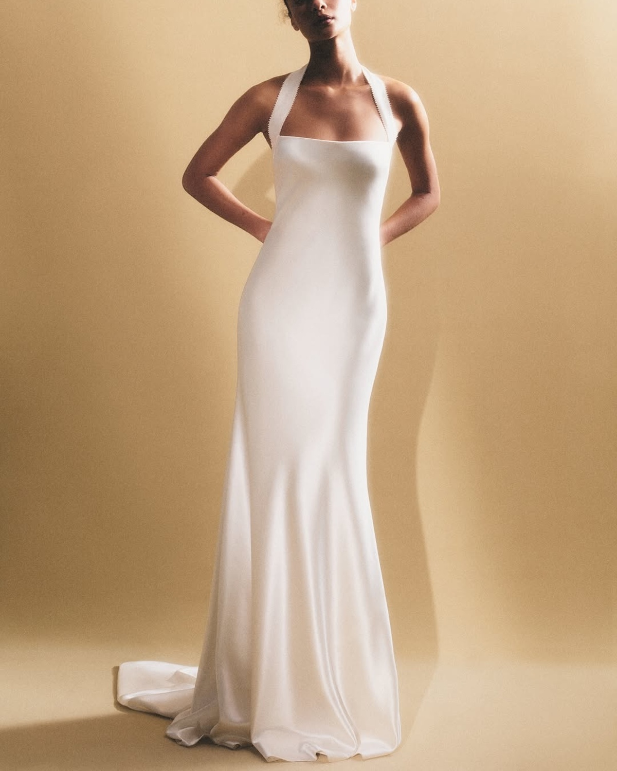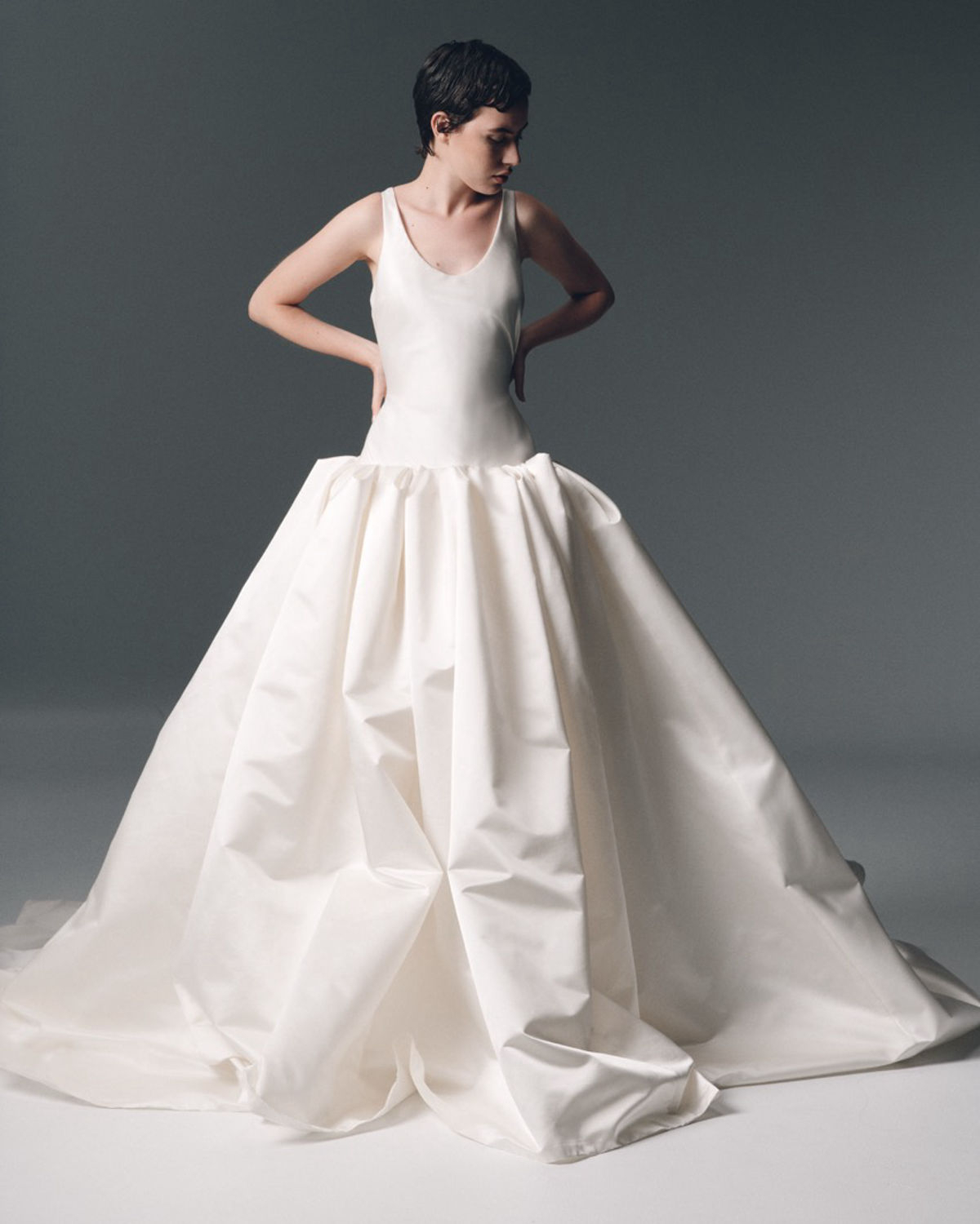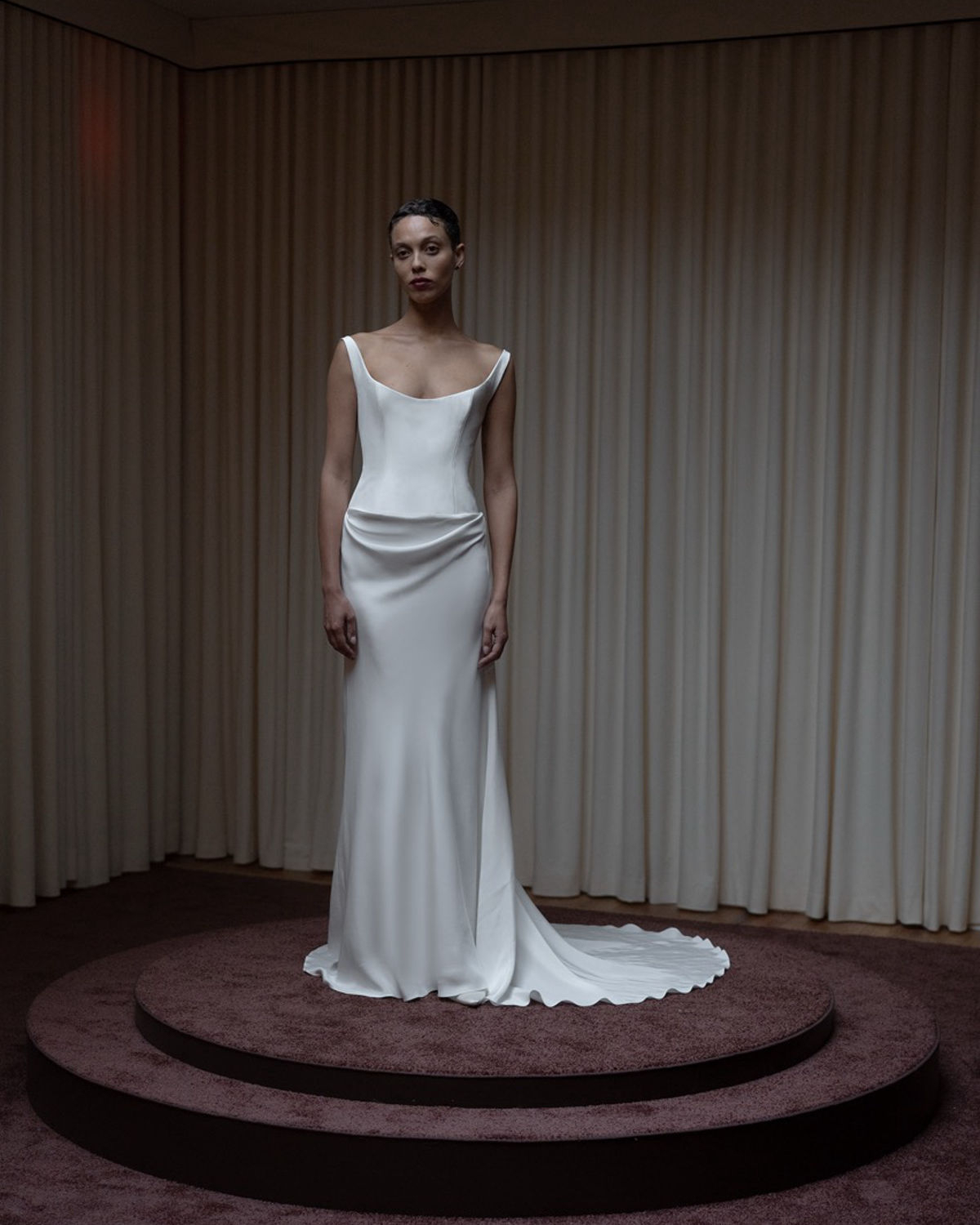 This season, bridal chic gets a subtle reset with tank-style tops, bringing an effortless 90s energy to the aisle. Think bolder straps, pared-back necklines, and bodices that don’t try too hard. Nicole + Felicia, Alexandra Grecco, Monique Lhuillier, and Elly Sofocli deliver some of the sleekest interpretations, fusing polish with laid-back elegance. Prefer a less conventional take? Margot adds a peplum for an added dose of cool.