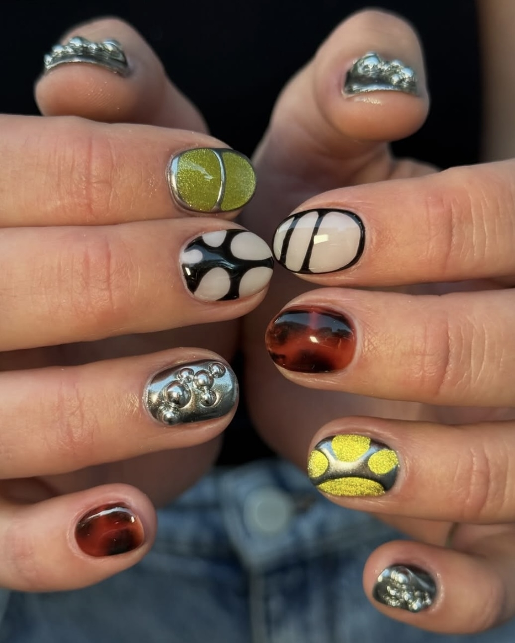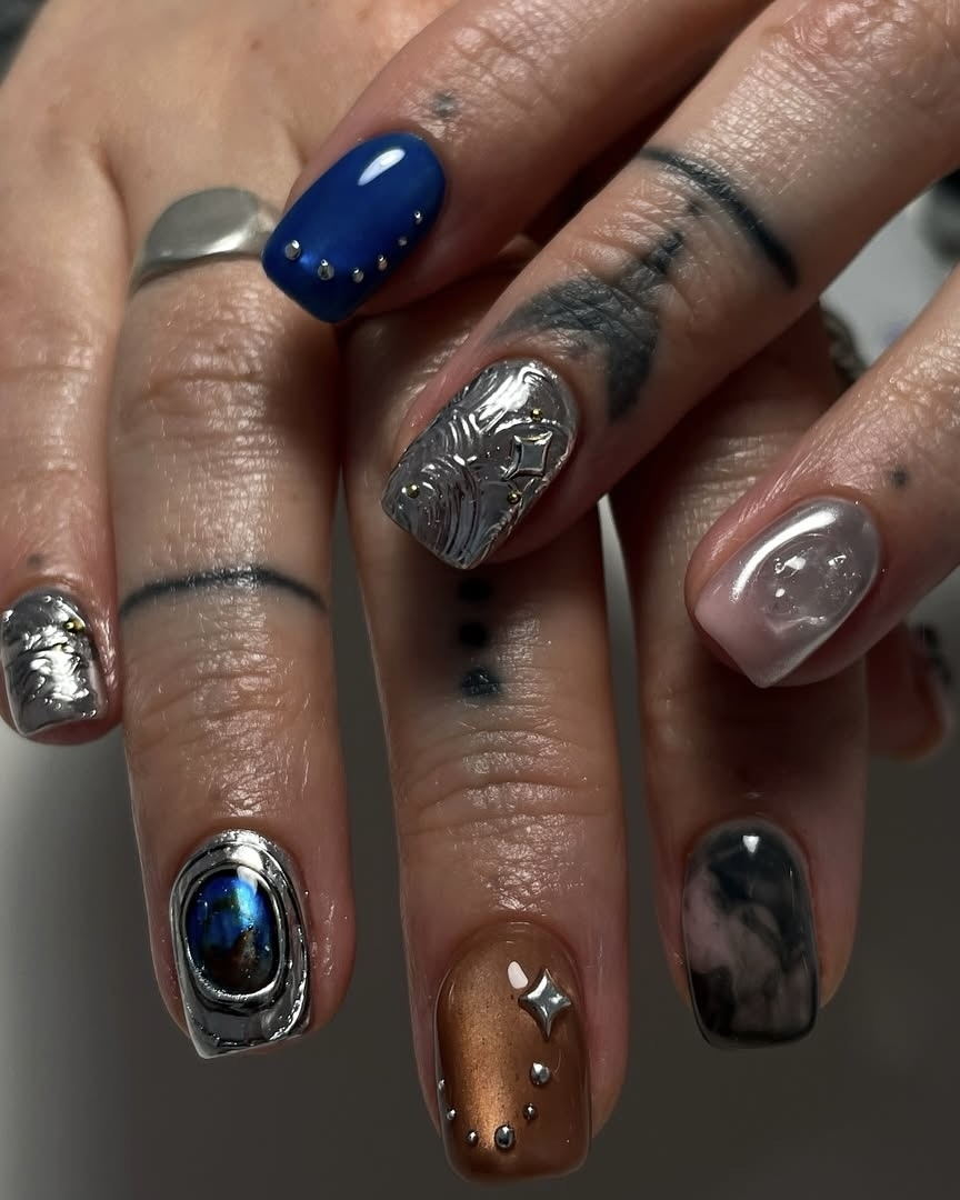 Minimalism takes a backseat in 2026 as nails transform into tiny, curated galleries. Drawing inspiration from the intricacies of Asian nail artistry, each nail tells a unique story, and together, they form a cohesive narrative. Picture a collage of 3D appliqués, chrome cat eyes, metallic studs, delicate drawings, and unexpected textures across your hands. It's maximalism at its most luxurious – unapologetic, intricate, and delightfully over the top.