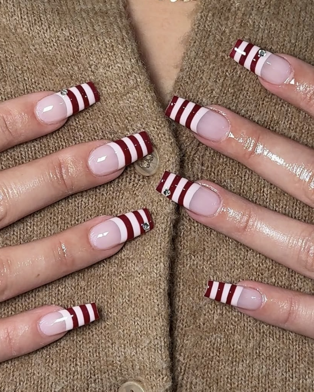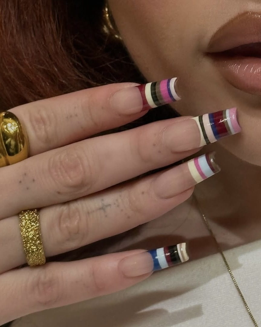 Why settle for a single shade when you can have an entire palette dancing across your nails? Chic stripes are back with a distinctly It-girl energy, evoking the charm of a '90s striped sweater – but elevated. Think bold lines in candy brights, moody jewel tones, or soft pastels, depending on your mood. The beauty lies in the versatility. Go for full coverage for a bold look, or keep it playful with striped French tips. Either way, it's effortless cool wrapped in color.