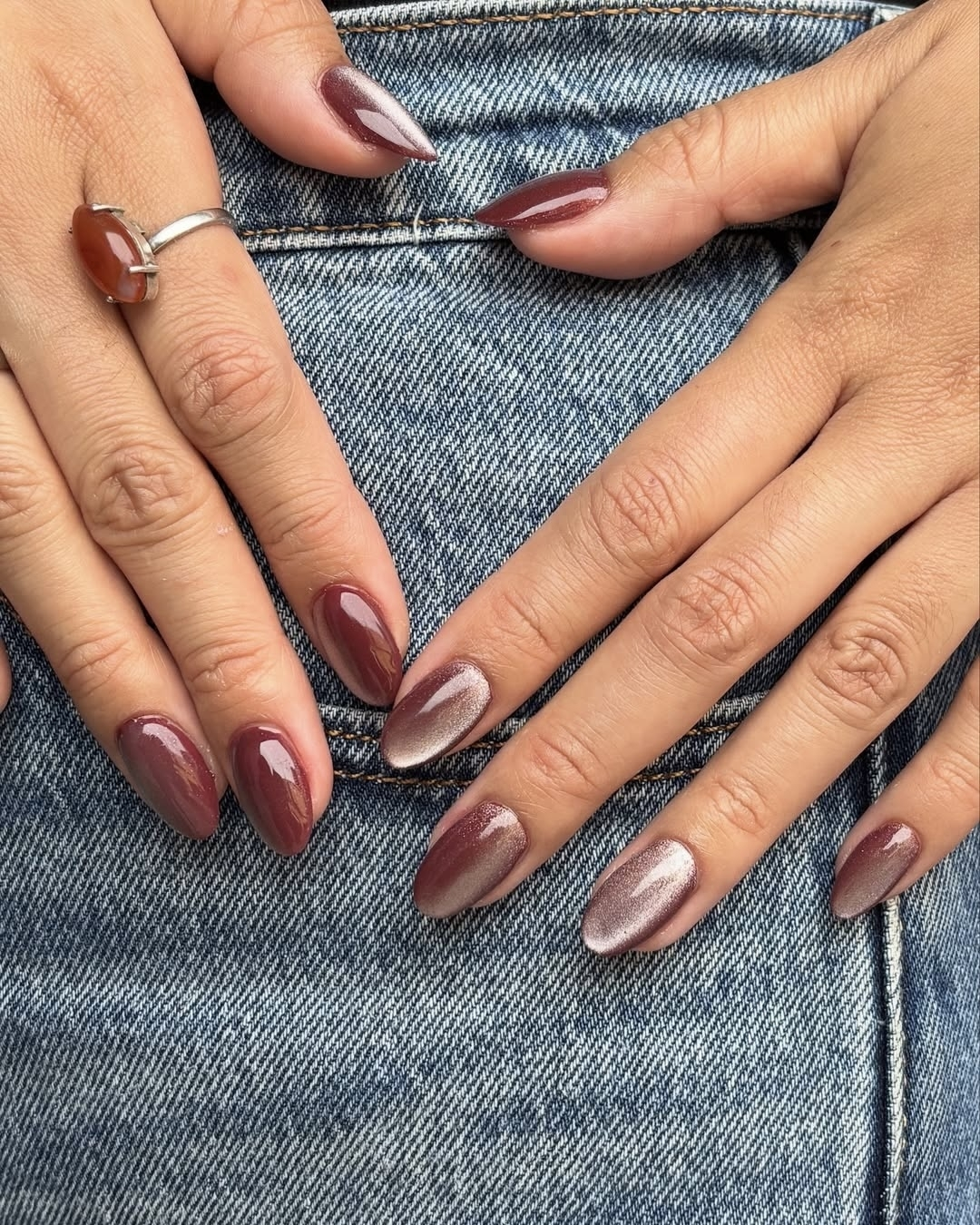 A throwback to the early days of gel trends, the cat-eye finish is back – but sharper, glossier, and more magnetic than ever. Shimmering metallics swirl across deep bases, creating movement that shifts in the light like liquid velvet. This look is bold yet not overpowering, making it perfect for those who want depth without excessive decoration. In 2026, the cat eye is less about novelty and more about modern elegance.