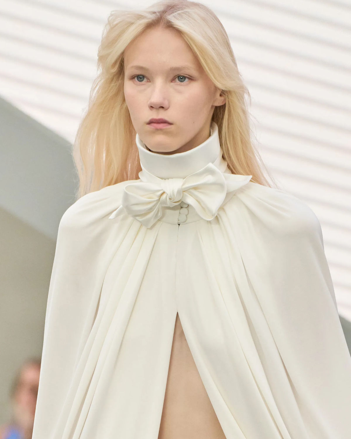 This season, necklines are reaching new heights. On the Spring-Summer 2026 runways, the high neck reclaims its place in the spotlight, bringing elegance with an edge. Fashion’s visionaries played with silhouettes that climb, wrap, and frame the face — some soft and romantic, others structured and sculptural.