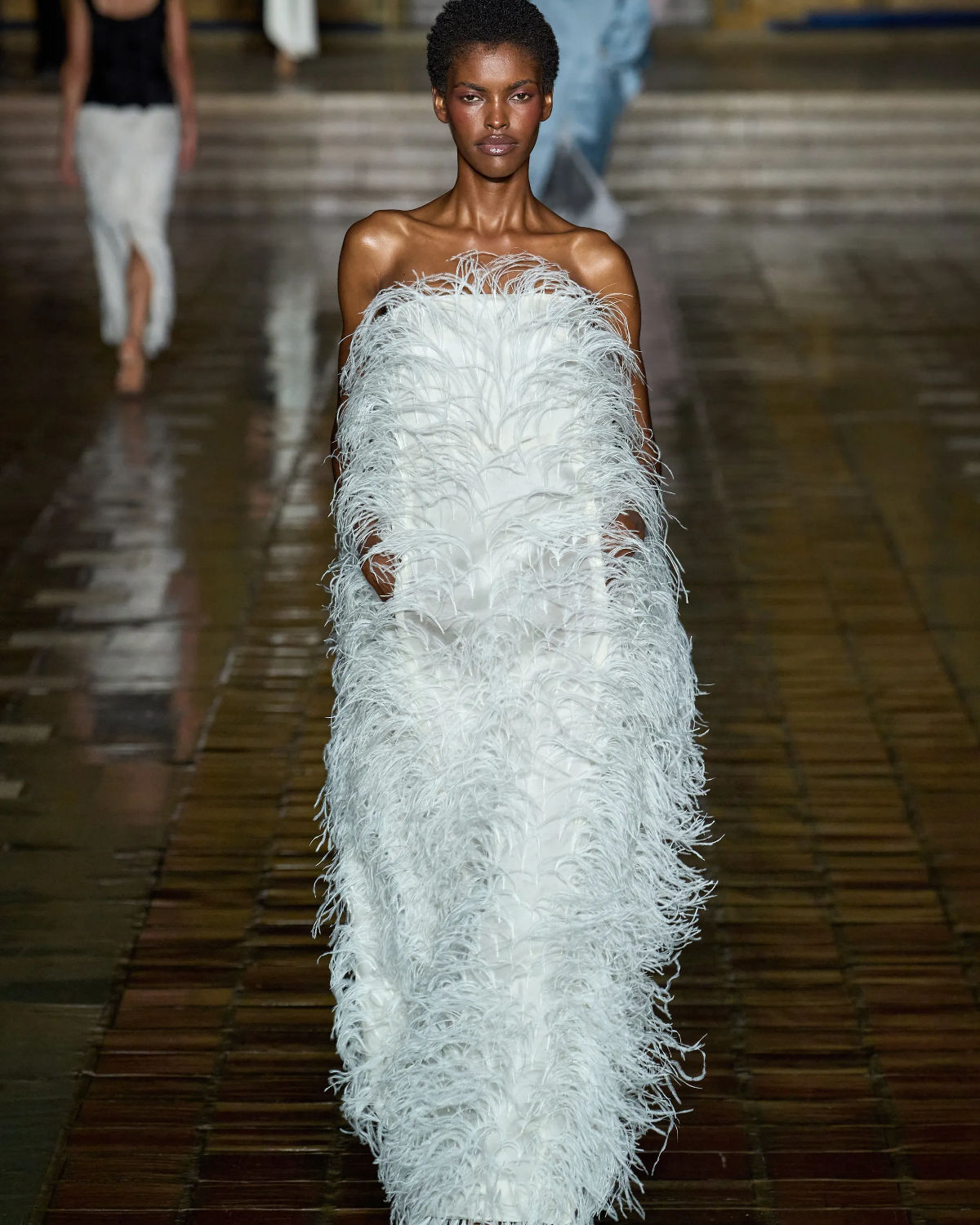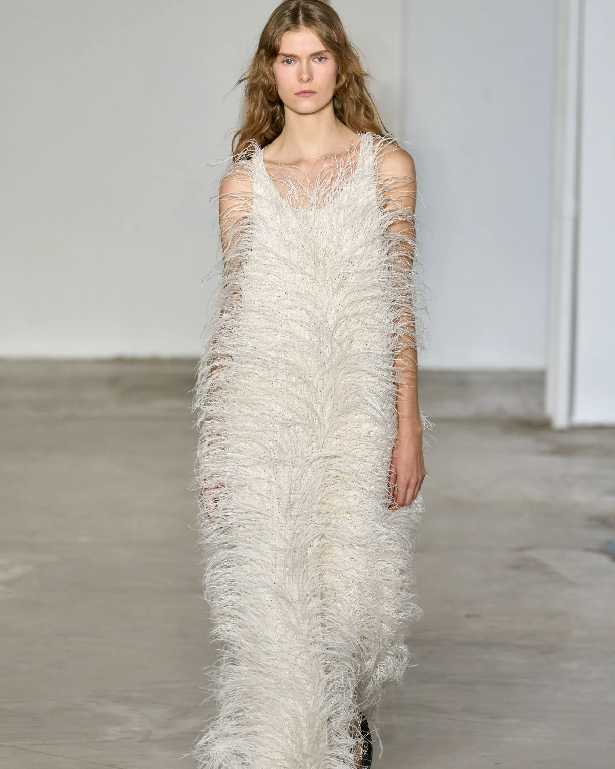 Feathers, fringe, and ornate trims are back, and they’re not here to whisper. For Spring-Summer 2026, designers treated embellishment like an exclamation point, using texture to create motion, drama, and a sense of lightness. At Bottega Veneta, fringe appeared in multiple iterations, dancing along skirts, scarves, coats, and capes.