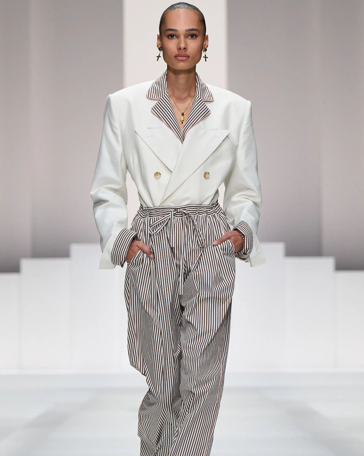Elevated loungewear is still having its moment, and pajama-inspired looks got their turn in the spotlight. After showcasing the look in their Spring-Summer 2026 menswear collection, Dolce & Gabbana carried it over to womenswear, proving sleepwear can be just as chic outside the bedroom. We’re especially into the pajama pants styled with a sharp tailored jacket — a perfectly unexpected fusion of smart and slouchy.