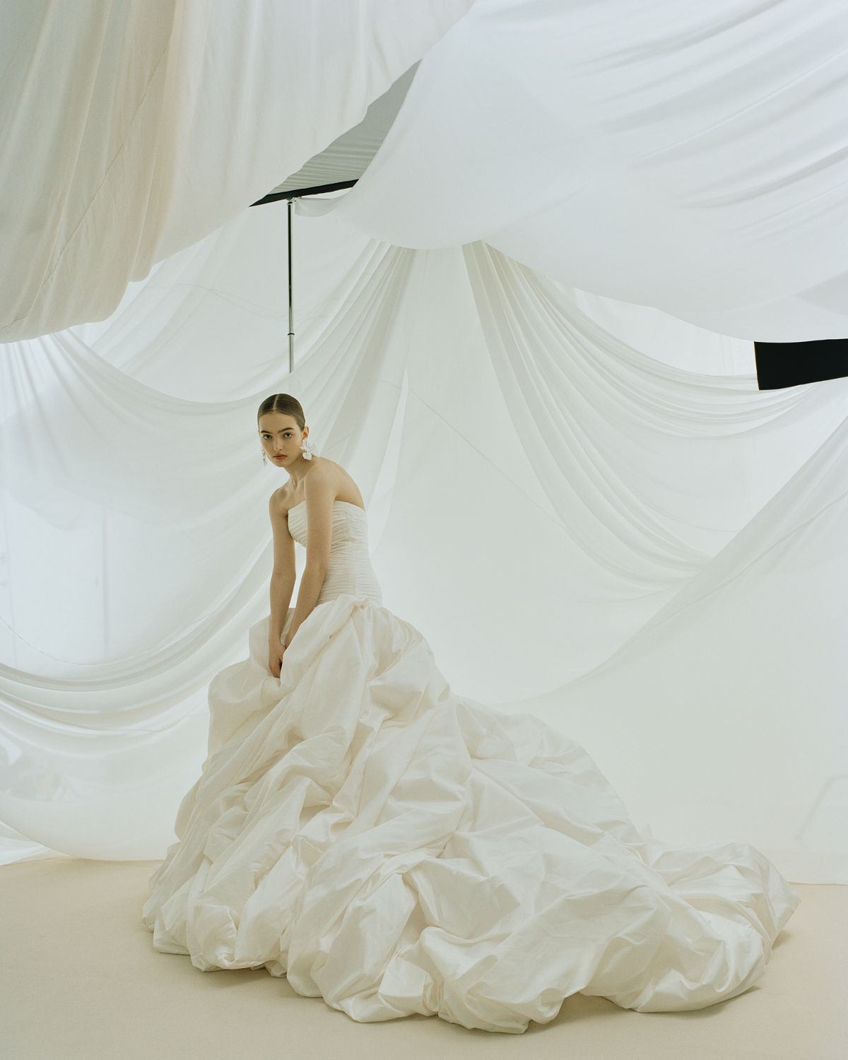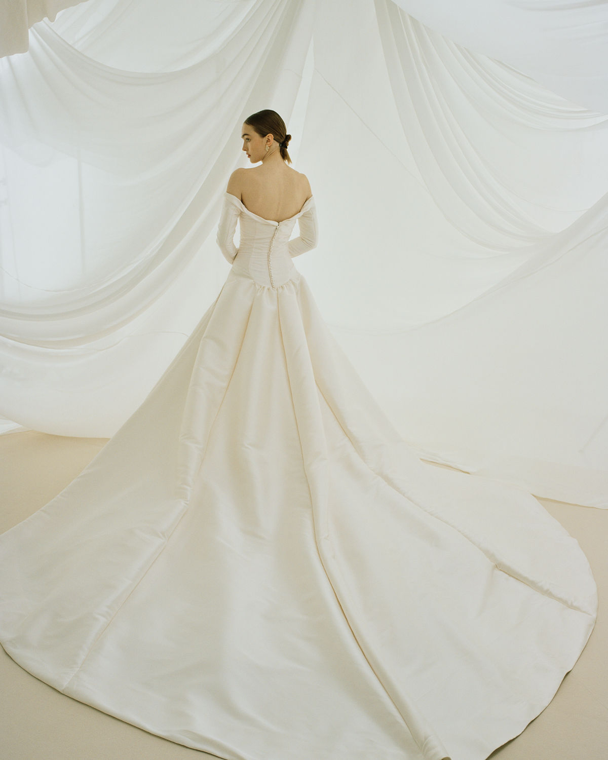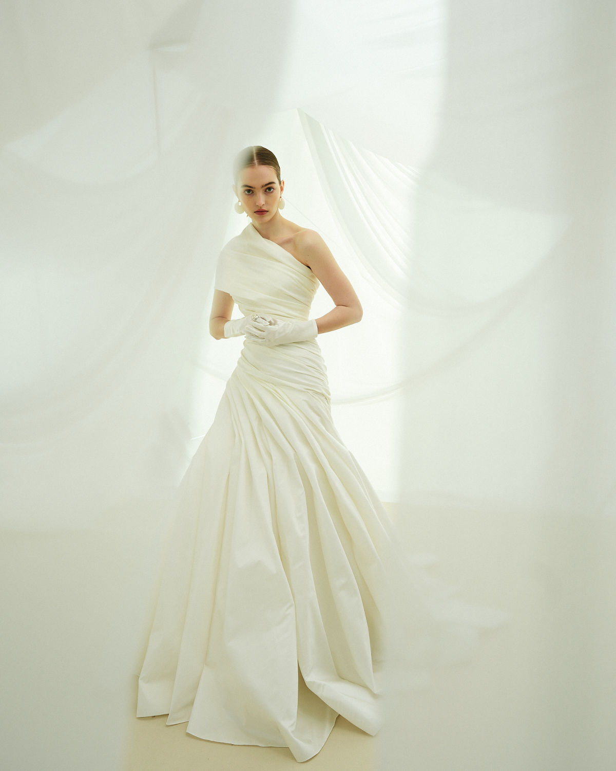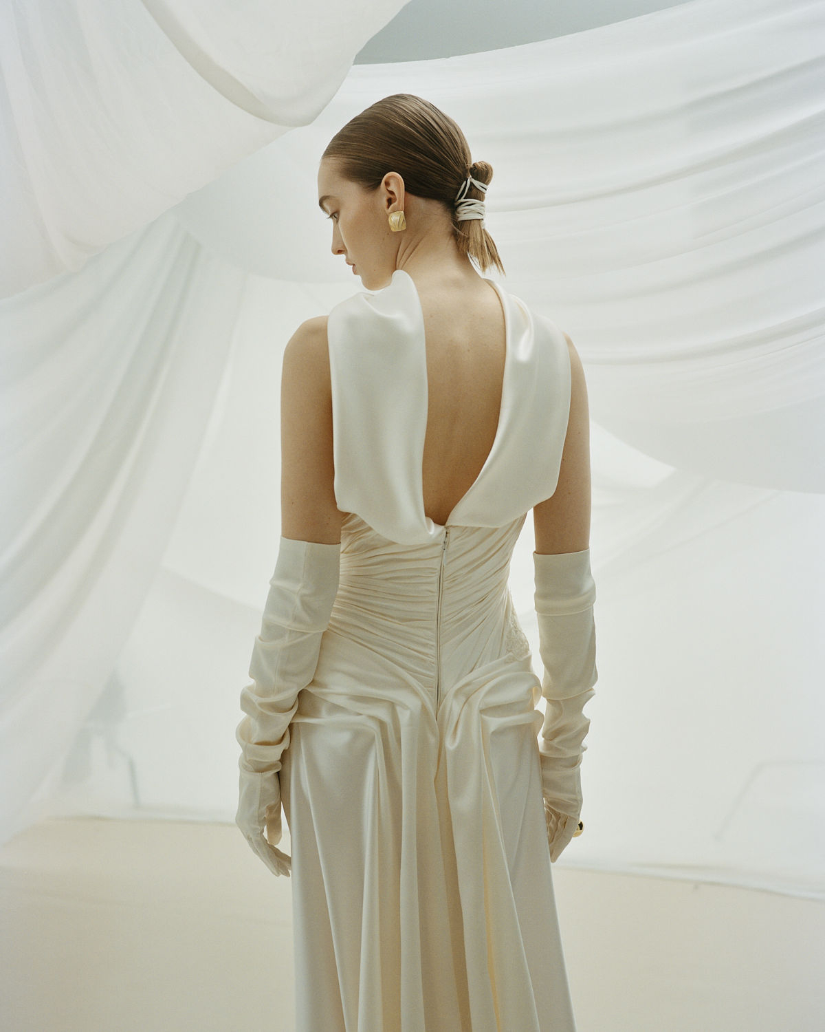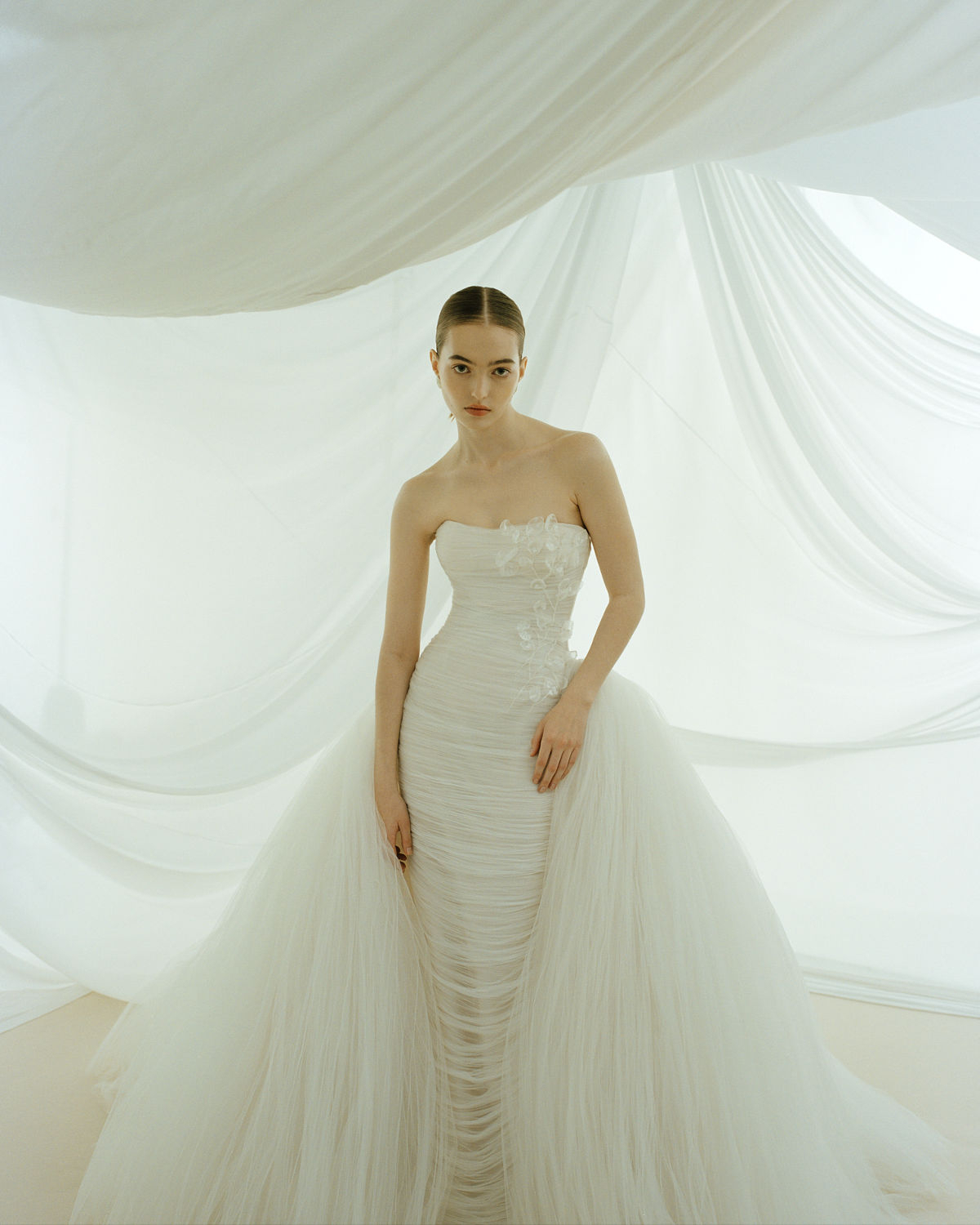 The brand’s latest bridal collection, Lunaria, takes its name from the bouquet carried by Marmar’s daughter on her wedding day. The Lunaria flower, a symbol of honesty, served as the emotional and creative anchor for the designs. A sense of purity and quiet minimalism runs throughout — defined by clean lines, dropped waistlines, sculptural draping, and delicate touches of airy tulle. Classic silhouettes are reimagined through a contemporary lens, resulting in a collection that feels both grounded and forward-looking.