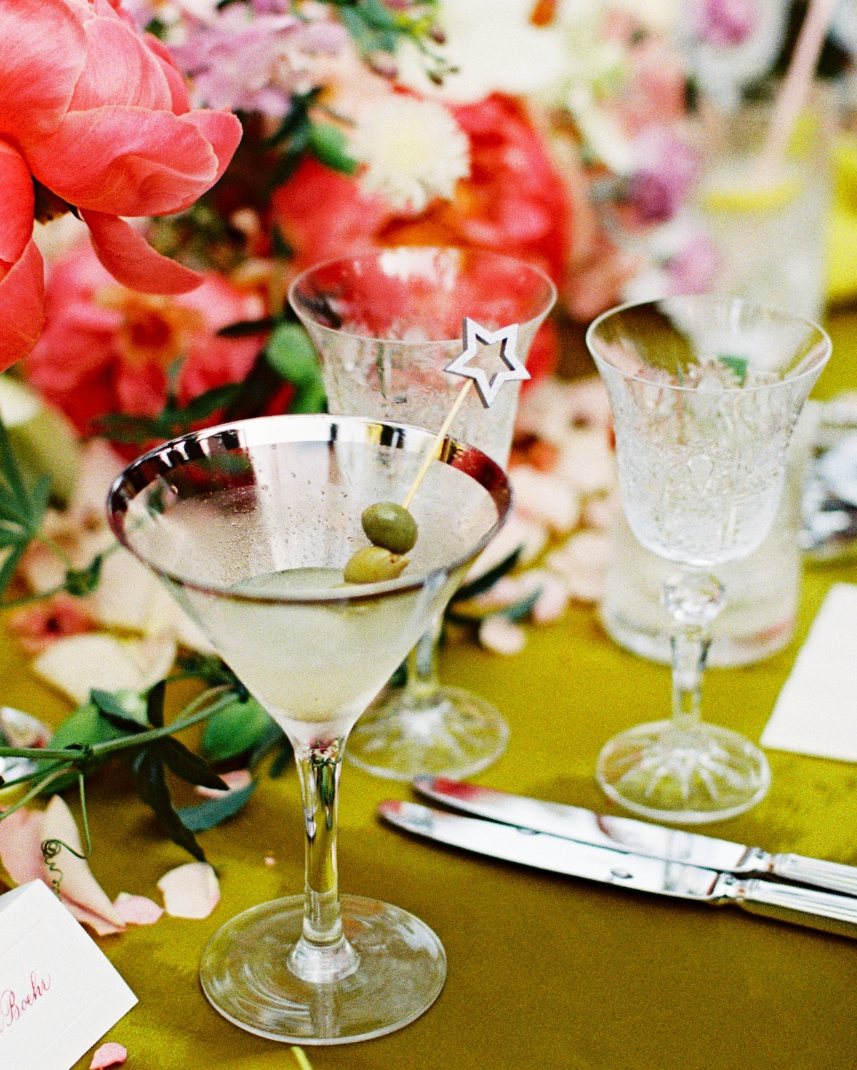 For a year leading up to the wedding, we collected silver Art Deco pieces — vintage absinthe dispensers, silver salt and pepper shakers, bowls, and cutlery — to use throughout the night. Custom chartreuse, star-embellished jackets were worn by servers and bartenders, each adorned with a signature Rezek Studio chartreuse flowerette. To close out the night, Hollywood Star Tour vans lined up outside Dawnridge to shuttle our closest friends to Chateau Marmont for the late-night after-party.