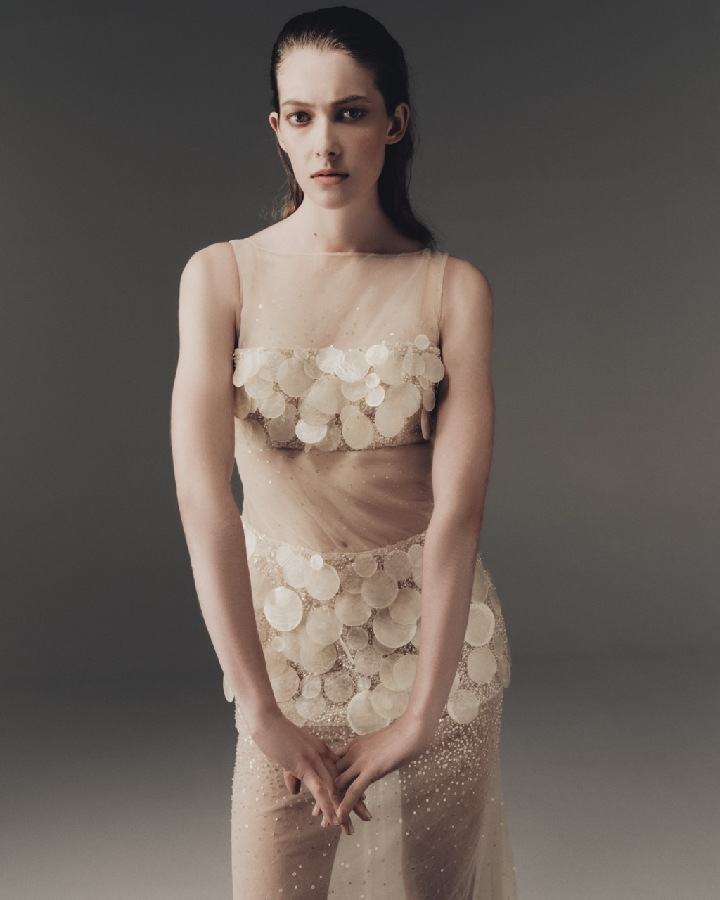 Comprising twelve carefully considered pieces, the Australian brand’s collection marries sculptural tailoring with soft emotion, offering a fashion sensibility grounded in modern romance. From detachable organza overskirts and tartan sheers to seashell-stitched reception gowns and crystal-studded mesh designs, every look captures a striking contrast—playful yet precise, bold yet delicately intimate.