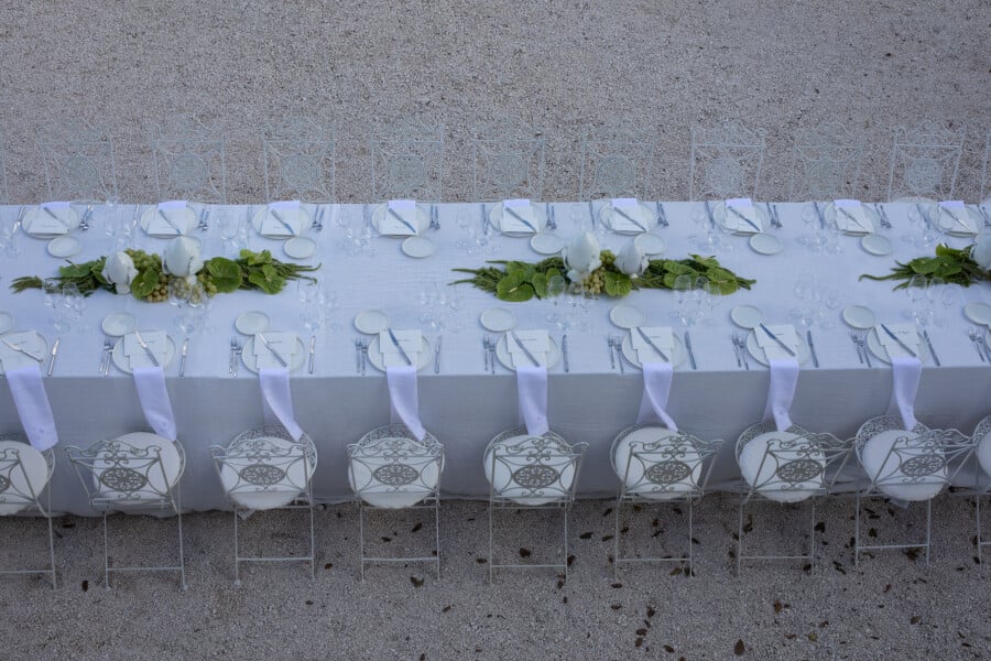 A single, continuous table stretched along the front of the Masseria, draped in creamy white linen and adorned with a curated tablescape of locally made ceramics that caught the afternoon light. Florals were minimal yet sculptural: citrus green amaranths, bold anthuriums, and locally picked grapes were meticulously scattered down the centre, a quiet nod to the breathtaking surrounding gardens designed by Urquhart & Hunt, renowned British landscape designers.