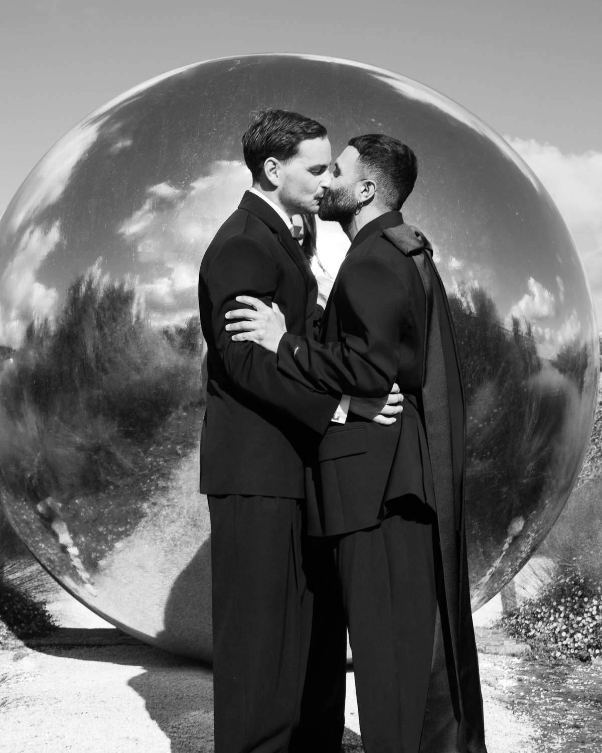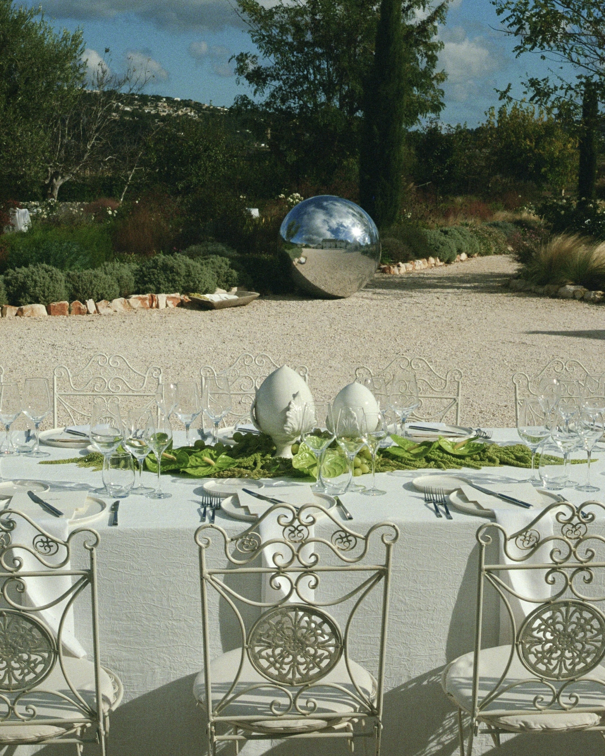 Hommey’s Head of Design Jamie Ashkar and interior stylist Matthew Dine brought their creative world to Puglia for a wedding that felt deeply personal, visually striking, and effortlessly modern. Choosing the beautifully restored Masseria Pistola as the setting, the couple invited their closest guests for an immersive celebration shaped by thoughtful design, warm hospitality, and impeccable style. For the ceremony, a giant chrome sphere anchored the garden backdrop, reflecting the surrounding vineyards. The reception followed with a single sweeping table dressed in creamy linen, handmade ceramics, and restrained florals of amaranths, anthuriums, and local grapes — elegant details that felt considered rather than overworked. Their looks were equally directional: Matthew wore a sharp Jacquemus suit paired with a bespoke bow tie, while Jamie chose an oversized Mugler silhouette finished with a dramatic silk satin bow cascading from the back. With Italian classics drifting through the air, cocktails flowing freely, and a supermoon rising as the cake arrived, the entire day carried the kind of atmosphere that can’t be manufactured — intimate, magnetic, and entirely their own. THE WED members from Rotondo Catering by Alba brought the culinary vision to life, overseeing both the catering and wedding cake with their signature blend of refined presentation, generous Puglian hospitality, and beautifully considered flavor.
