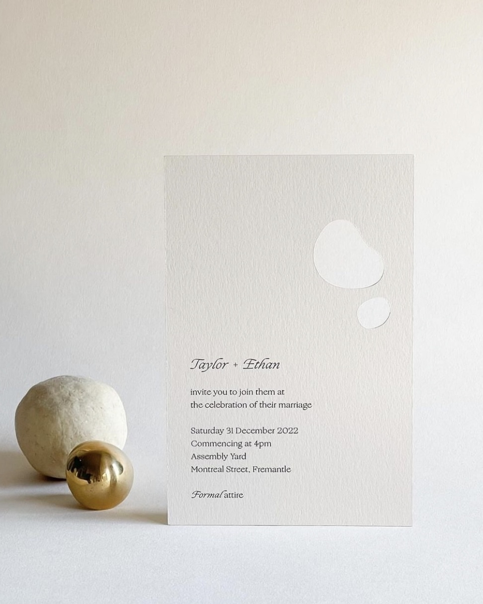 Elegant messages of love, free of unneccesary adornment and embodying a sophisticated appeal that speaks volumes with their understated charm. Often designed with only one or two timeless serif or sans-serif fonts, limited color (if any) and plenty of white space to break up the information. Don't be fooled into thinking these are any easy DIY job however, it's a delicate balance between simple and plain and takes an expert eye to find the right proportions and restraint. Our tip, for a slightly more interesting and elevated touch, consider custom shapes, blind embossing, heavy stock or a bold monochromatic color.