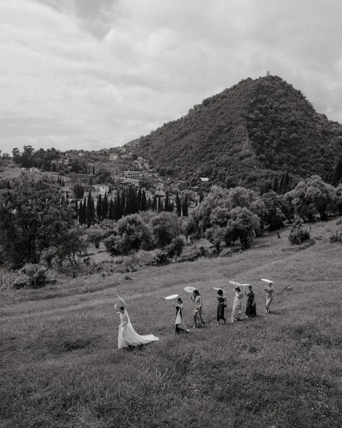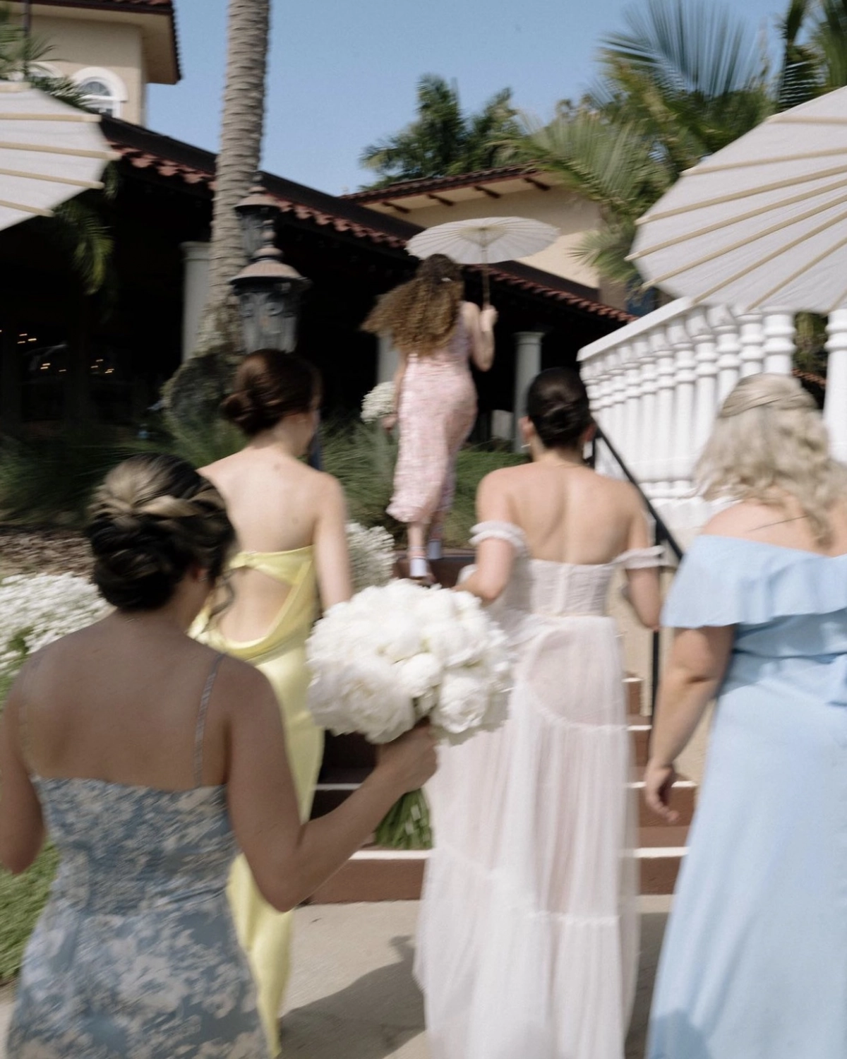 When you have decided on styles and colors, it is also worth thinking about balance. Try not to make it so that out of all the dresses, there is only one short dress, for example. If length plays a role in introducing variety into the styles, it should also be balanced. It is also advisable to make sure that the dresses, even if they are of different styles, have the same vibe and match the general atmosphere of your wedding.