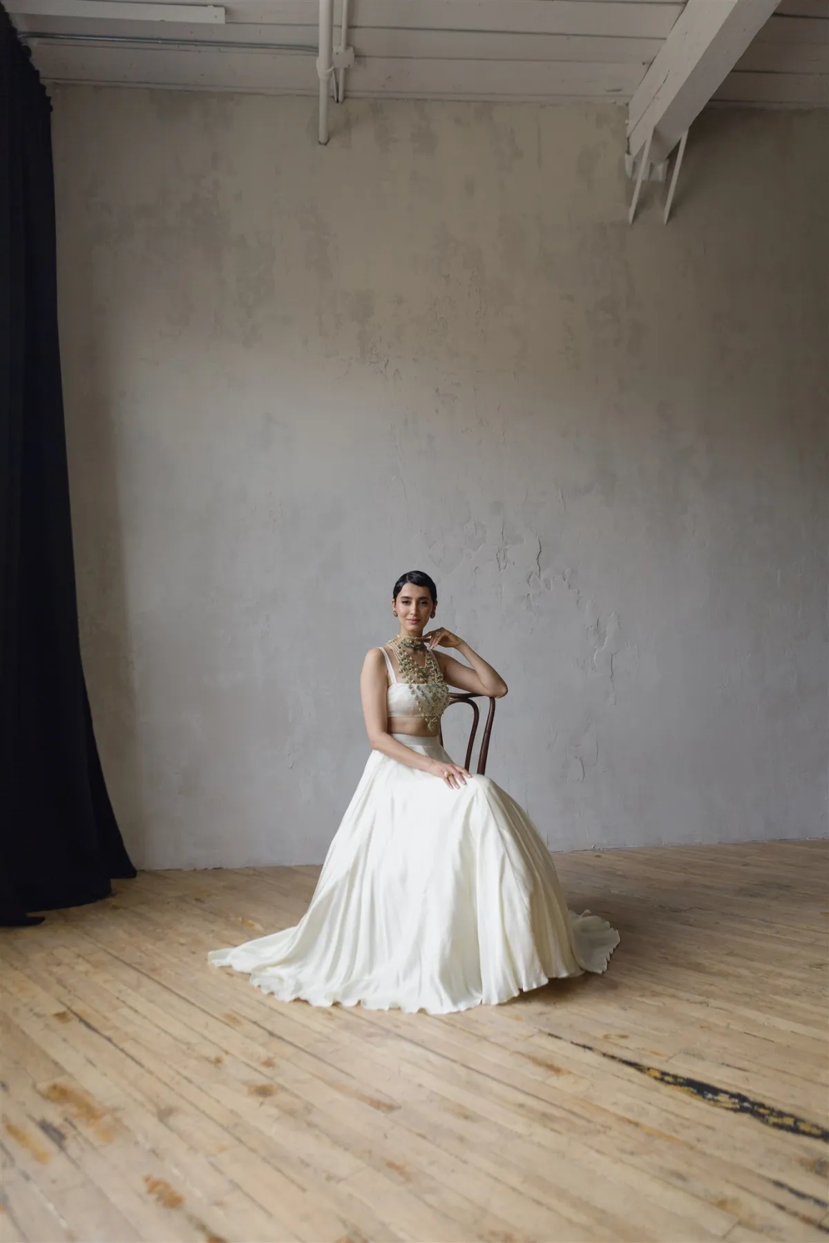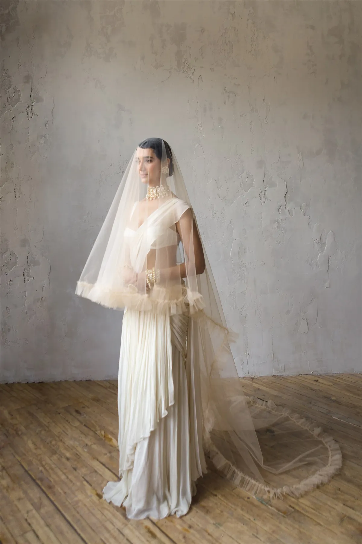 In this shoot captured by Isabella Villani, traditional South Asian bridal looks were transformed with a touch of modernity. The goal was to honor the culture while offering fresh inspiration and simplicity. Stylist Vibi Palaguru paired traditional silhouettes with minimal finishing, replacing traditional headwear with veils, incorporating Mughal and Victorian-style jewelry to add a hint of tradition and old charm. This fusion creates a captivating balance between tradition and modernity, redefining South Asian bridal fashion.