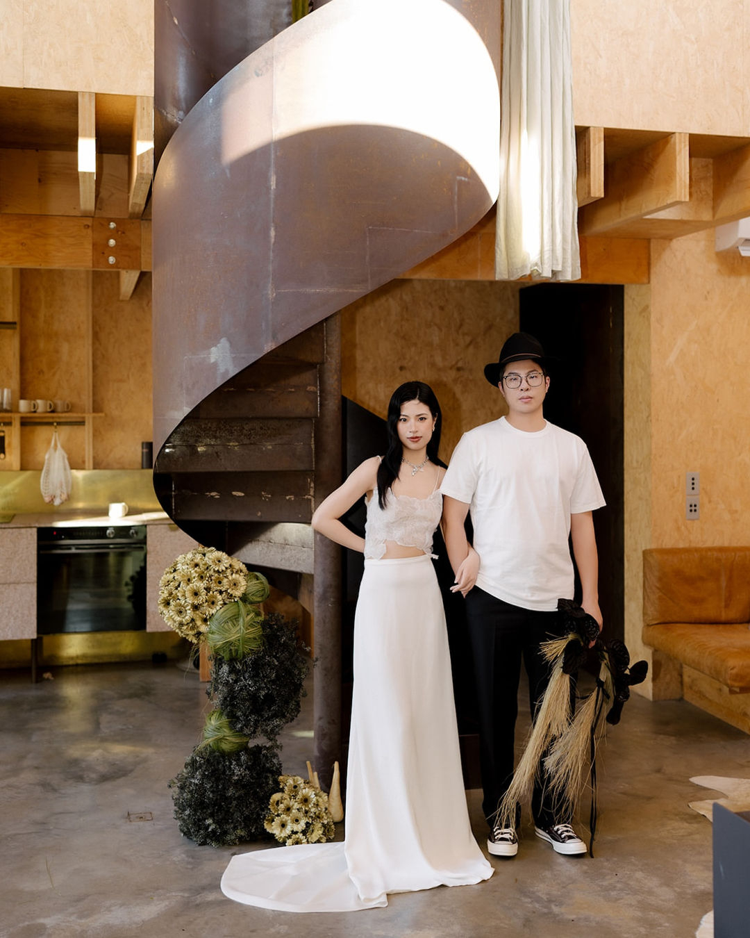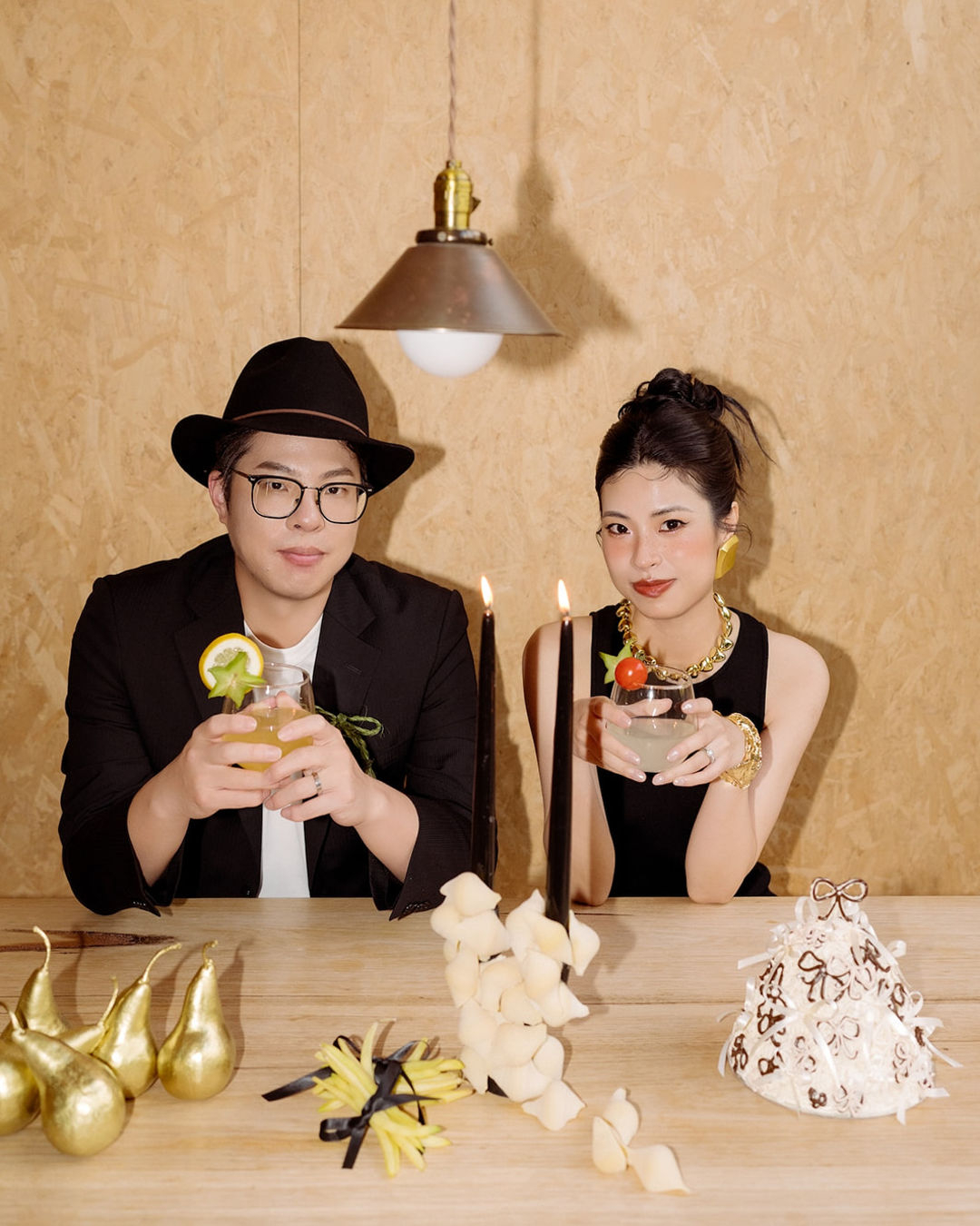 We expanded our attire choices to create various vibes. I selected two gowns from Viktoria Chan, striking the perfect balance between modern and timeless. To add an edgy touch, the black Zara dress caught our eyes and became an instant favorite. For Andy's look, we opted for a relaxed yet effortlessly chic style, complemented by a stylish fedora hat.