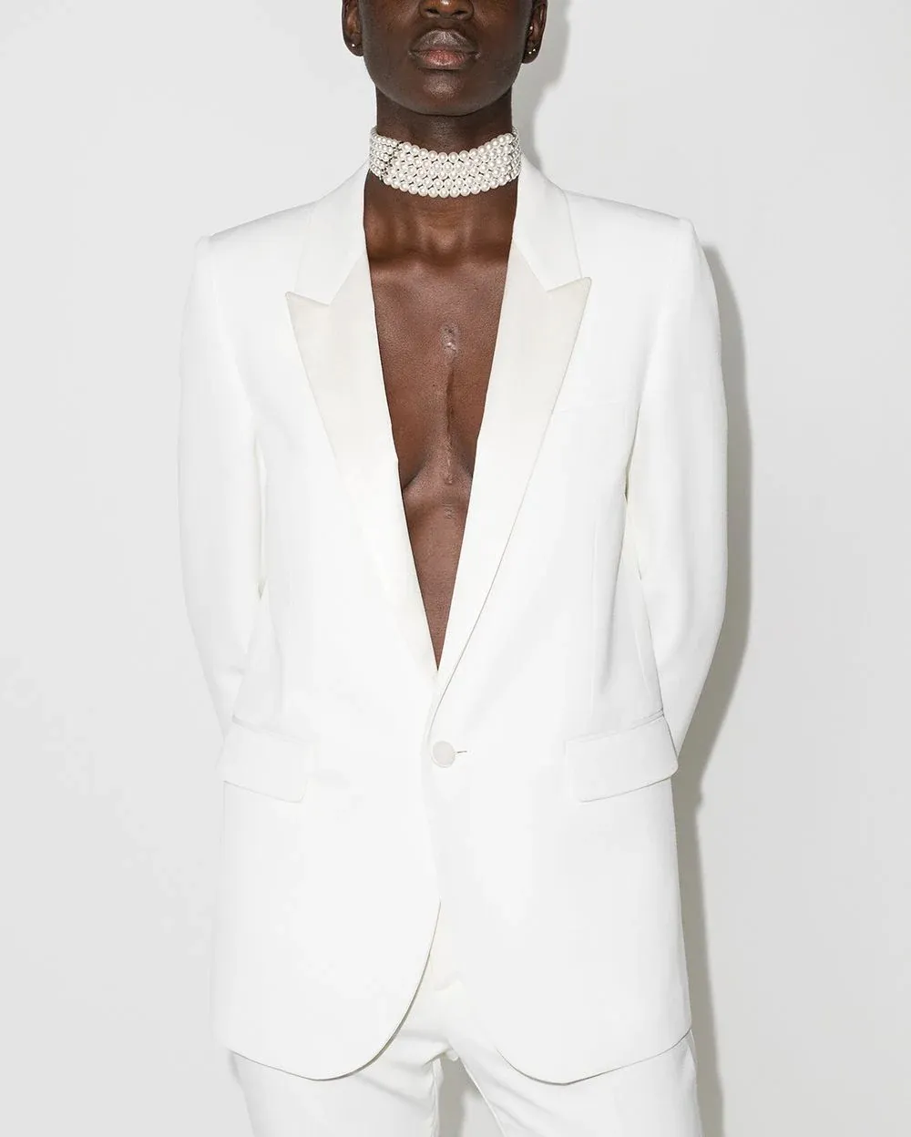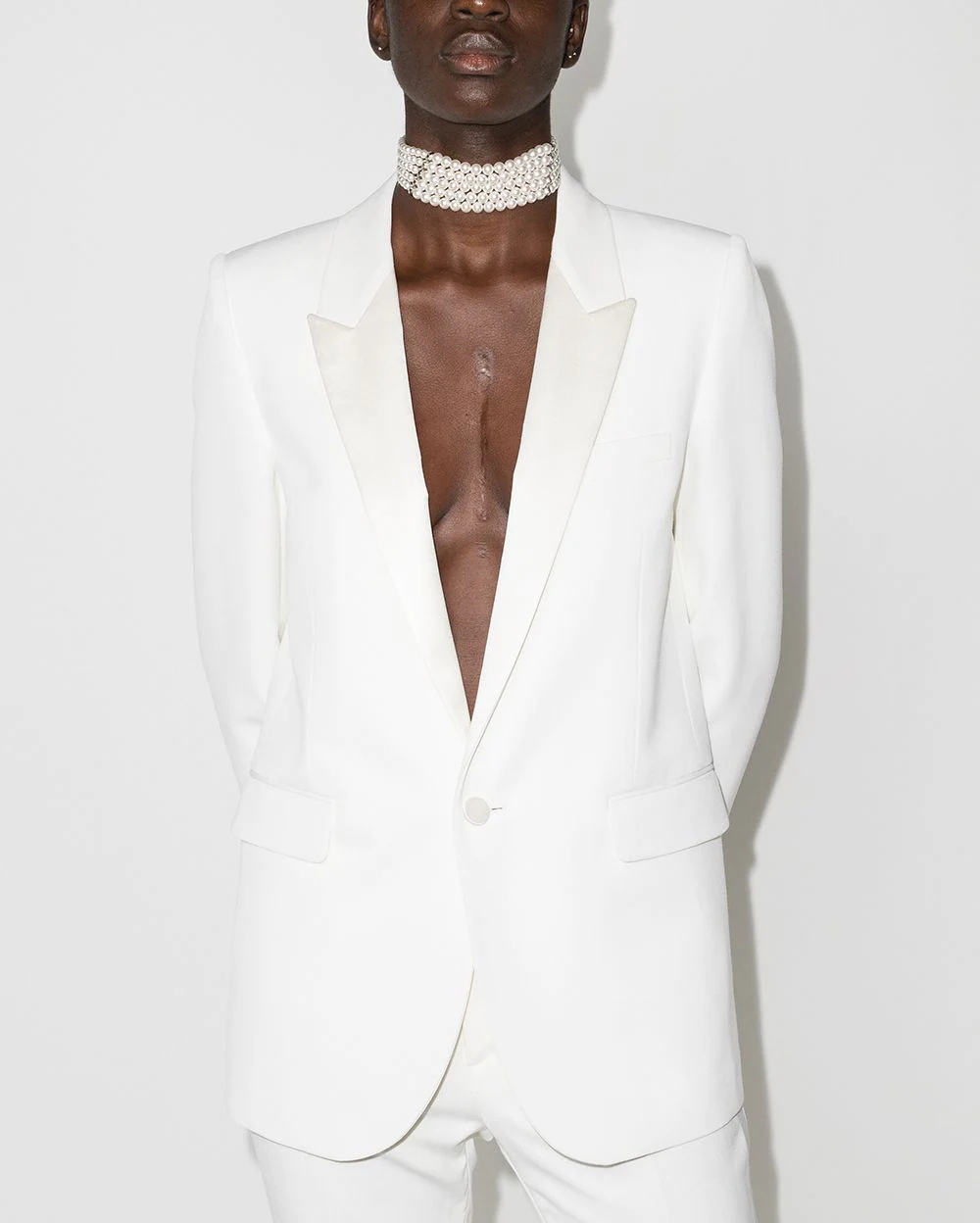 Saint Laurent single-breasted tuxedo ($3,290) & Alexander McQueen mid-rise flared trousers ($870)