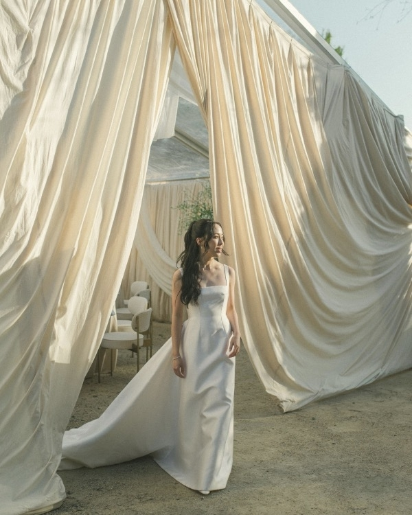 The wedding of content creator Andrea Ricci, and Jarred Reed-Stewart will remain in our hearts for a long time to come. The couple's elegant wedding, which can certainly be called a fairytale, took place at the late 18th century Château Saint-Antoine. The bride selected the Montreal-based Atelier Unttld for her gown, collaborating with the designers to create a stunning silk dress featuring a corset bodice and avant-garde draping at the waist. Paired with a sleek bun and elegant long gloves, her look made a definitive statement on wedding fashion trends. The reception's minimalist decor, with its creamy tablecloths, verdant greenery, and vintage silver candelabras, was nothing short of enchanting.