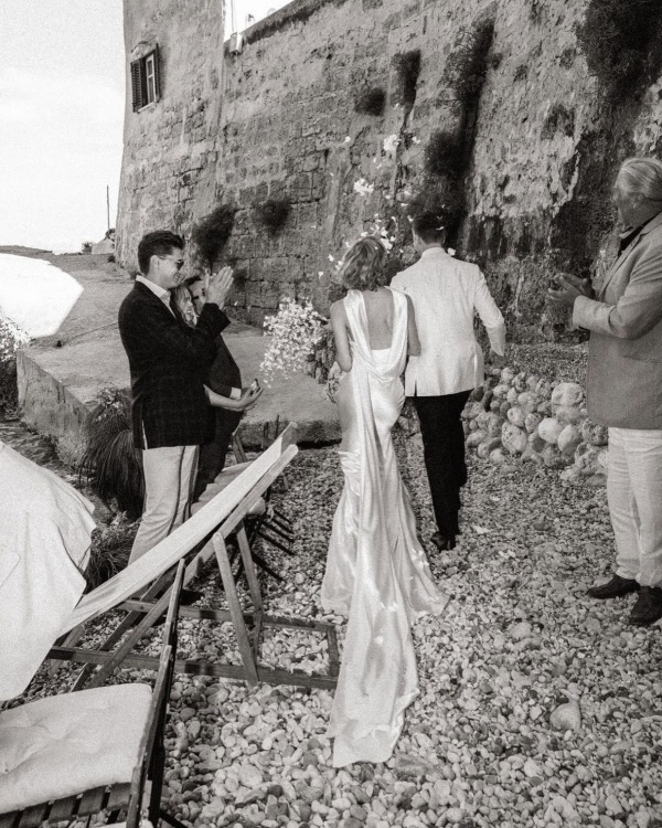This year, actress Millie Bobby Brown and Jake Bongiovi tied the knot in a breathtakingly intimate ceremony set in the heart of Tuscany, Italy. Millie was the picture of grace and sophistication in a custom Galia Lahav gown, adorned with intricate lace detailing, a stunning veil, and a timeless silhouette that radiated elegance. Later in the evening, she captivated guests once more with a dazzling outfit change into a vintage Valentino, featuring a flowing lace skirt and a silk drop-waist bodice. Jake complemented her flawlessly, donning a classic black-and-white Tom Ford suit, exuding timeless refinement. The idyllic Tuscan landscape, coupled with exquisite custom couture and deeply personal moments, created a wedding for the ages.