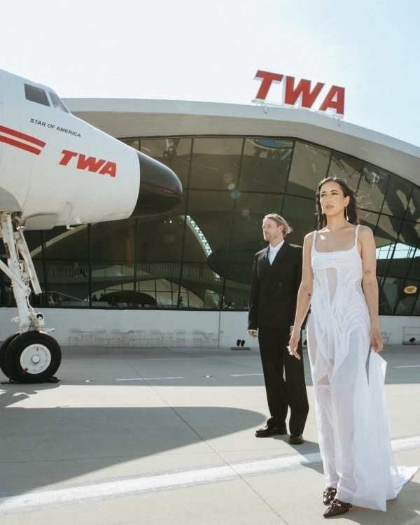An airport wedding – why not? This couple's celebration of love took place at the iconic TWA Hotel at New York’s JFK International Airport. Dressed in a custom Di Petsa gown and trendy oversized suit, Jessica and Joe exchanged vows in a cozy, red cocktail lounge, surrounded by retro decor. As the day transitioned into night, guests enjoyed a reception featuring round tables, artistic centerpieces, red-carpet-lined walls, and futuristic lighting. The photoshoot by the jet plane was a highlight!