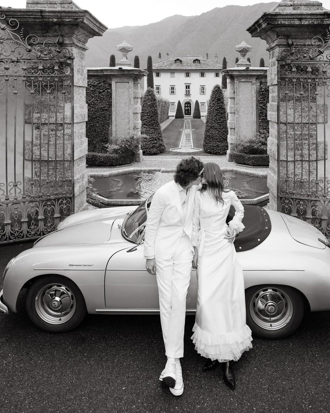Rev up the celebration with timeless portraits in and around a vintage car- complete with “Just Married” signage for that extra touch of sentiment. These nostalgic photos exude a classic appeal reminiscent of old Hollywood. Share a playful peek out the window or lounge back for a stylized snapshot. For the perfect farewell shot, hop onto the rear of an open-top convertible, letting the moment transport you to the spotlight of your own romantic film.