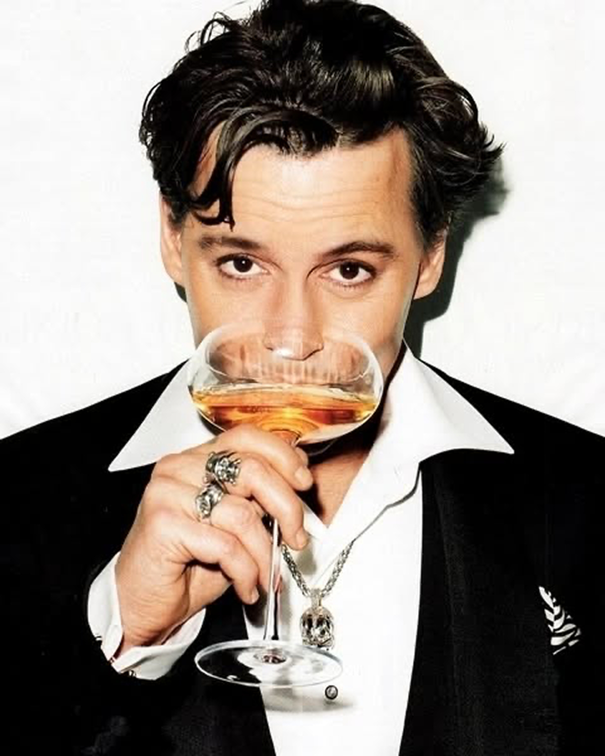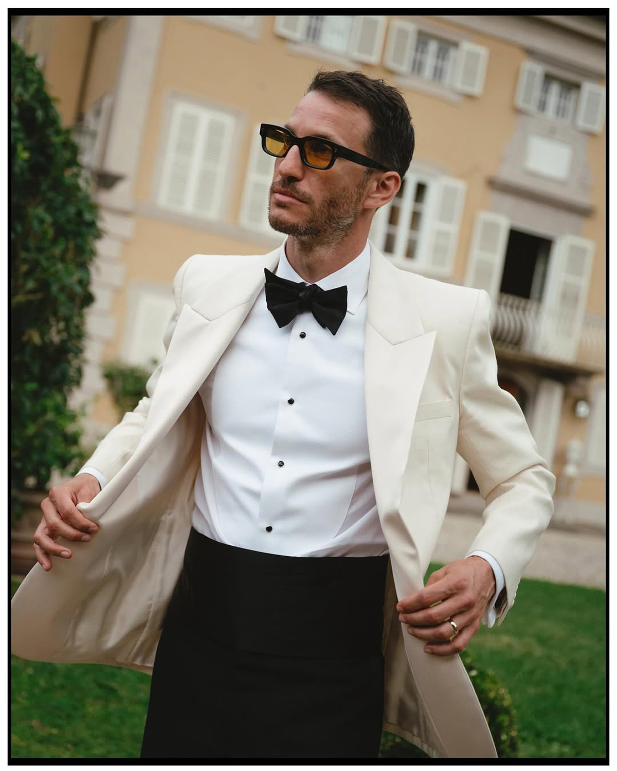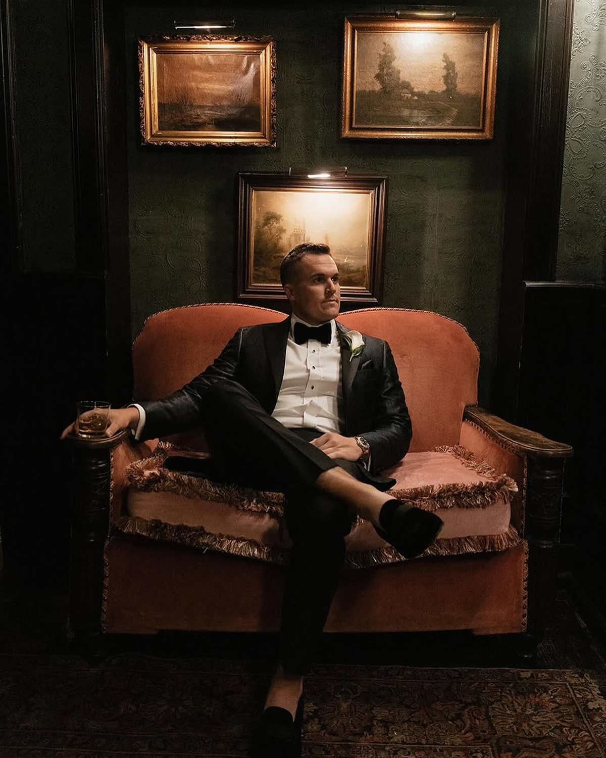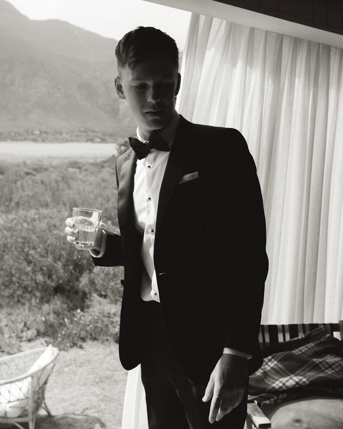A drink in hand and a smile on his face—this is a moment worth capturing. Perhaps it’s a quiet sip of whiskey or a bubbly-filled toast, either way it signals that the celebration has begun. It’s a charming, lived-in portrait that feels both sophisticated and spontaneous.