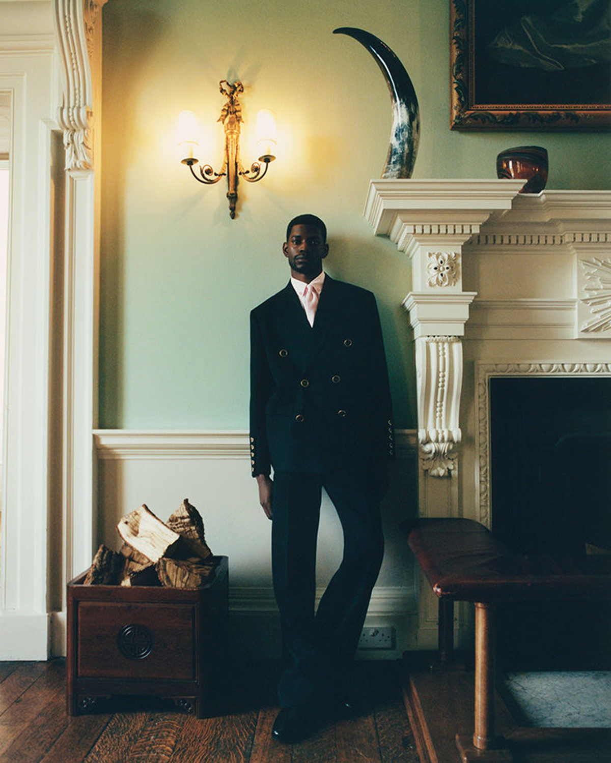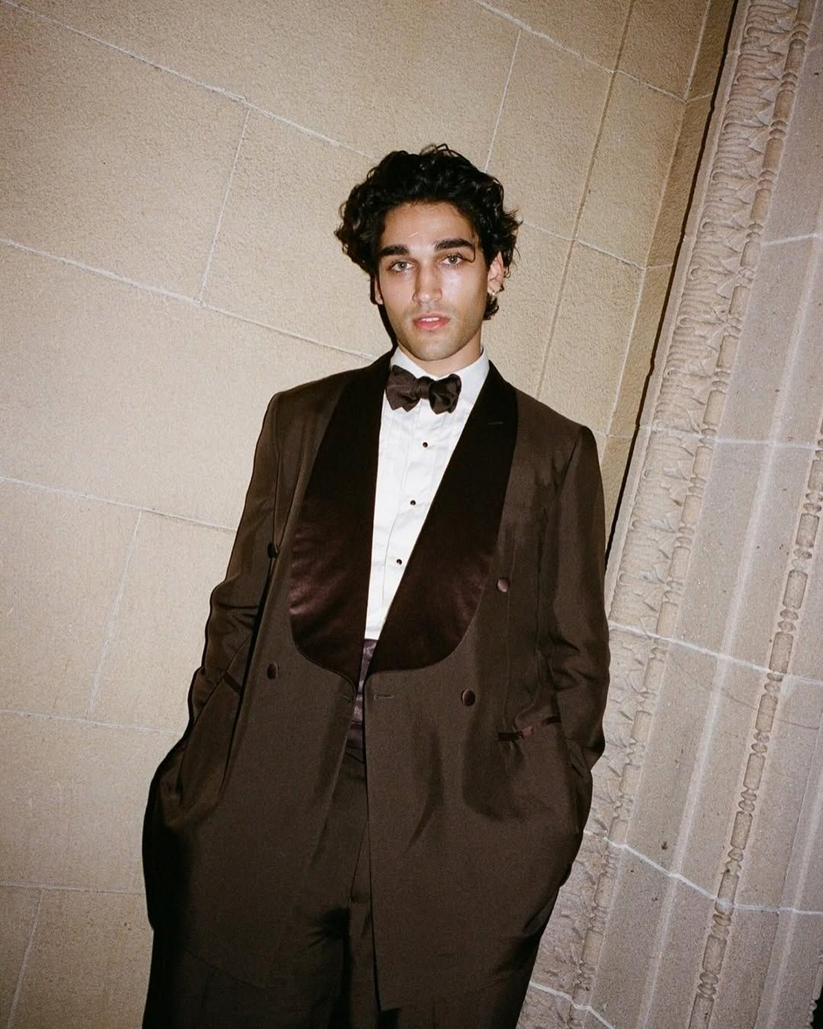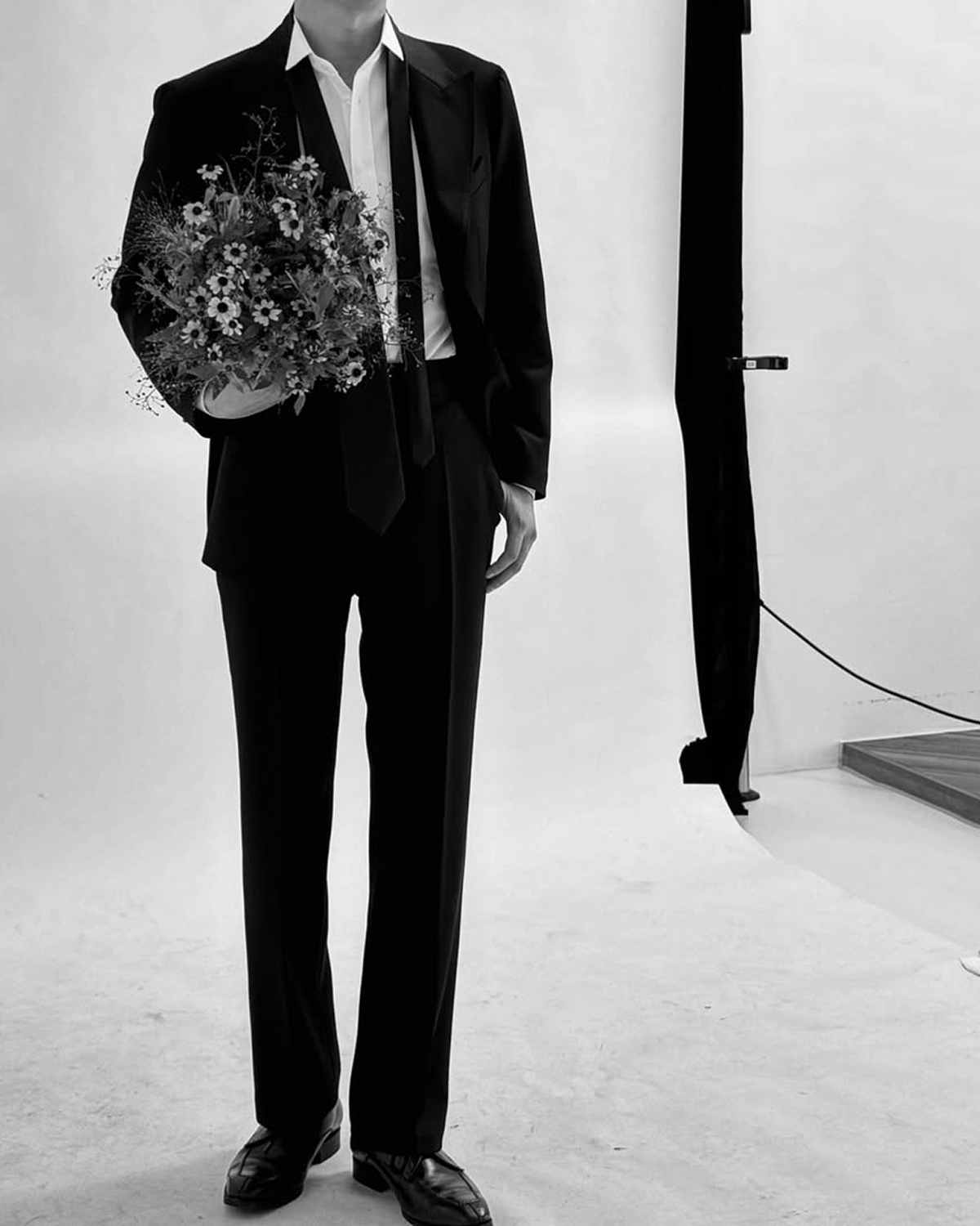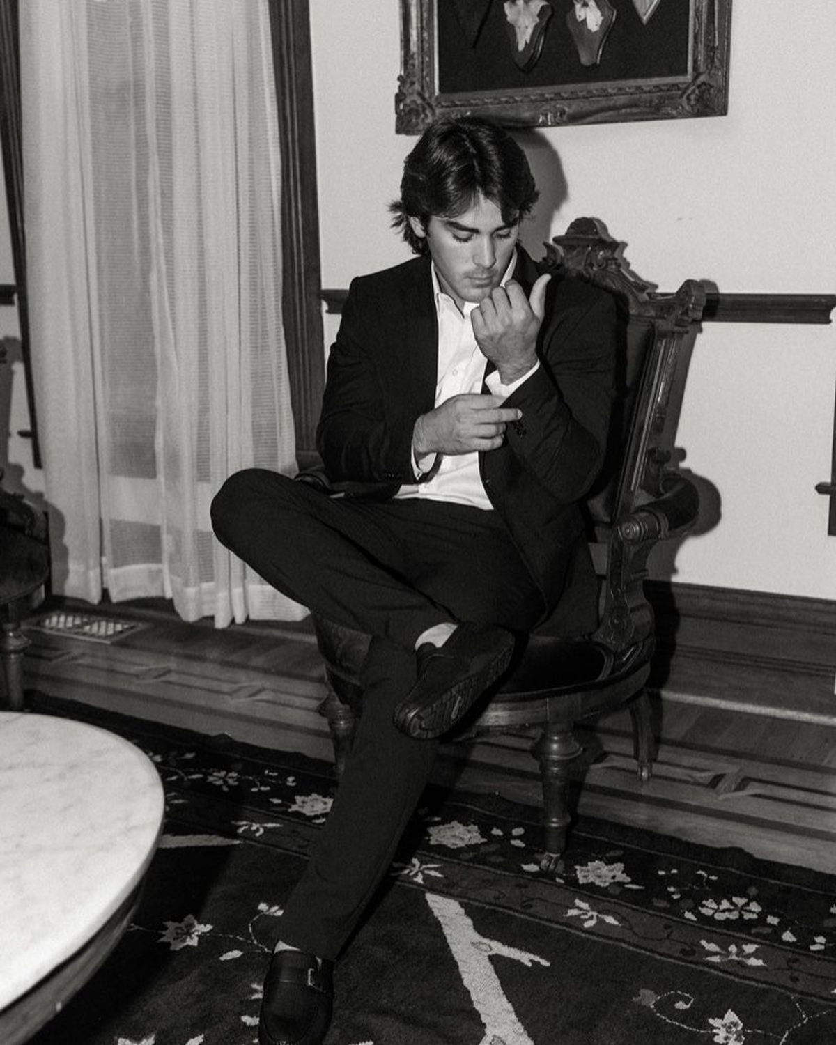 A drink in hand and a smile on his face—this is a moment worth capturing. Perhaps it’s a quiet sip of whiskey or a bubbly-filled toast, either way it signals that the celebration has begun. It’s a charming, lived-in portrait that feels both sophisticated and spontaneous.