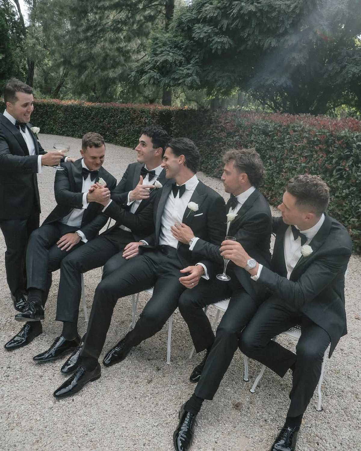 Place the groom in the middle of his groomsmen for a dynamic, editorial-style portrait. Whether it's a candid moment or all posing seriously, the symmetry and energy of this setup always delivers. It’s a visual way to celebrate friendship and support while giving the groom his spotlight moment.