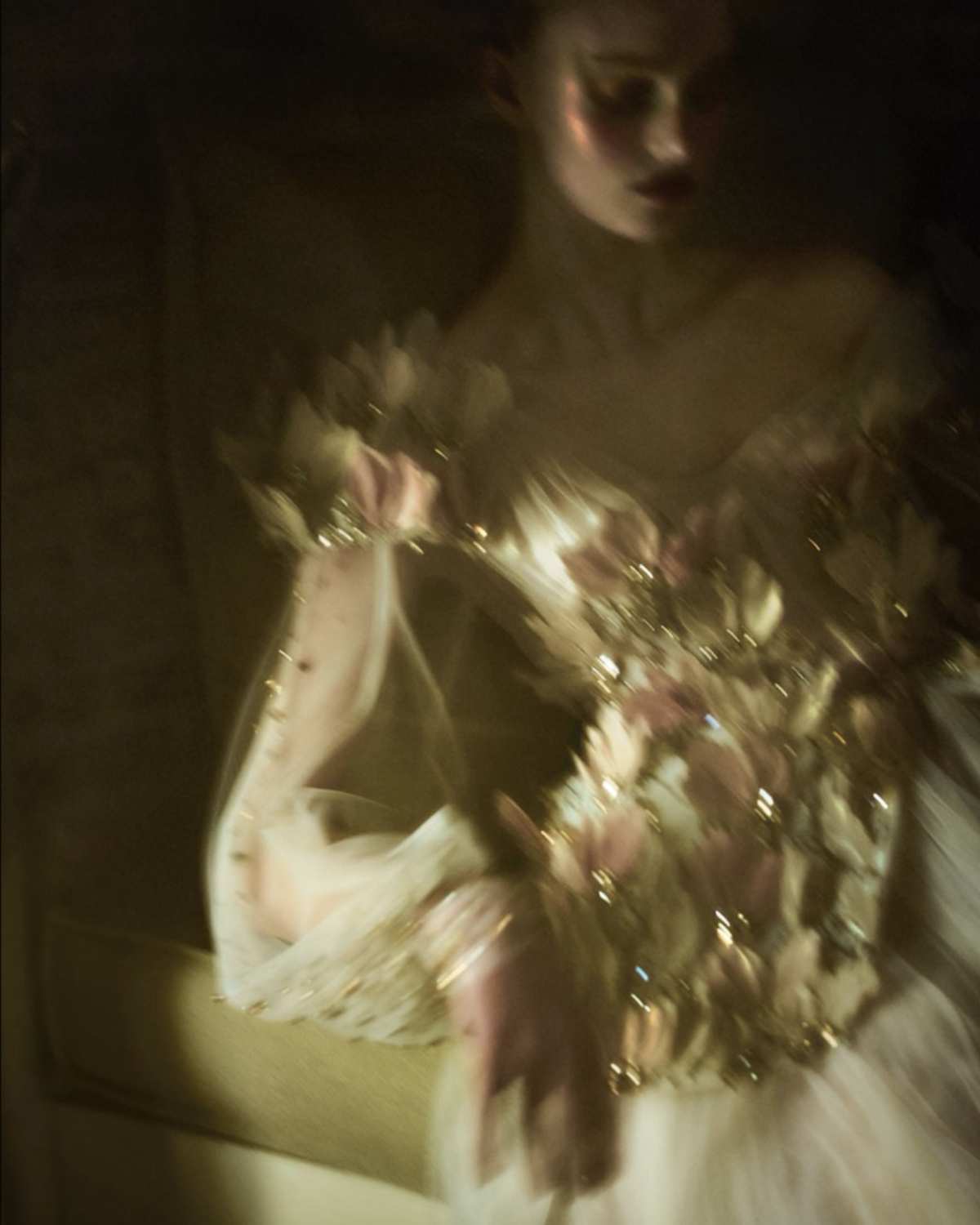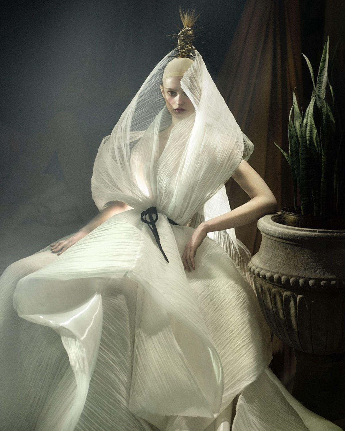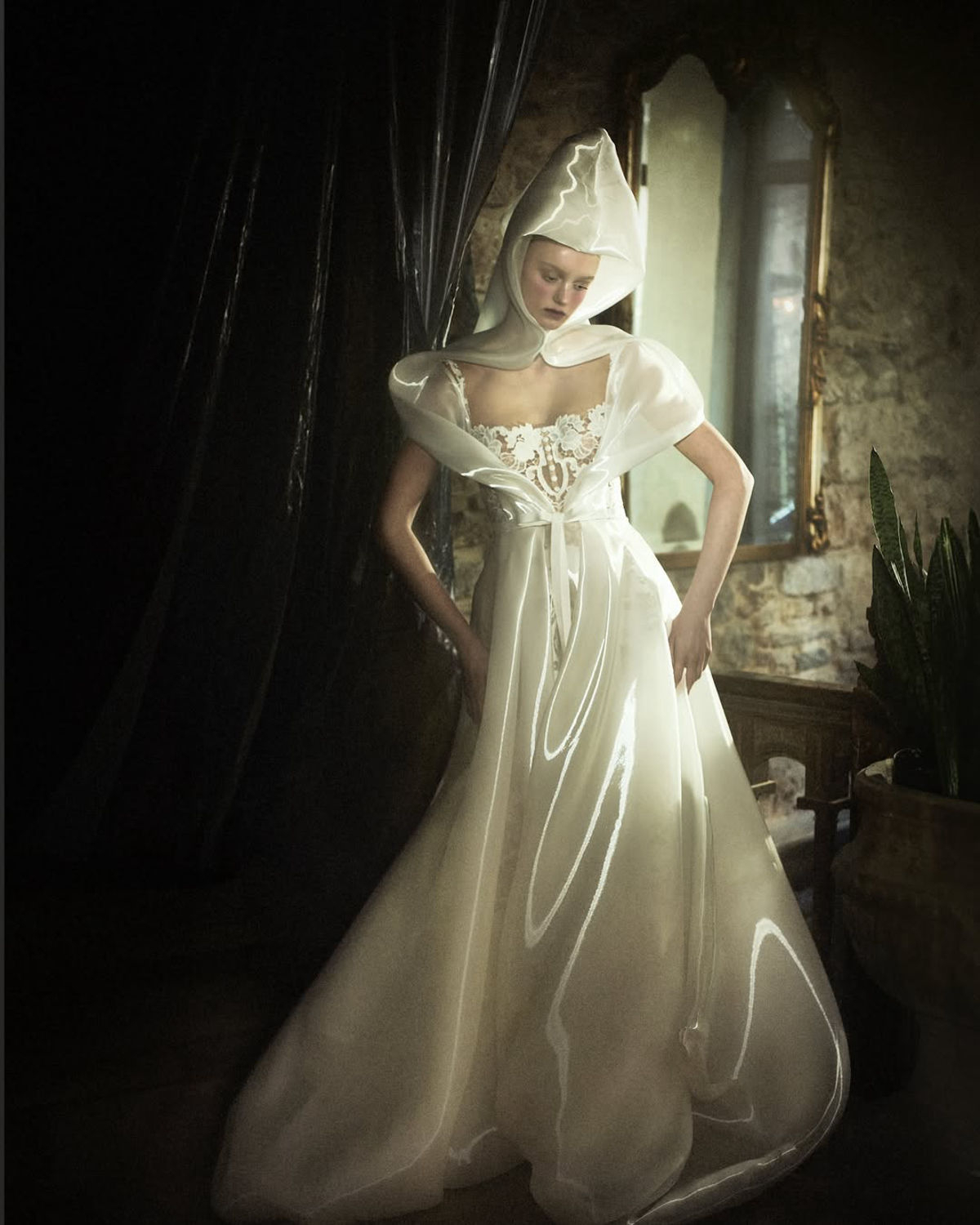 Like a wildflower blooming in forgotten corners, the bride appears not in the spotlight, but in shadows, reflections, and flickers of movement—her presence subtle, but the garments unmistakable. In this moody, cinematic light, each piece is allowed to speak for itself: the sculptural pleats, the sheer veils, the textural layers that shift and shimmer with every step. The styling doesn’t demand attention—it draws you in.